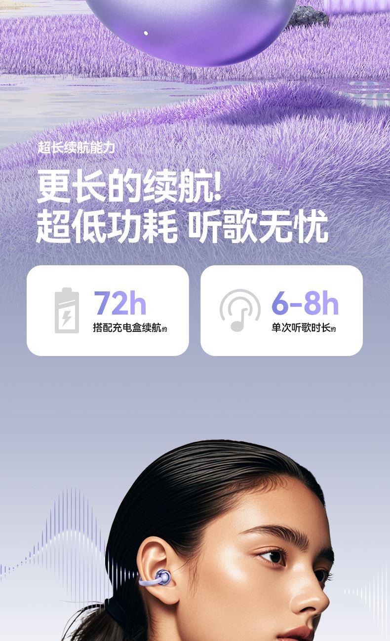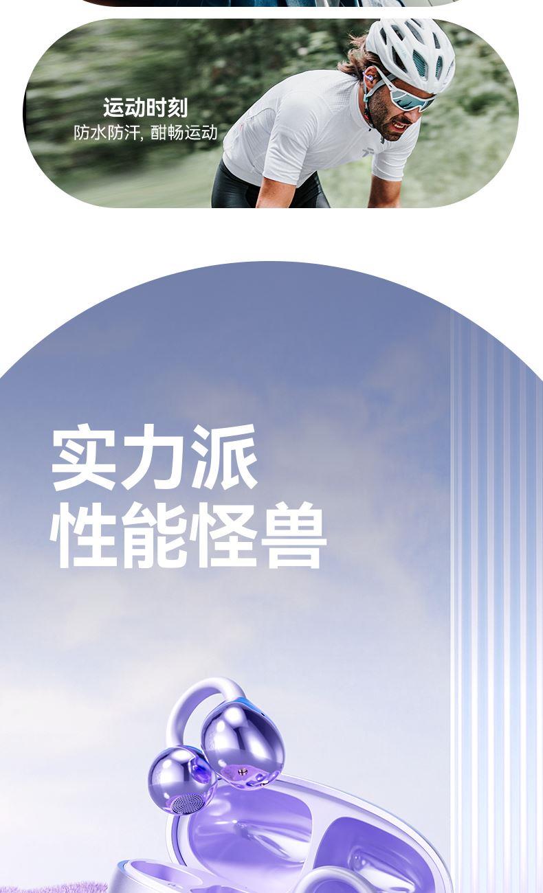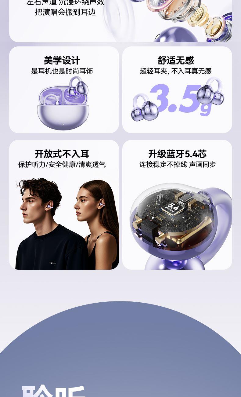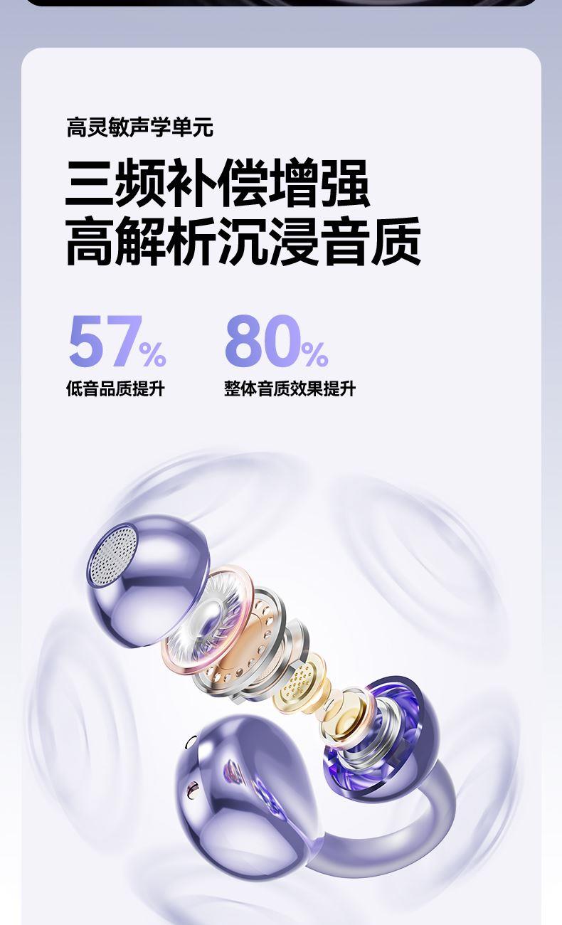 产品规格:6.4*5.1*3cm 产品净重:48g 材 料:ABS 产品颜色:黑色 紫色 肤色 使用时间:2-3小时 连接距离:10m 耳机容量:30mAh 电池容量:230mAh 充电电压:5V 产品特点: 智能指纹触控 触控随心 超轻耳夹 不入耳 真无感 人体工学设计 三角稳固不掉 蓝牙5.4强大内芯 稳定不断连