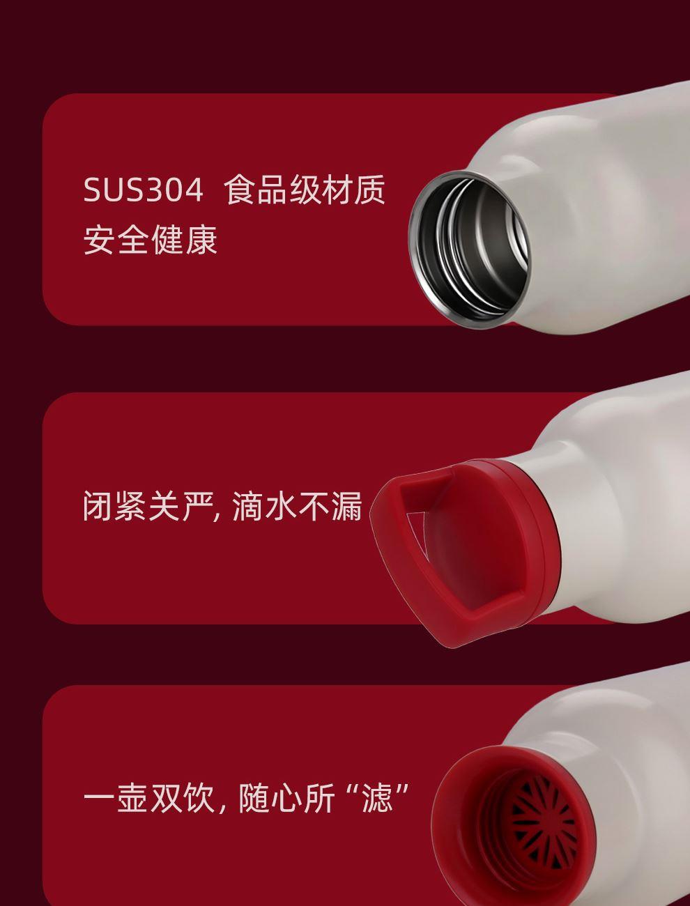 产品容量:530ml 产品材质:杯身:内外304不锈钢;杯盖:PP;密封圈:硅橡胶 1、超窄杯体,塞进单车水壶架/健身包侧袋不晃荡; 2、旋盖×茶隔×手提三合一,满足饮水多种需求; 3、304内胆,拒绝运动后补水异味残留; 5、越野级密封圈,山地车颠簸路段/健身房甩战绳0渗漏。