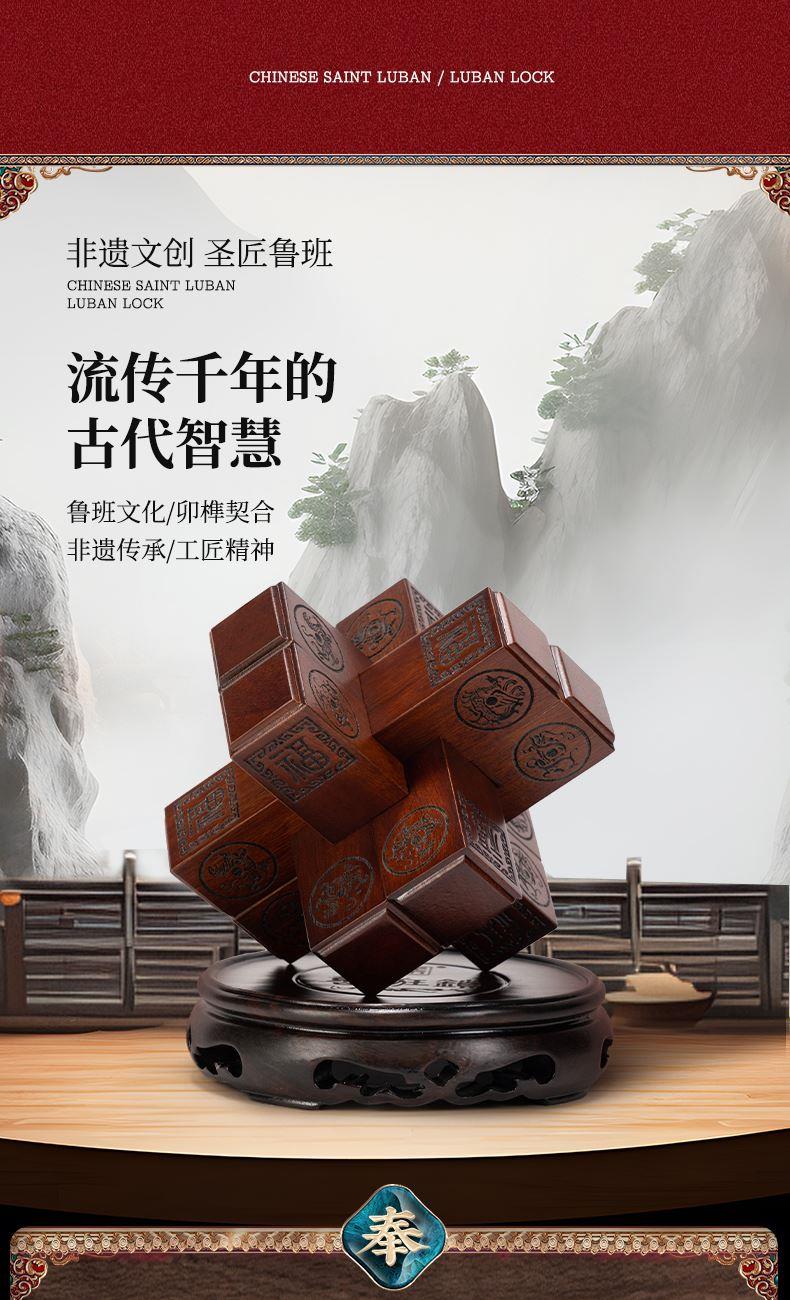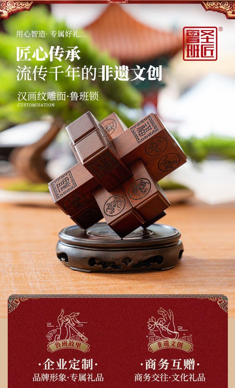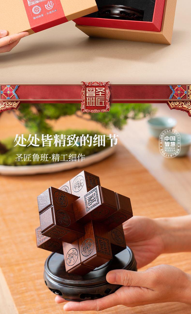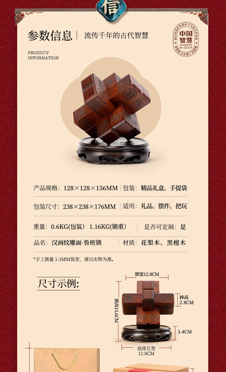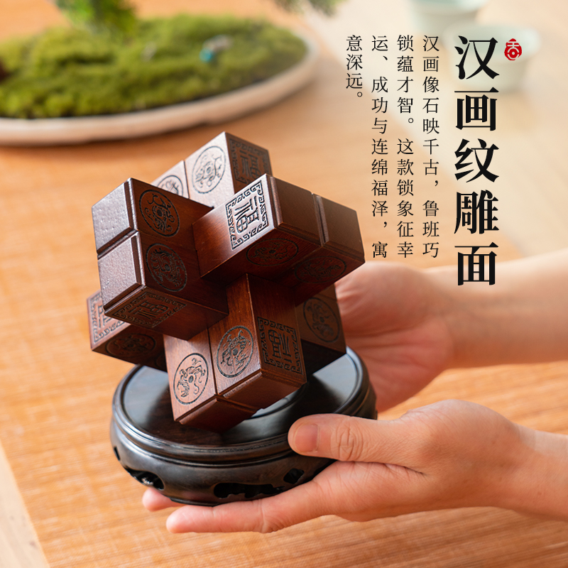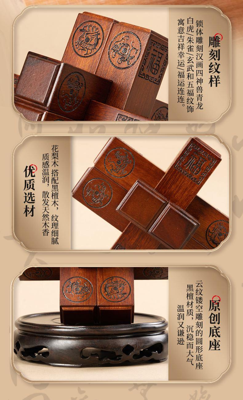 汉画像石映千古,鲁班巧锁蕴才智。这款汉画纹雕刻鲁班锁沿袭传统六棒结构,精选花梨木锁体,配以黑檀木底座,质地高雅,色泽古雅。采用激光雕刻技艺,巧妙融合汉画像石中四神兽——青龙、白虎、朱雀、玄武及五福图腾,象征幸运、成功与连绵福泽,寓意深远。汉画像石之古朴,与鲁班锁之精巧,相得益彰。置于案头,既能彰显主人高雅品味,又能镇宅纳福,实为收藏与赠礼之佳选,意义非凡。