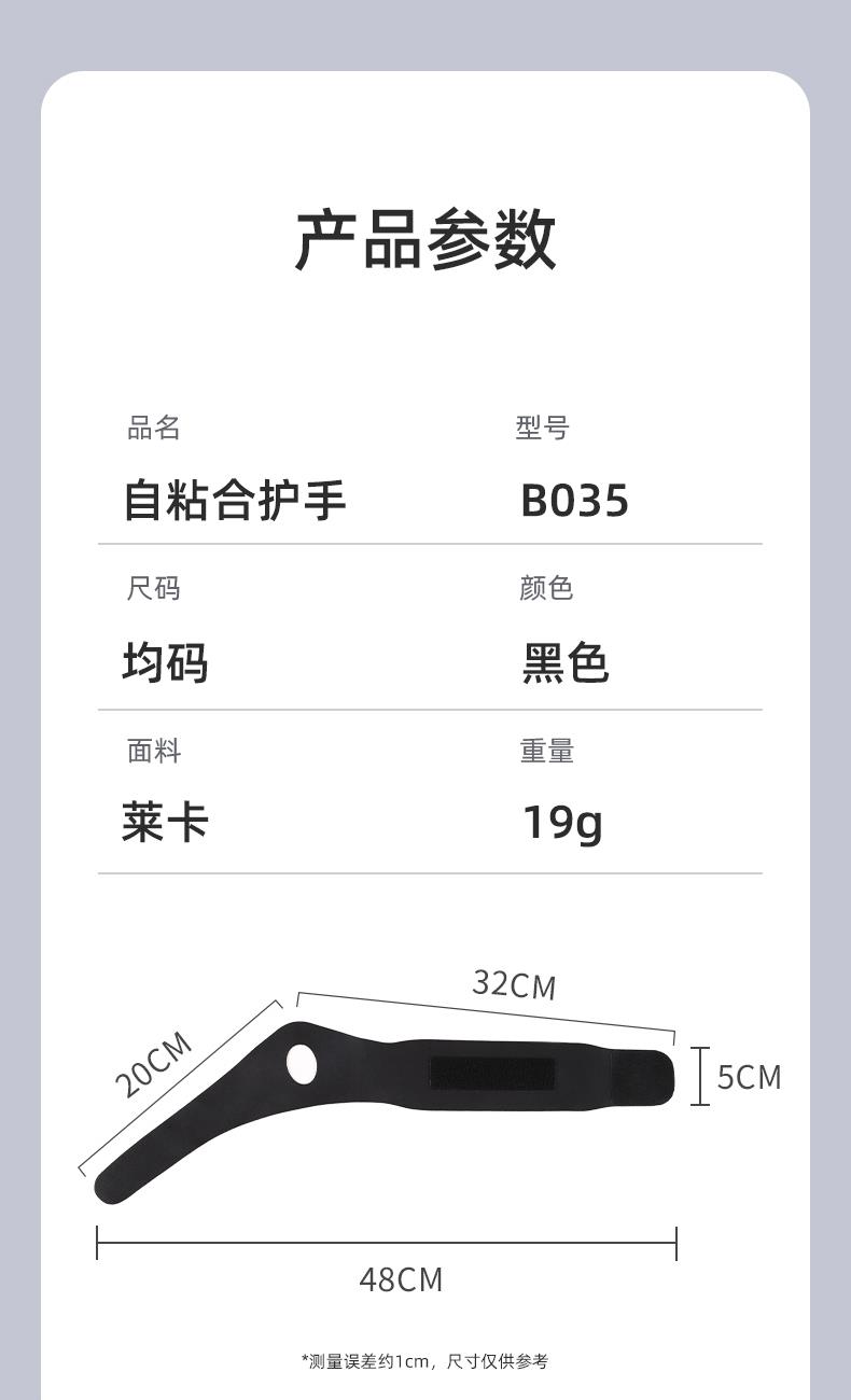 材质 高弹可粘材料 颜色 魔力黑 尺寸 46cm 重量 0.05kg 自粘OK布,均码护手方便实用,适合日常防护和小伤口护理自粘设计无需胶带,轻松贴合手部,粘性适中不伤皮肤 弹性均码适应不同手型,透气舒适,活动时不易脱落 无论是居家、办公还是户外,都能提供便捷有效的保护