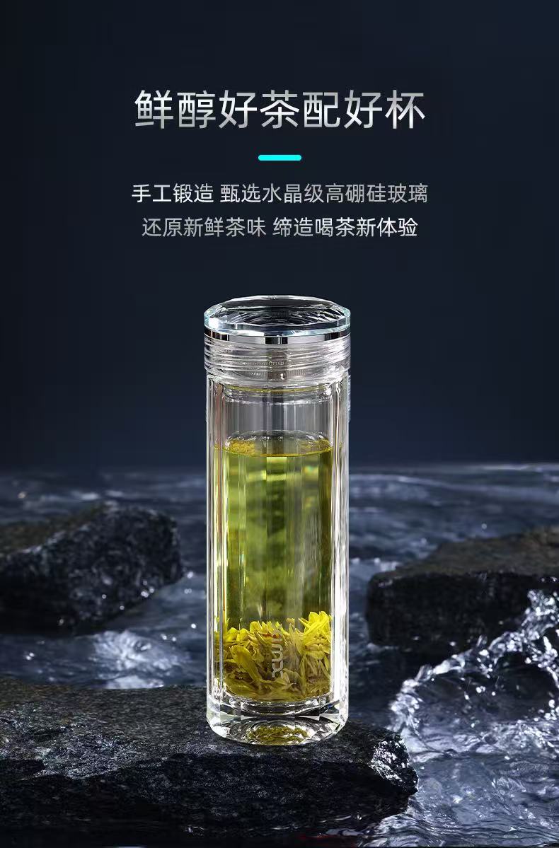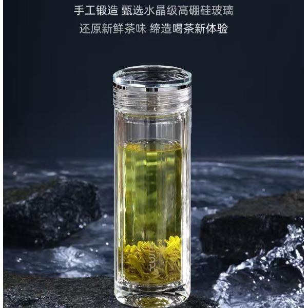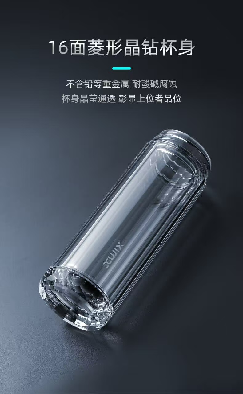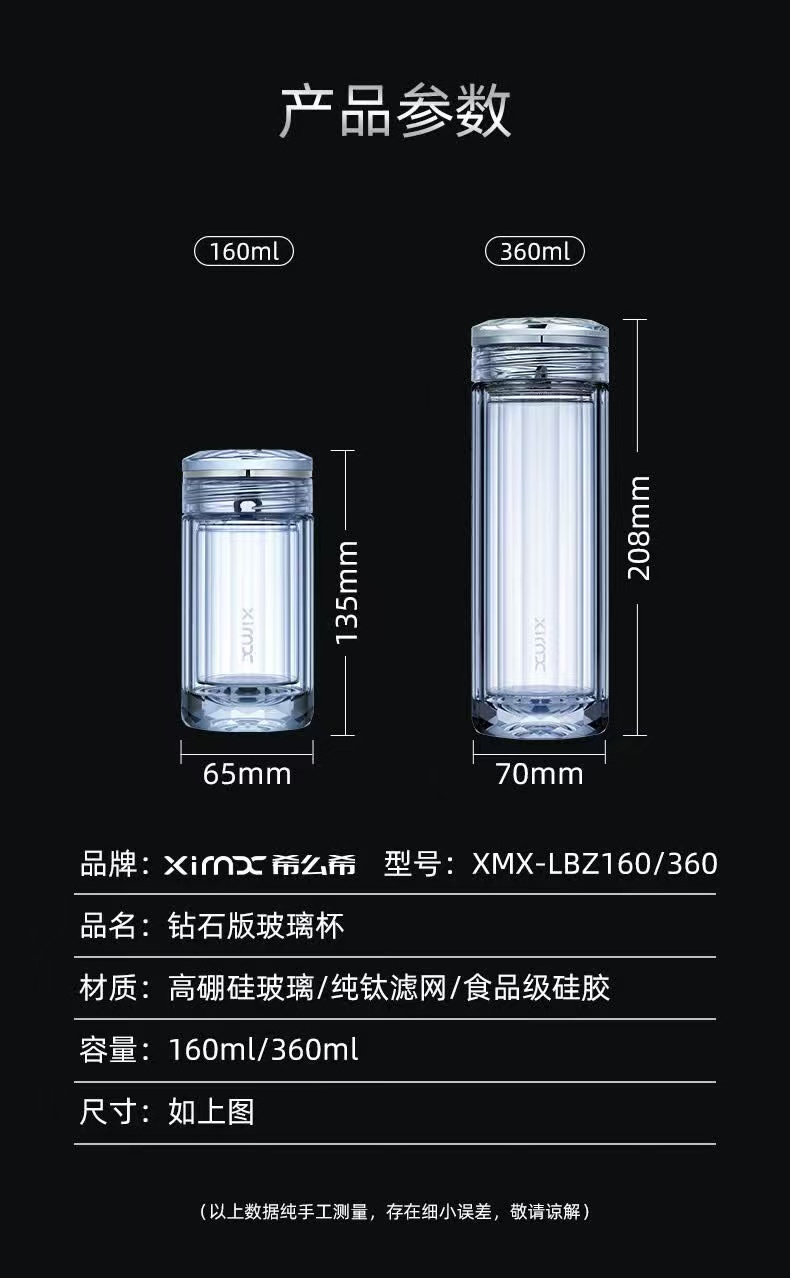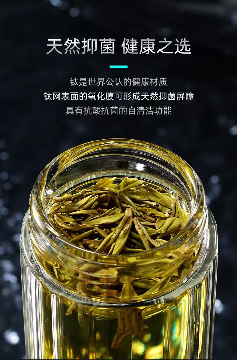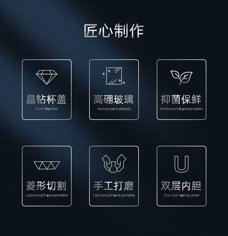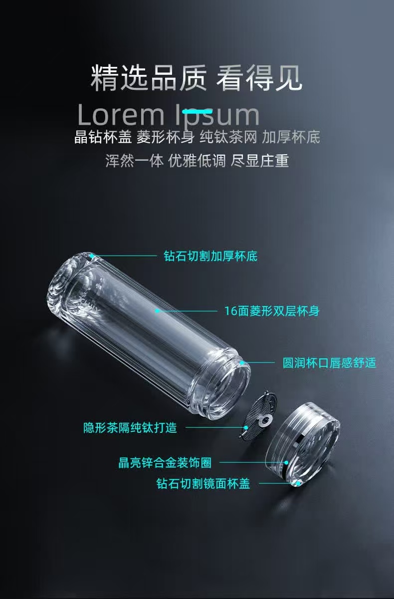 产品材质:钛+高硼硅玻璃 杯身样式:直身杯 产品容量:200ml/320ML/360ML 产品尺寸:65*200mm 颜色分类:本色 高颜值,晶钻杯盖,高硼硅玻璃,保鲜,菱形切割,纯手工打磨,双层内胆,带茶水分隔,携带方便,适用于多种场合
