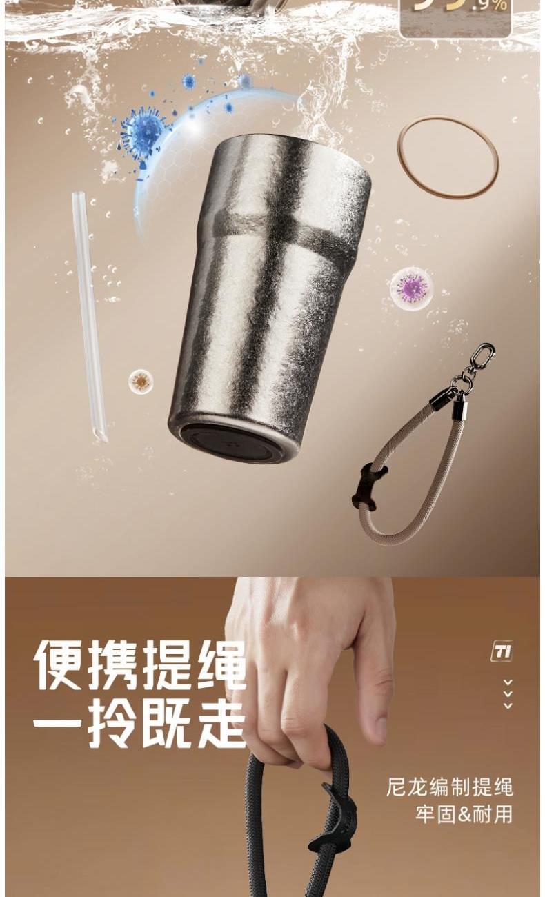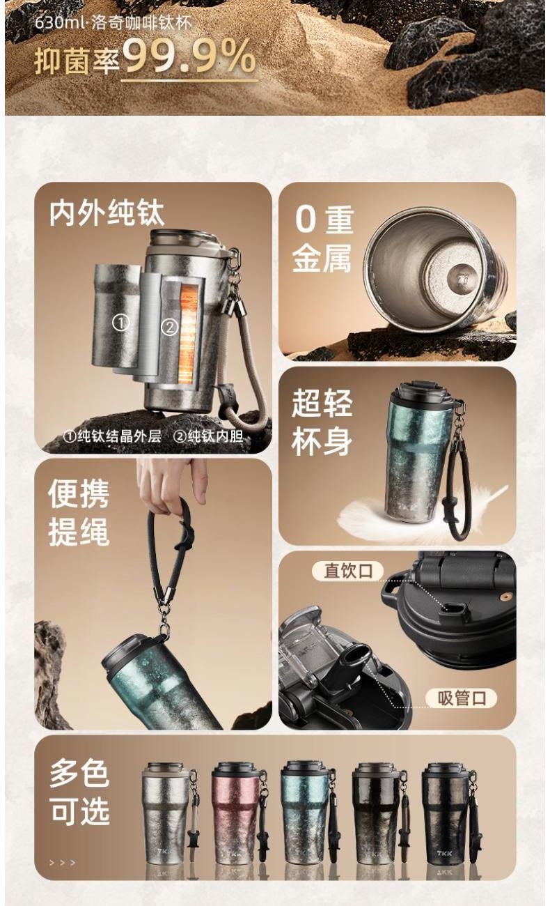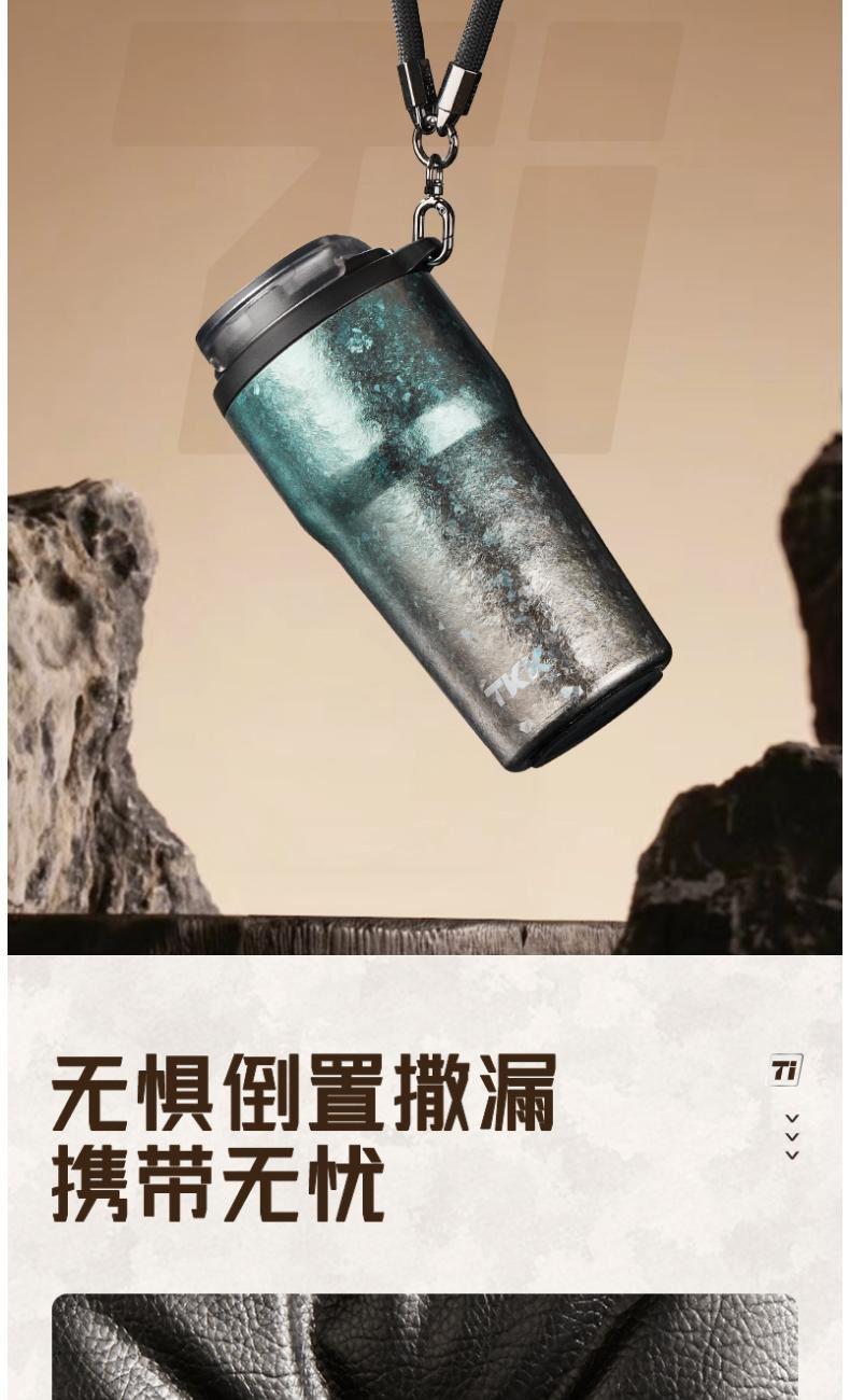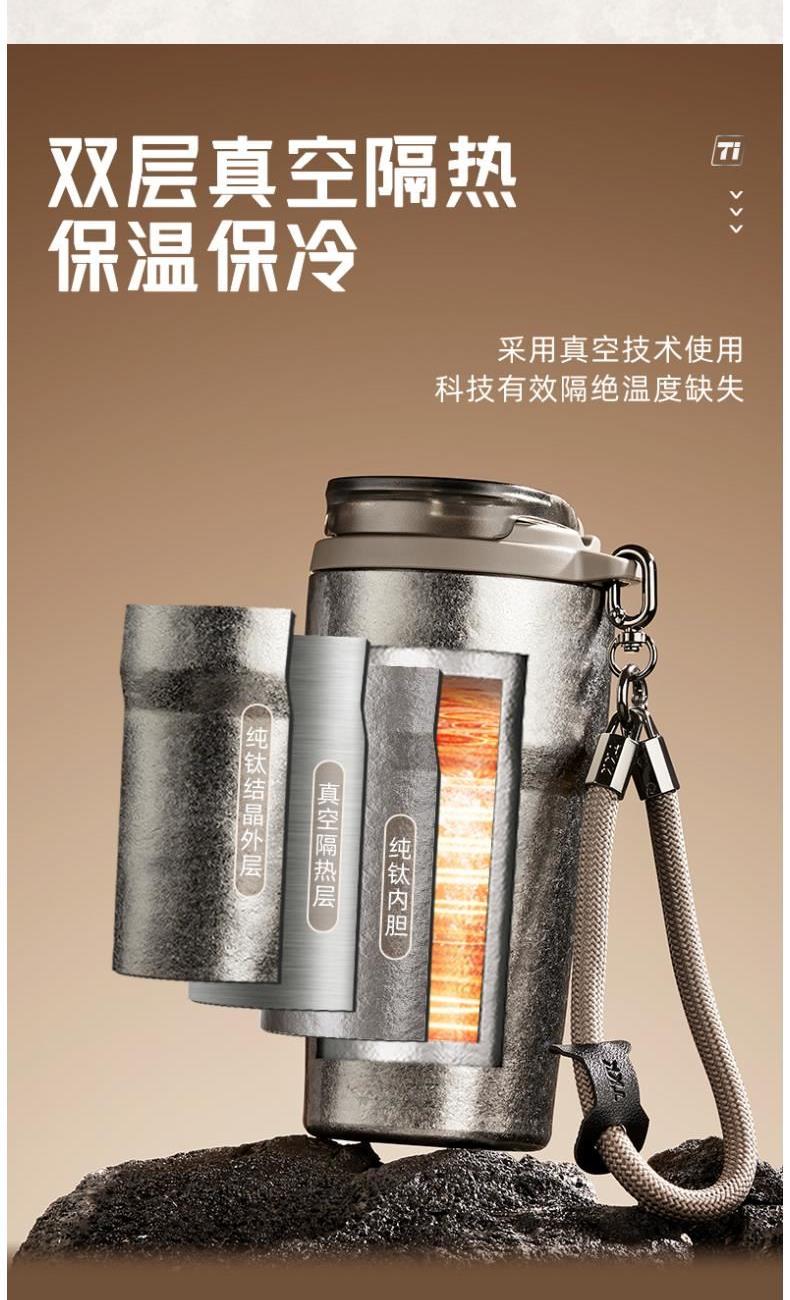 商品容量:630ml 杯身材质:钛 商品净重:335G 商品尺寸:9.8x9.1x18.9cm 1、内胆采用黑科技钛,无异味,耐高温,耐腐蚀;健康无味,喝水更放心 2、保温又保冷锁定咖饮温度 3、 一盖双饮,一杯双用,三种饮用模式:直饮,吸管,敞口随意切换 4、360度密封不易漏,紧锁每一滴水,无惧翻转摇晃,安心随行 5、便携车载,旅程陪伴,单手开盖更加便捷,小口饮用不易洒 ★ 品质做工精细,专注更好的饮水体验:如密封硅胶圈,双重密封不怕漏 ★ 杯身磨砂亲肤手感,耐脏易清洁;顺滑杯口,316杯口安全无异味 ★ 杯底硅胶防滑垫,放置稳固,玻璃大理石桌面悄然无声 ★ 手提挂绳设计,出行随手提起更加便捷
