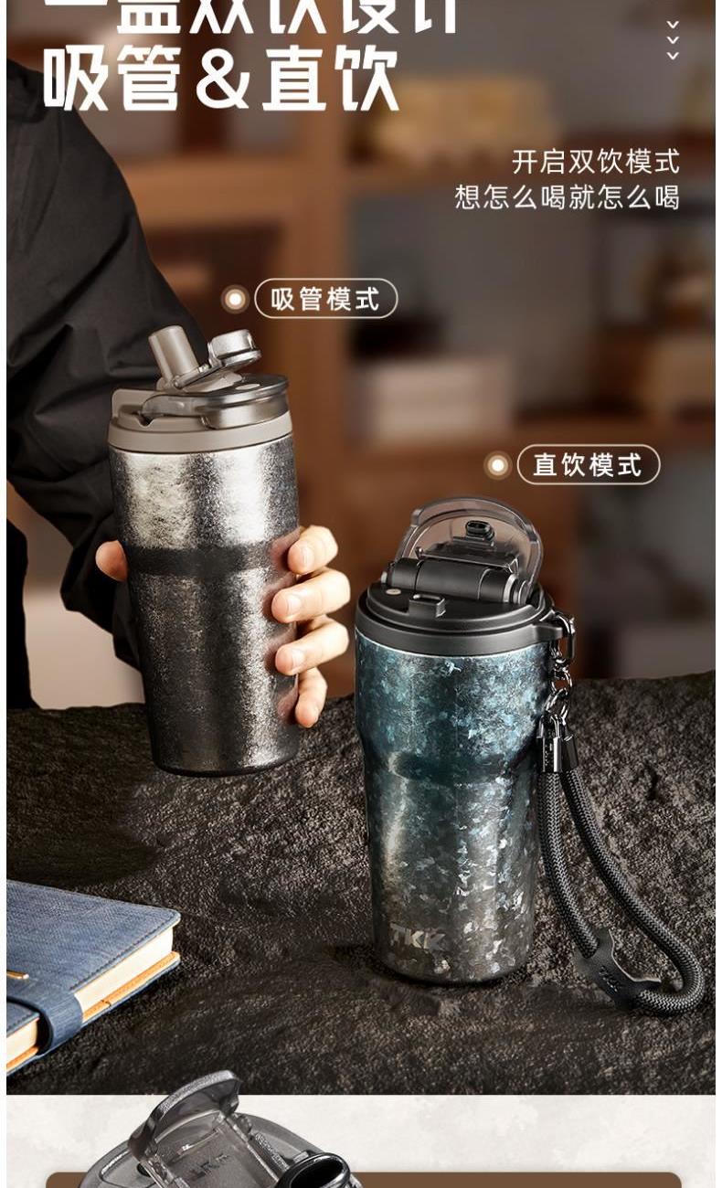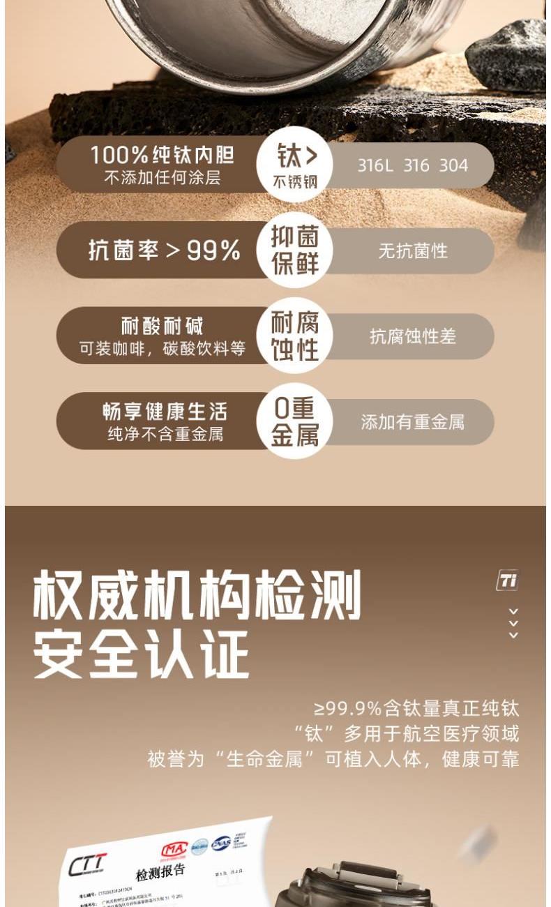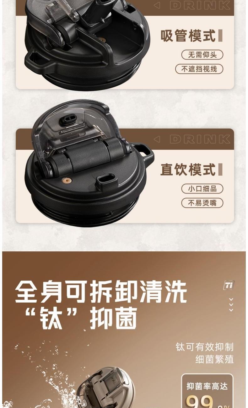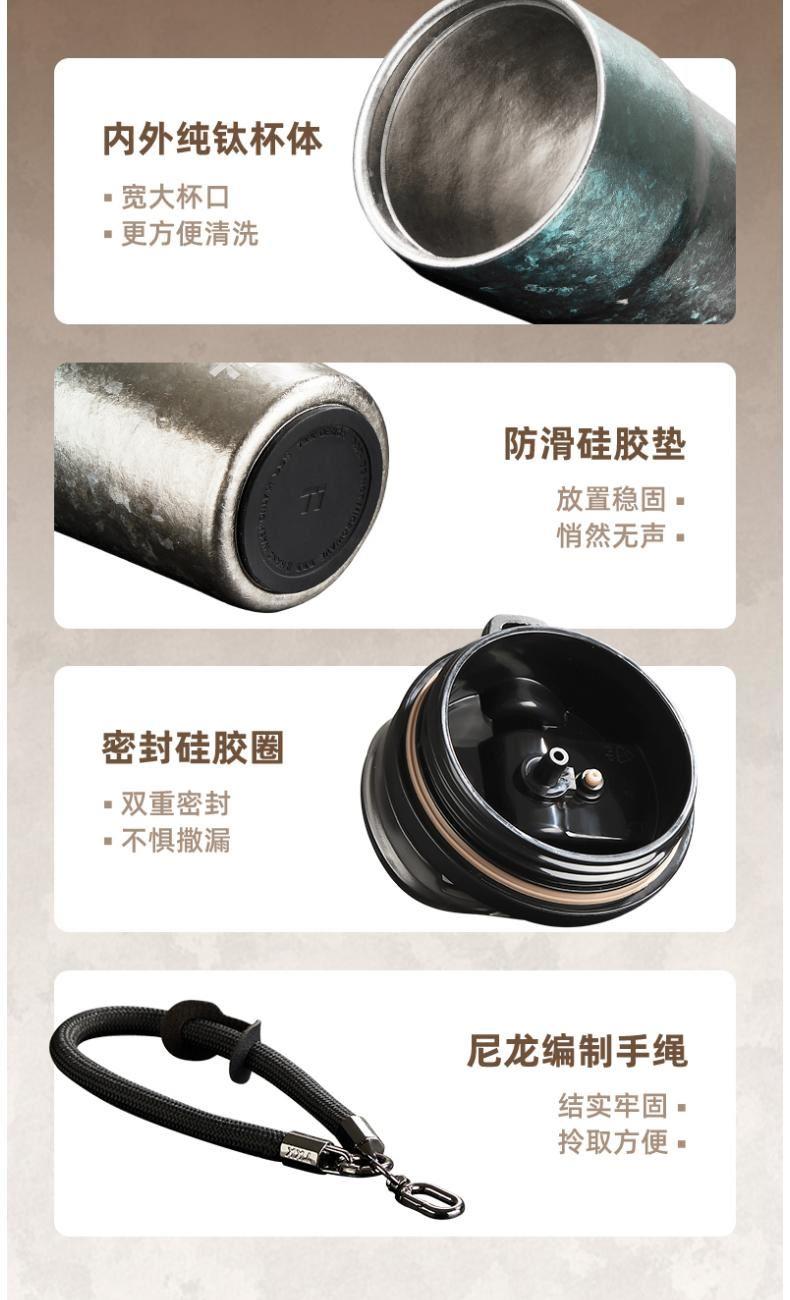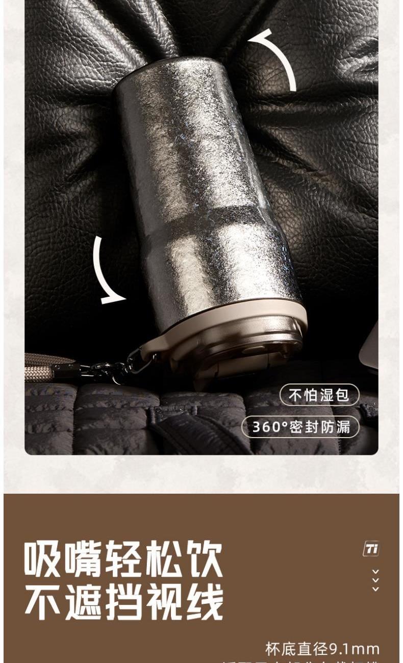 商品容量:630ml 杯身材质:钛 商品净重:335G 商品尺寸:9.8x9.1x18.9cm 1、内胆采用黑科技钛,无异味,耐高温,耐腐蚀;健康无味,喝水更放心 2、保温又保冷锁定咖饮温度 3、 一盖双饮,一杯双用,三种饮用模式:直饮,吸管,敞口随意切换 4、360度密封不易漏,紧锁每一滴水,无惧翻转摇晃,安心随行 5、便携车载,旅程陪伴,单手开盖更加便捷,小口饮用不易洒 ★ 品质做工精细,专注更好的饮水体验:如密封硅胶圈,双重密封不怕漏 ★ 杯身磨砂亲肤手感,耐脏易清洁;顺滑杯口,316杯口安全无异味 ★ 杯底硅胶防滑垫,放置稳固,玻璃大理石桌面悄然无声 ★ 手提挂绳设计,出行随手提起更加便捷