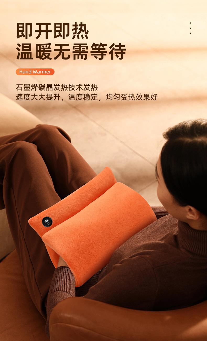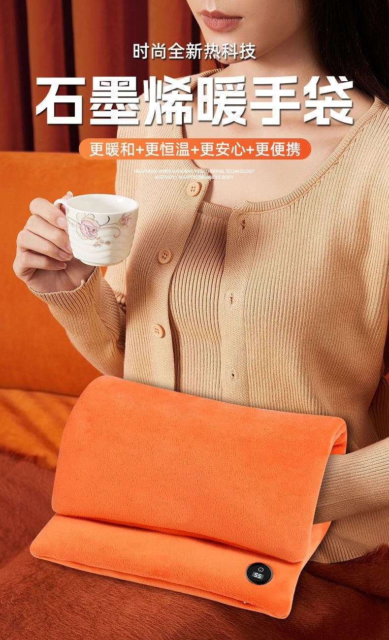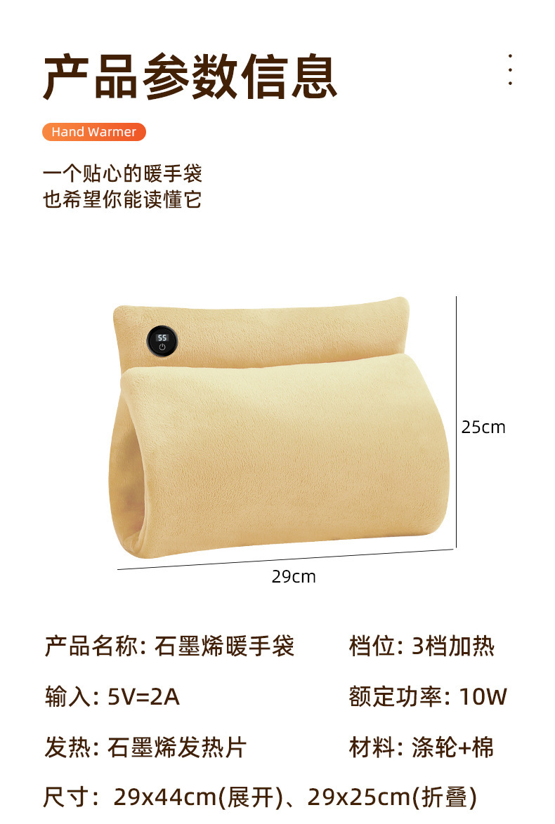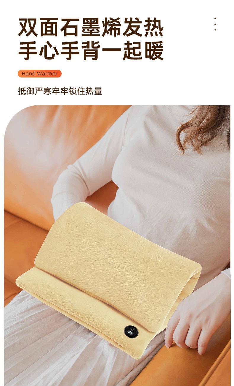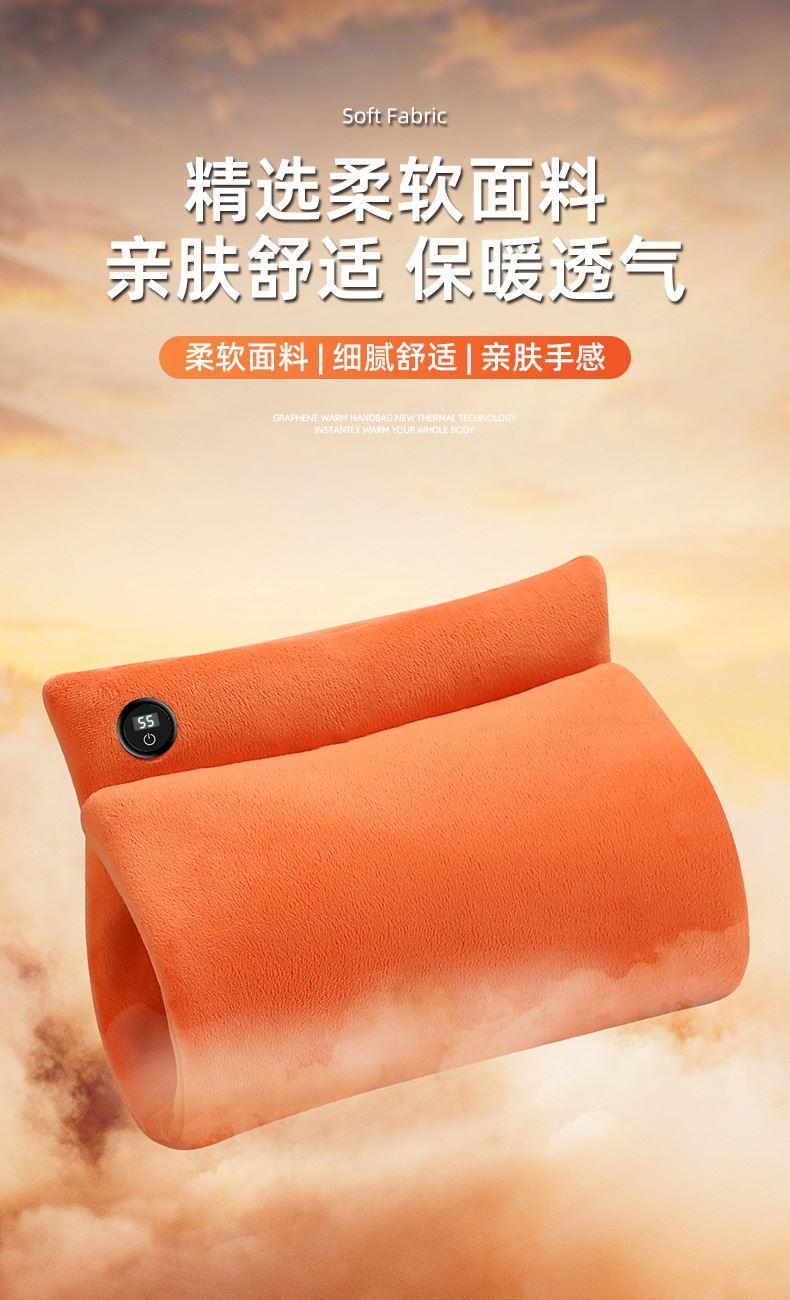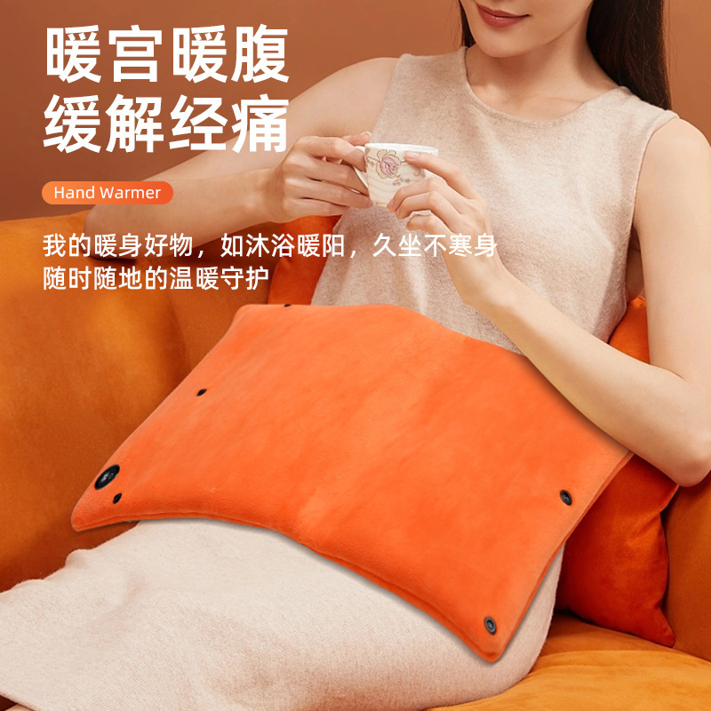 "额定电压:USB5V 产品重量:350g 产品尺寸:23.5*3*24cm 包装尺寸:31*5*26cm 外箱尺寸:80*54*68.6cm/60个/21.6kg 产品颜色:橙色、灰色、咖色 产品标配:彩盒、主机、说明书" "大面积双面发热,石墨烯发热片3秒速热 USB插电使用,可用移动电源,旅行、外出皆可使用 三档发热,AI温控,防过载、防过温、防短路 可展开设计,一袋多用,暖手、暖腹、暖腰、暖背 柔软面料,亲肤舒适,保暖透气"