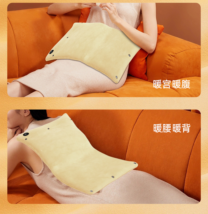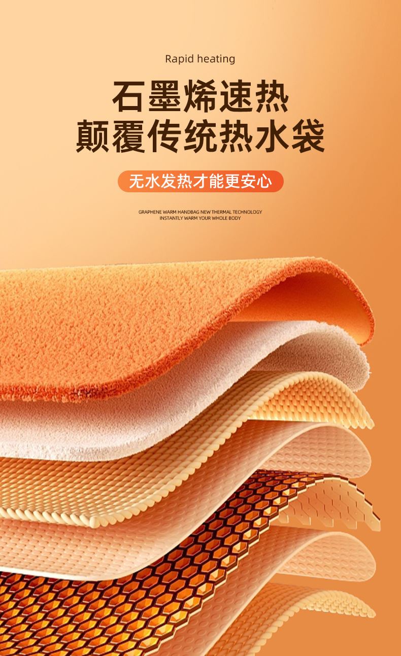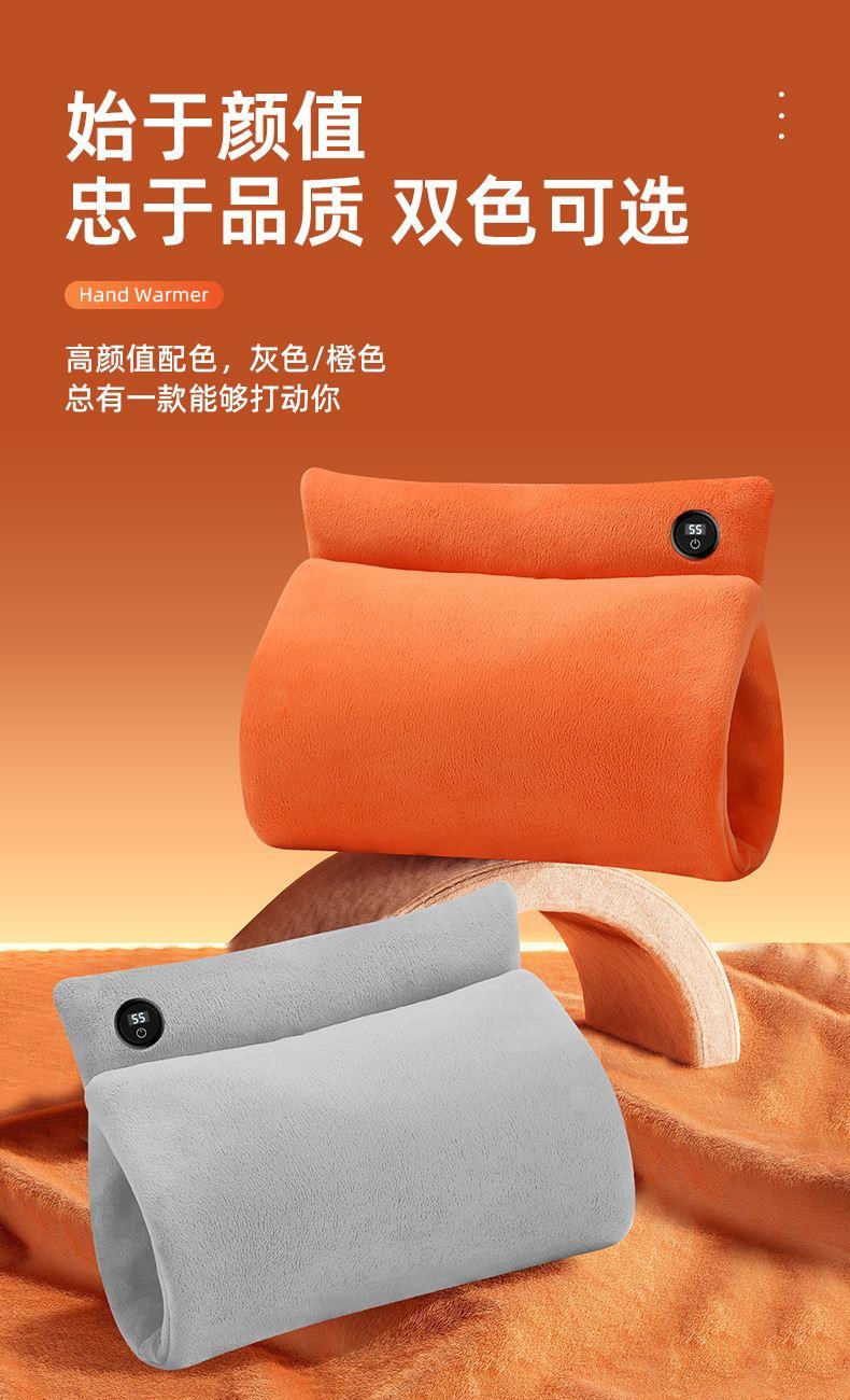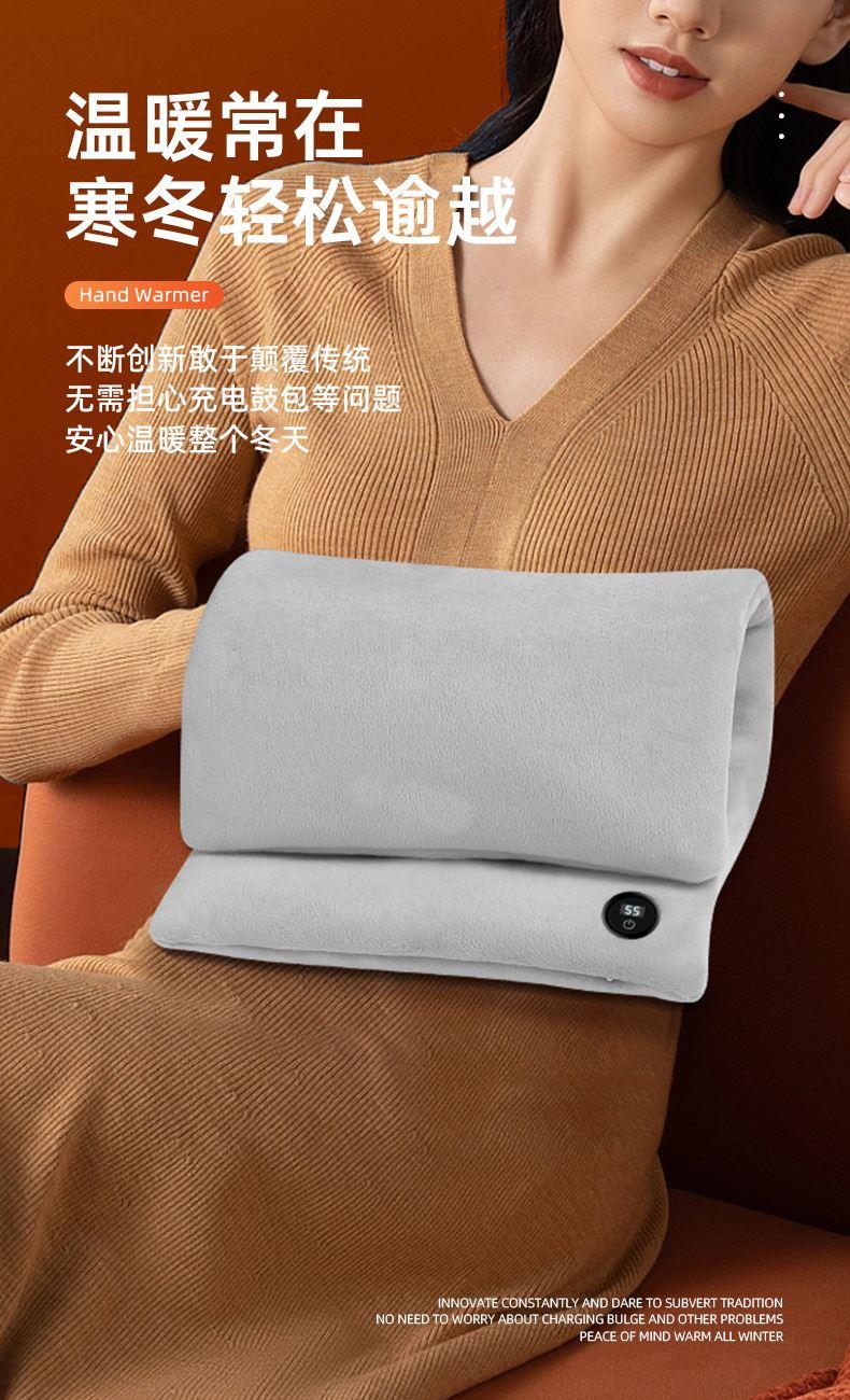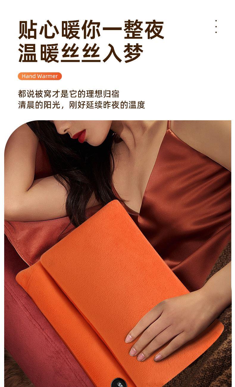 "额定电压:USB5V 产品重量:350g 产品尺寸:23.5*3*24cm 包装尺寸:31*5*26cm 外箱尺寸:80*54*68.6cm/60个/21.6kg 产品颜色:橙色、灰色、咖色 产品标配:彩盒、主机、说明书" "大面积双面发热,石墨烯发热片3秒速热 USB插电使用,可用移动电源,旅行、外出皆可使用 三档发热,AI温控,防过载、防过温、防短路 可展开设计,一袋多用,暖手、暖腹、暖腰、暖背 柔软面料,亲肤舒适,保暖透气"