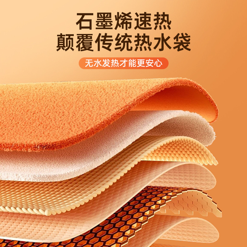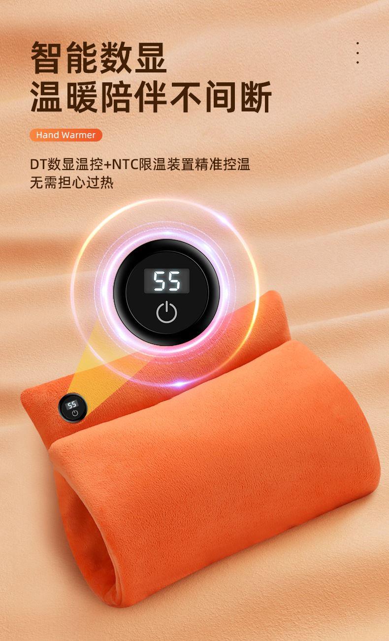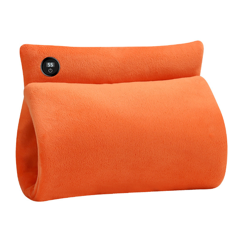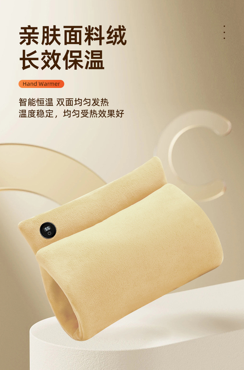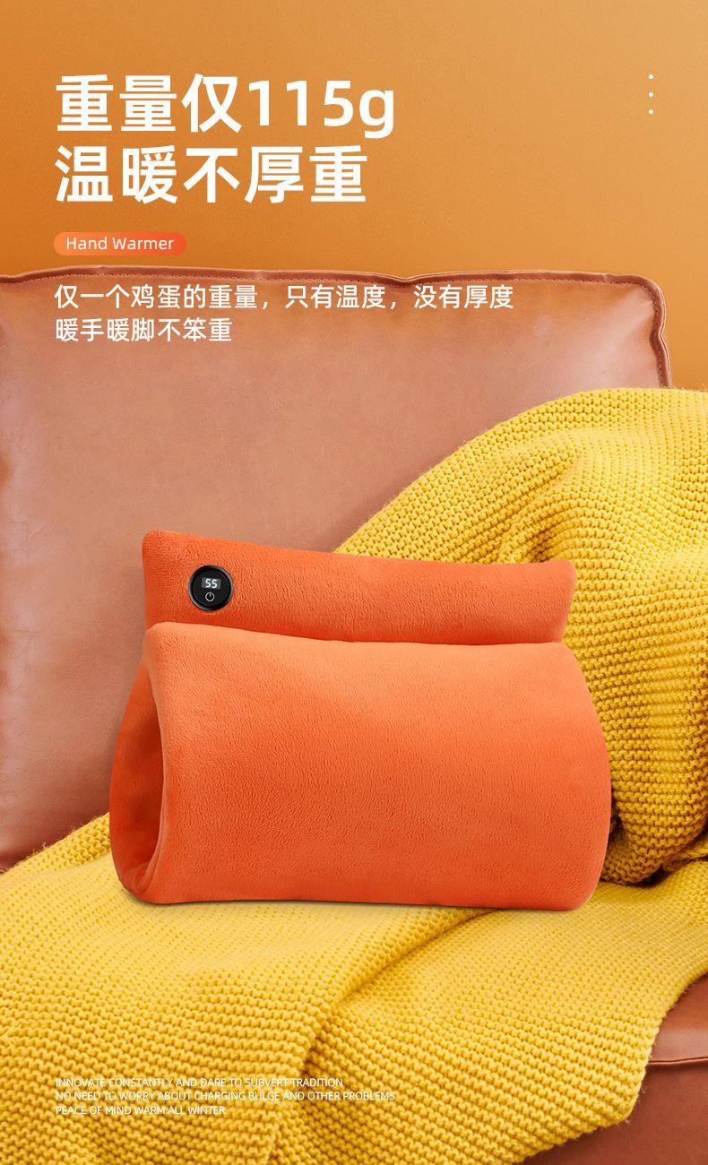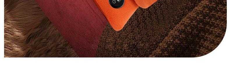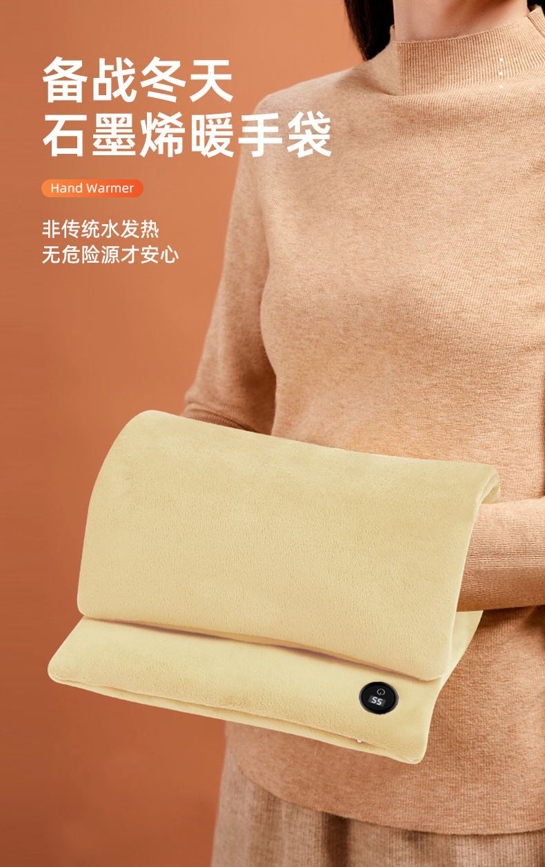 "额定电压:USB5V 产品重量:350g 产品尺寸:23.5*3*24cm 包装尺寸:31*5*26cm 外箱尺寸:80*54*68.6cm/60个/21.6kg 产品颜色:橙色、灰色、咖色 产品标配:彩盒、主机、说明书" "大面积双面发热,石墨烯发热片3秒速热 USB插电使用,可用移动电源,旅行、外出皆可使用 三档发热,AI温控,防过载、防过温、防短路 可展开设计,一袋多用,暖手、暖腹、暖腰、暖背 柔软面料,亲肤舒适,保暖透气"