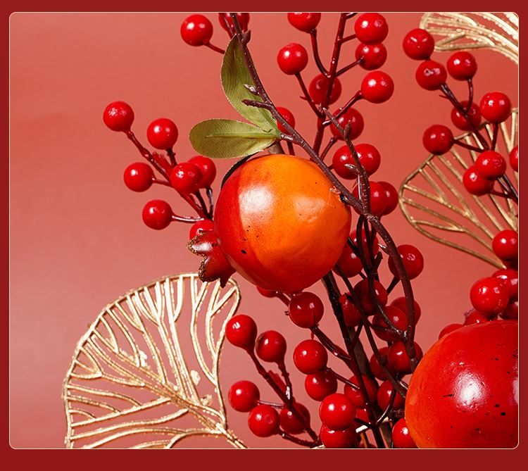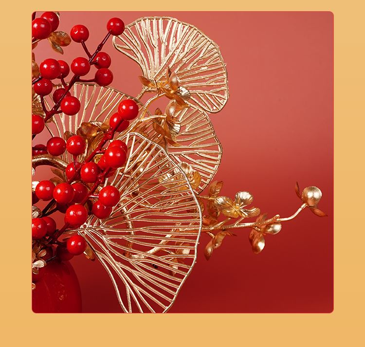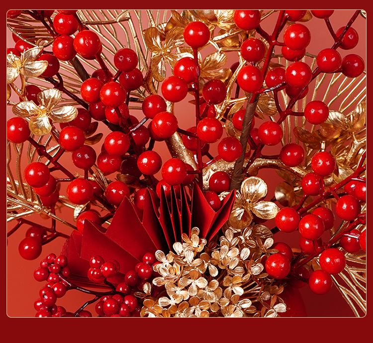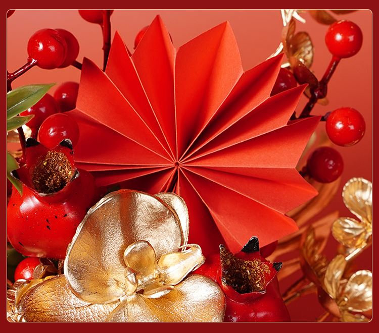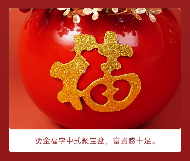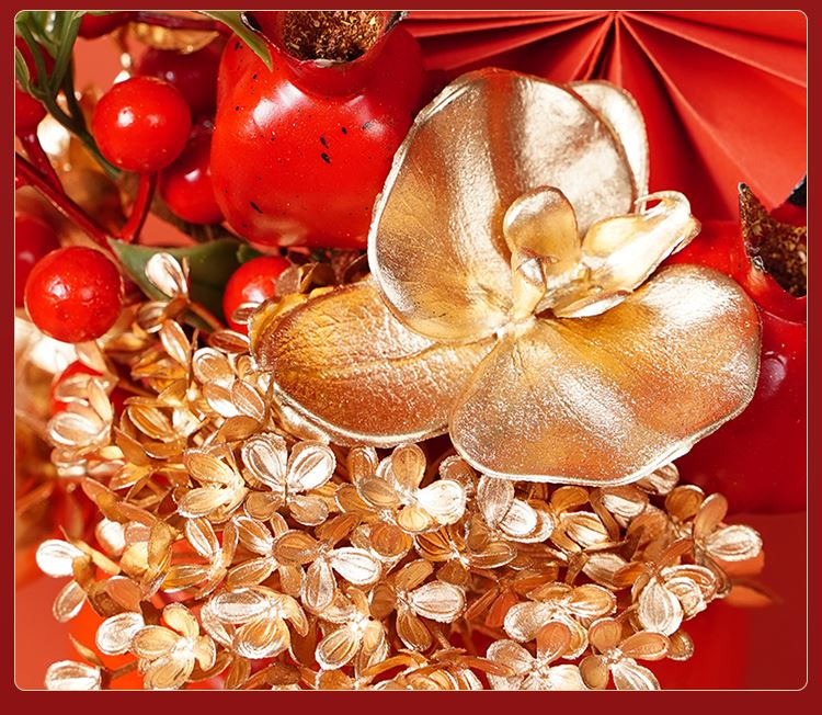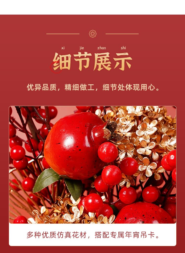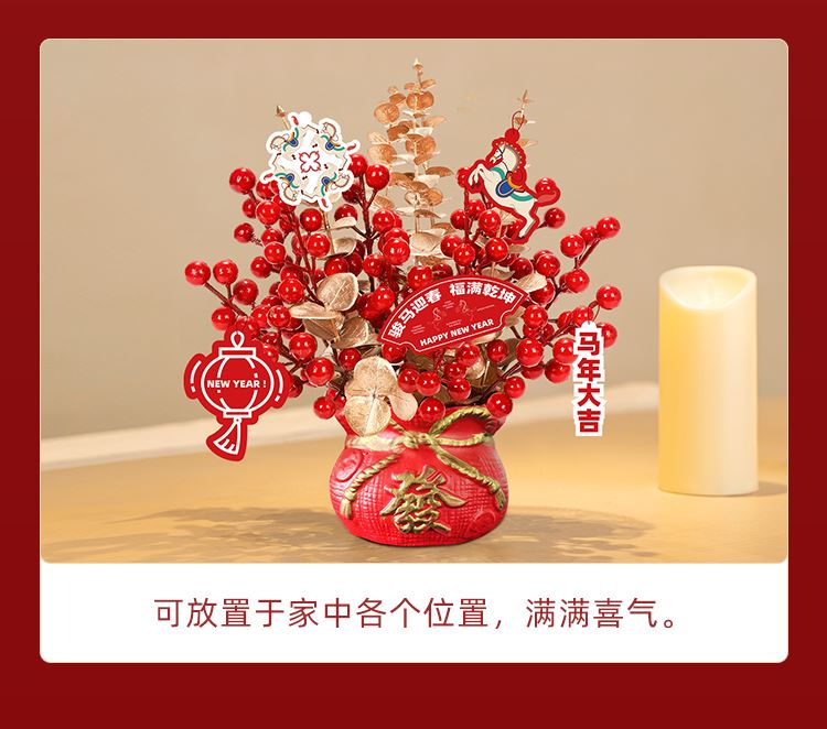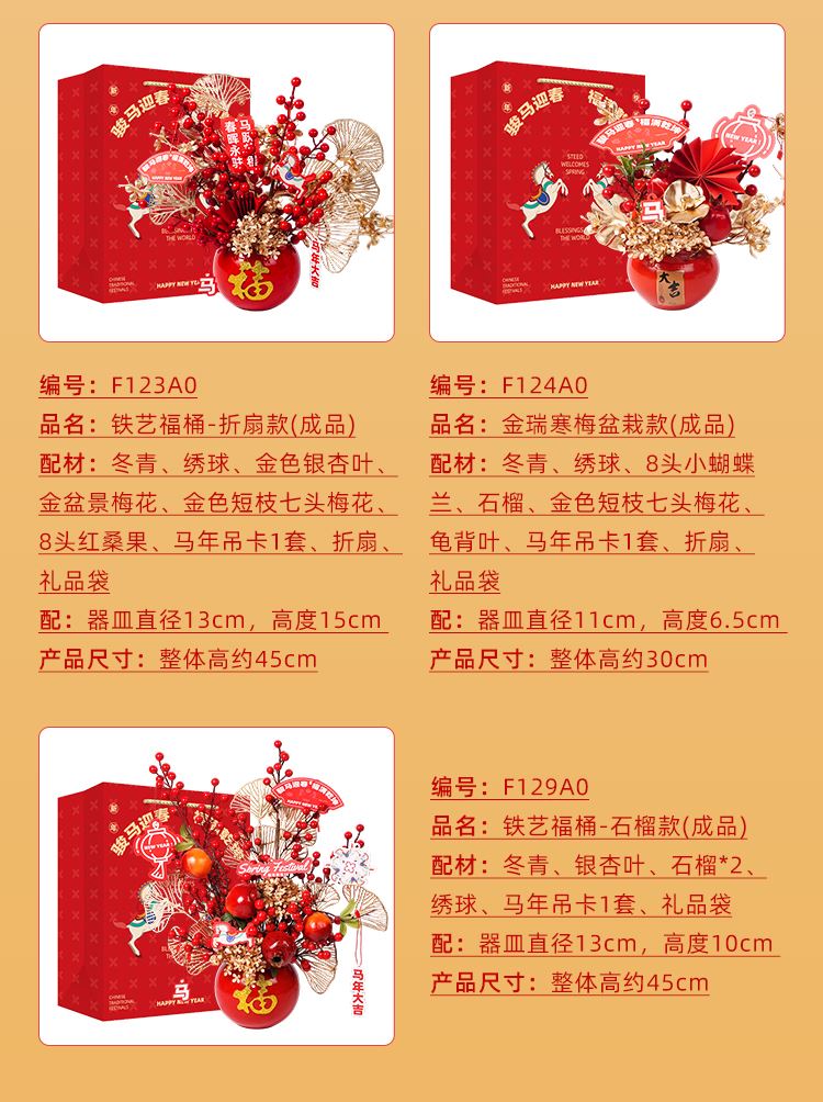 编码:F026A0 规格明细:年宵花高度;高度30cm 材料:单只冬青红色、尤加利叶金色、银杏叶、醒狮吊卡1套、钱袋花盆、礼品袋
