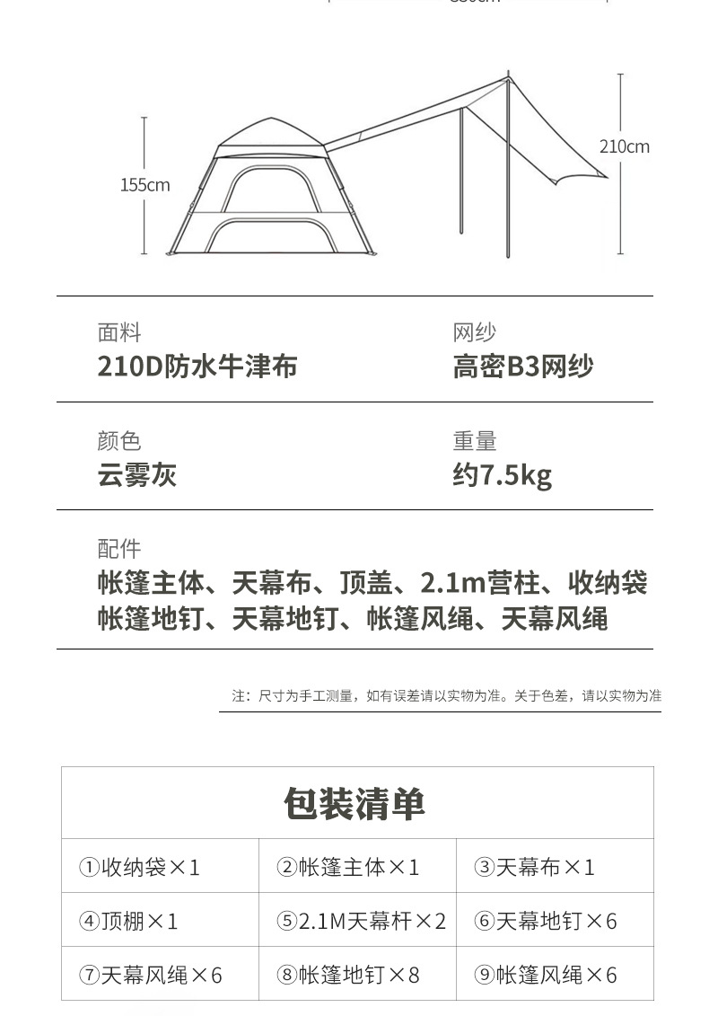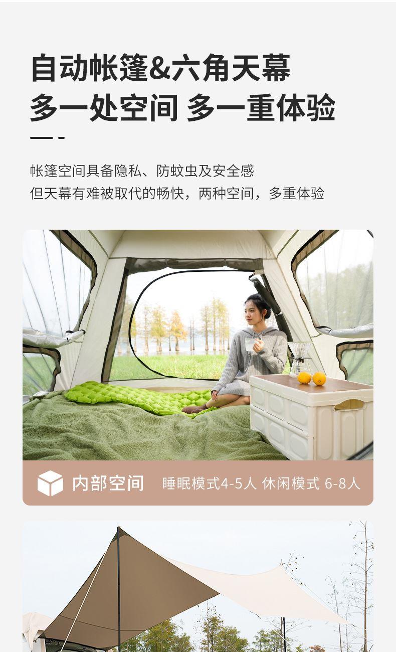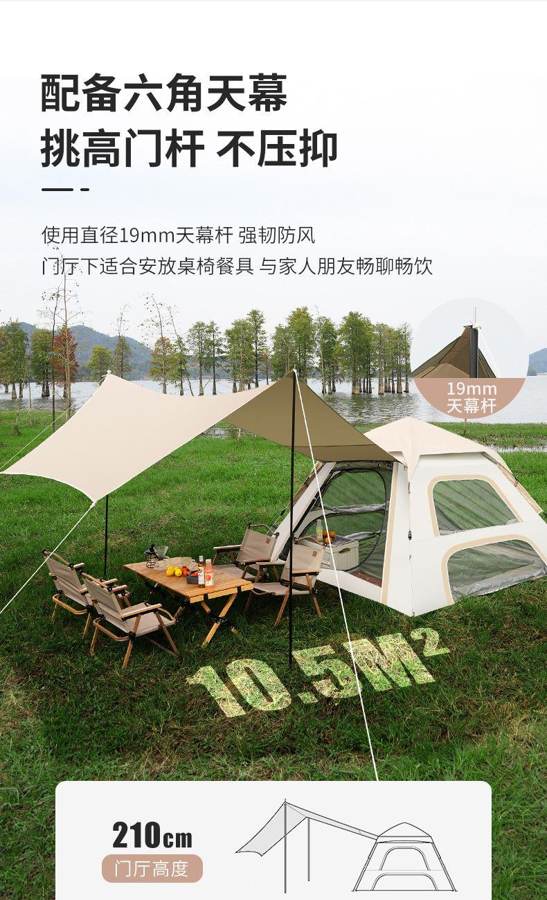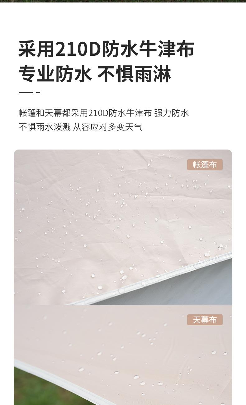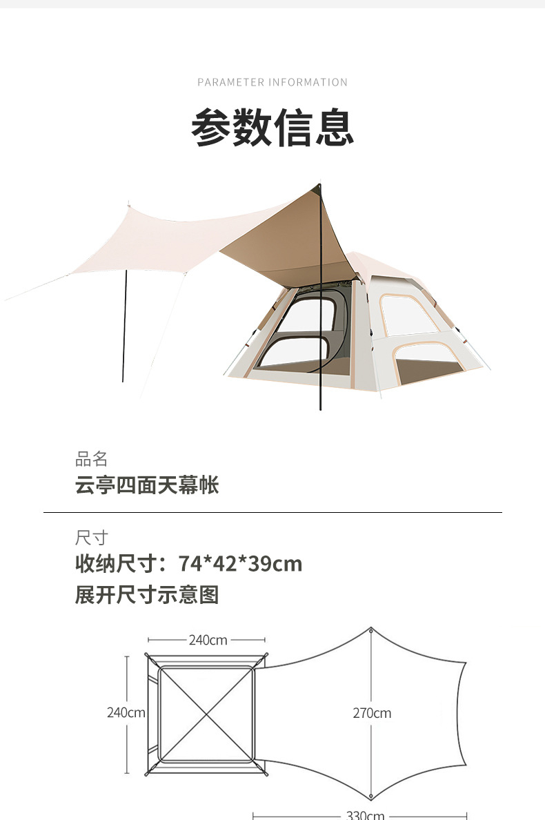 材质:高密B3网纱+玻璃纤维杆 +210D防水牛津布 帐篷尺寸:240*240*155cm 天幕尺寸:270*330*210cm 颜色:米色 净重:7.5kg 1、创意设计天幕帐篷二合一; 2、高颜值,加大空间; 3、自带收纳袋,简单便携; 4、210D防水牛津布,涂银防晒; 5、速开帐篷,轻便天幕搭建,睡眠休闲模式自由切换