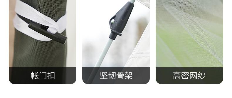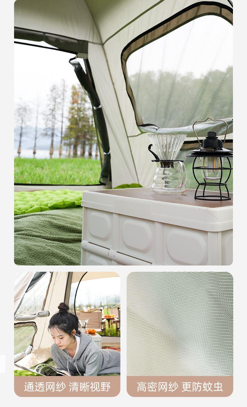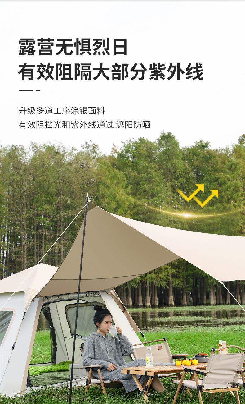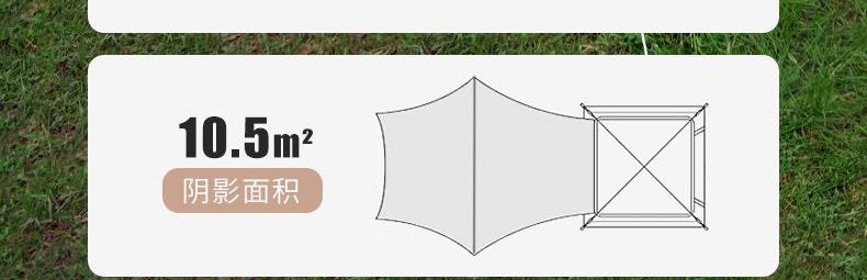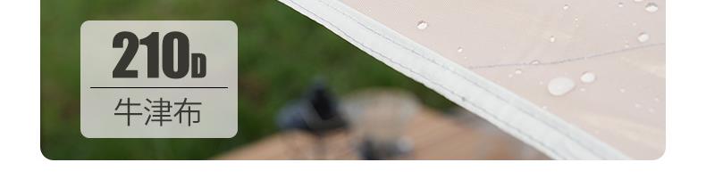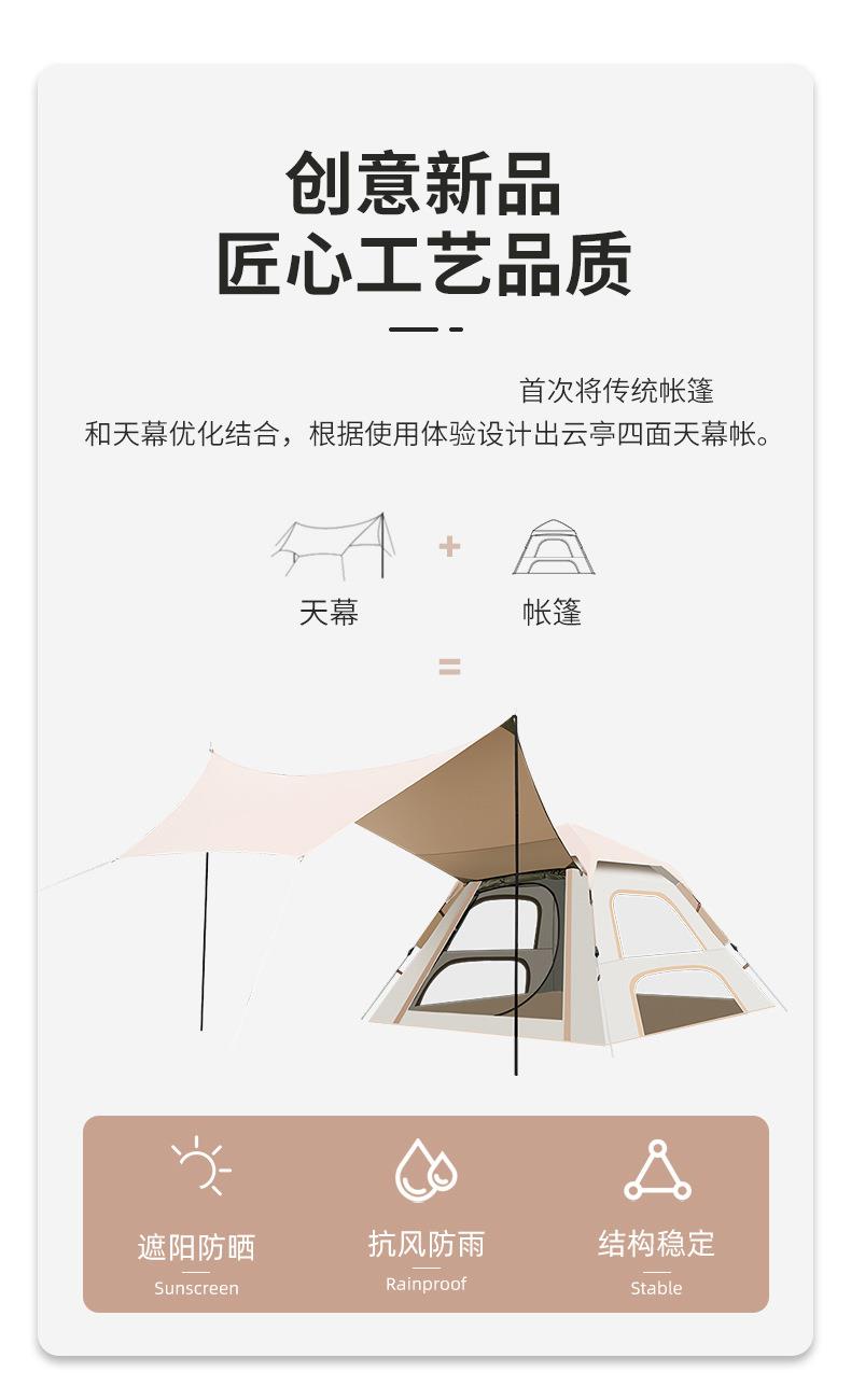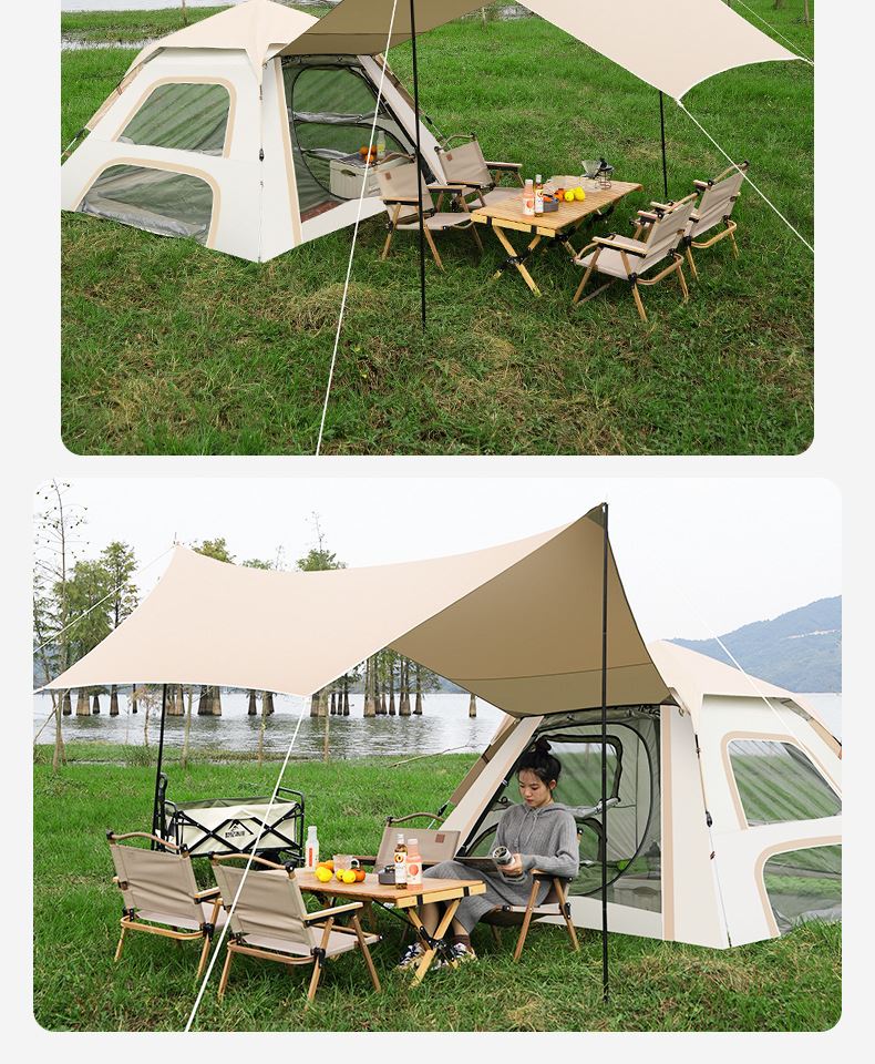 材质:高密B3网纱+玻璃纤维杆 +210D防水牛津布 帐篷尺寸:240*240*155cm 天幕尺寸:270*330*210cm 颜色:米色 净重:7.5kg 1、创意设计天幕帐篷二合一; 2、高颜值,加大空间; 3、自带收纳袋,简单便携; 4、210D防水牛津布,涂银防晒; 5、速开帐篷,轻便天幕搭建,睡眠休闲模式自由切换