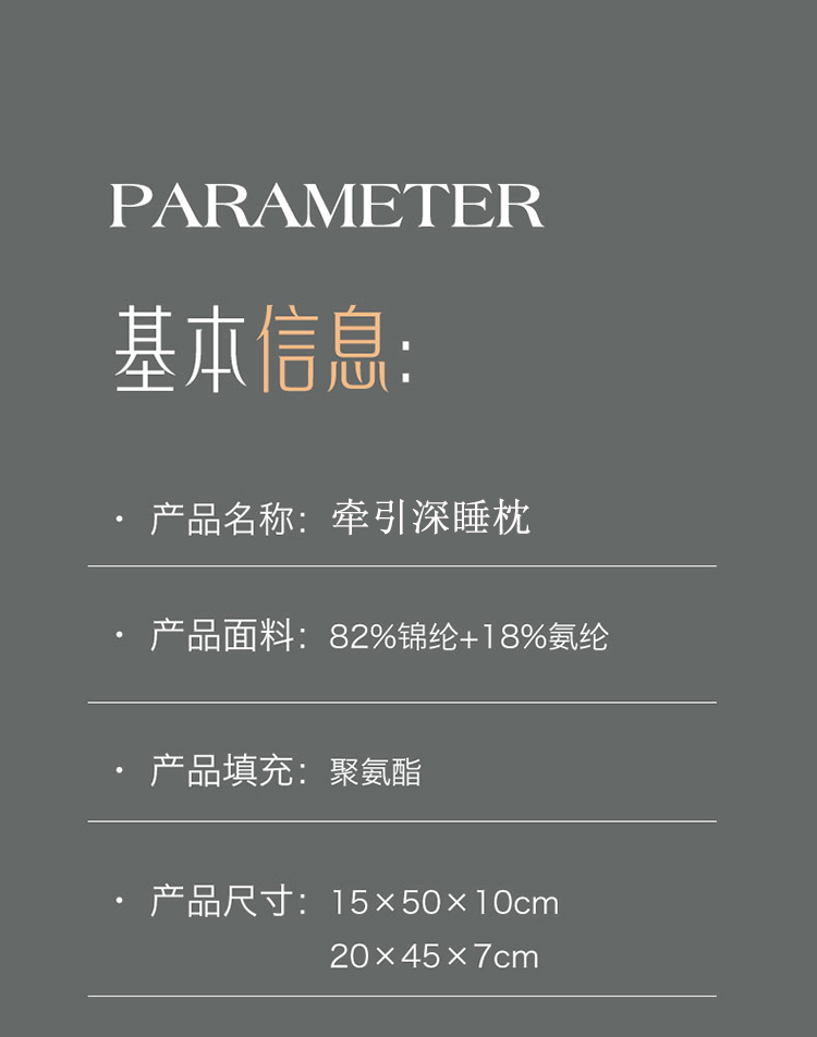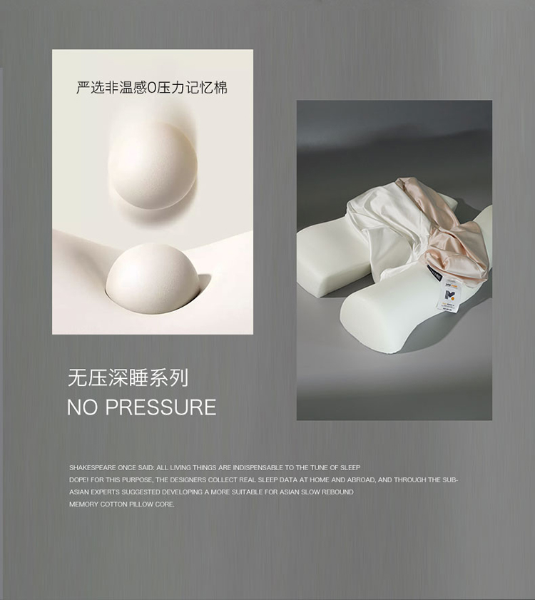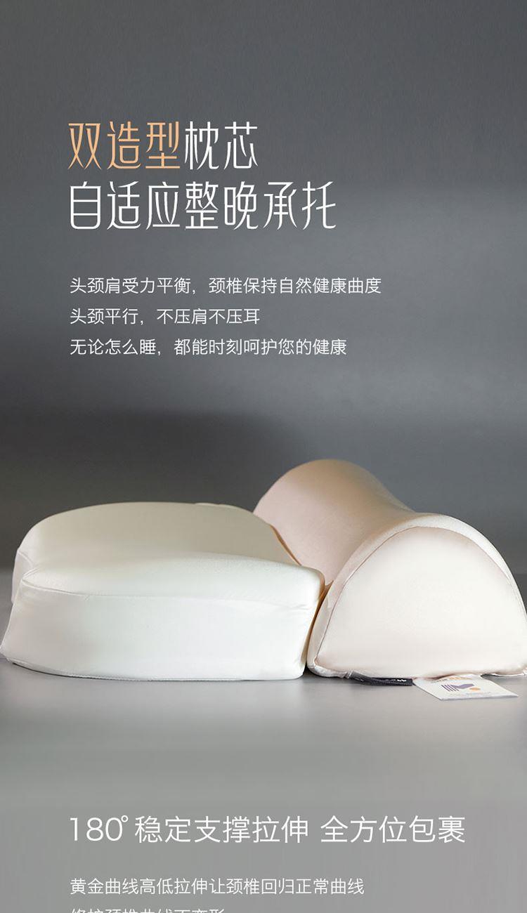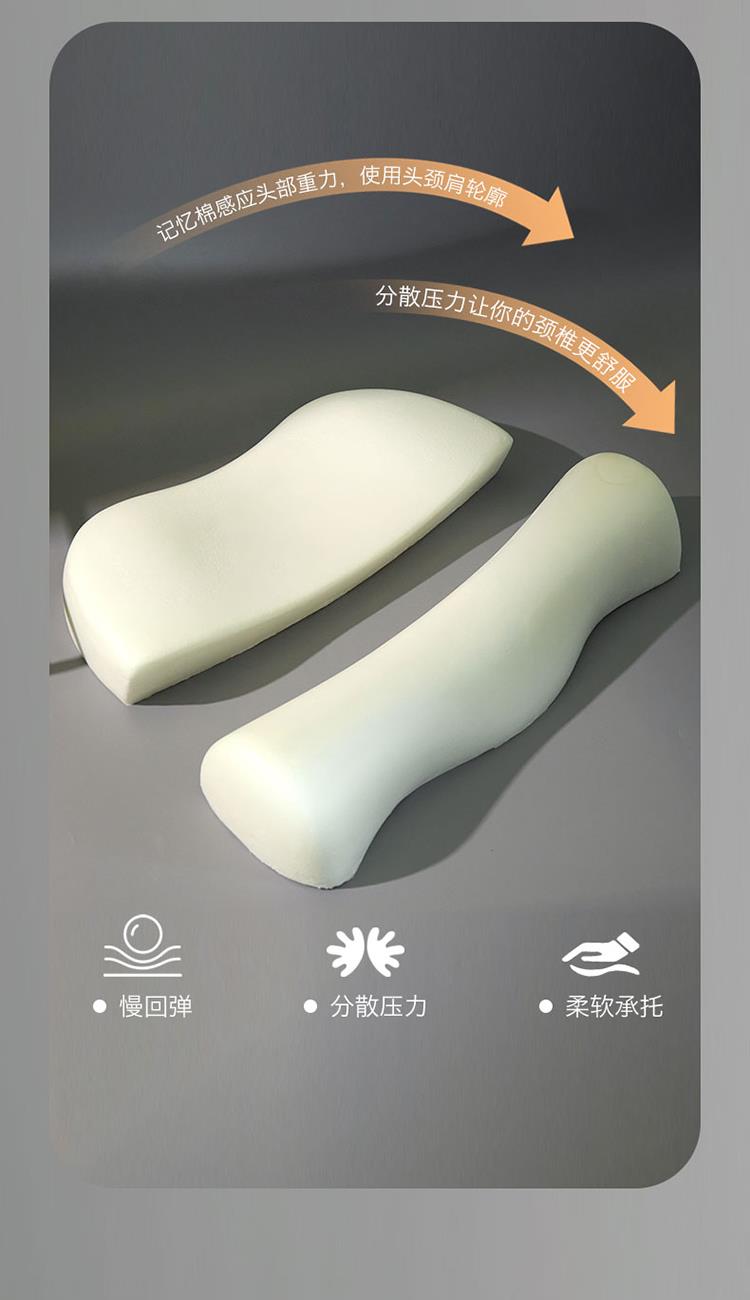 规格:15*50*10cm/20*45*7cm 面料:锦纶/氨纶 填充物:记忆棉 产品包装:精美手提袋 包装尺寸:50*77cm 1.零压力深睡枕缓解压力,舒缓颈椎,零压承托,舒适好眠软弹,释压无抵触感。 2.双造型枕芯,自适应整晚承托。180⁰稳定支撑拉伸包裹。