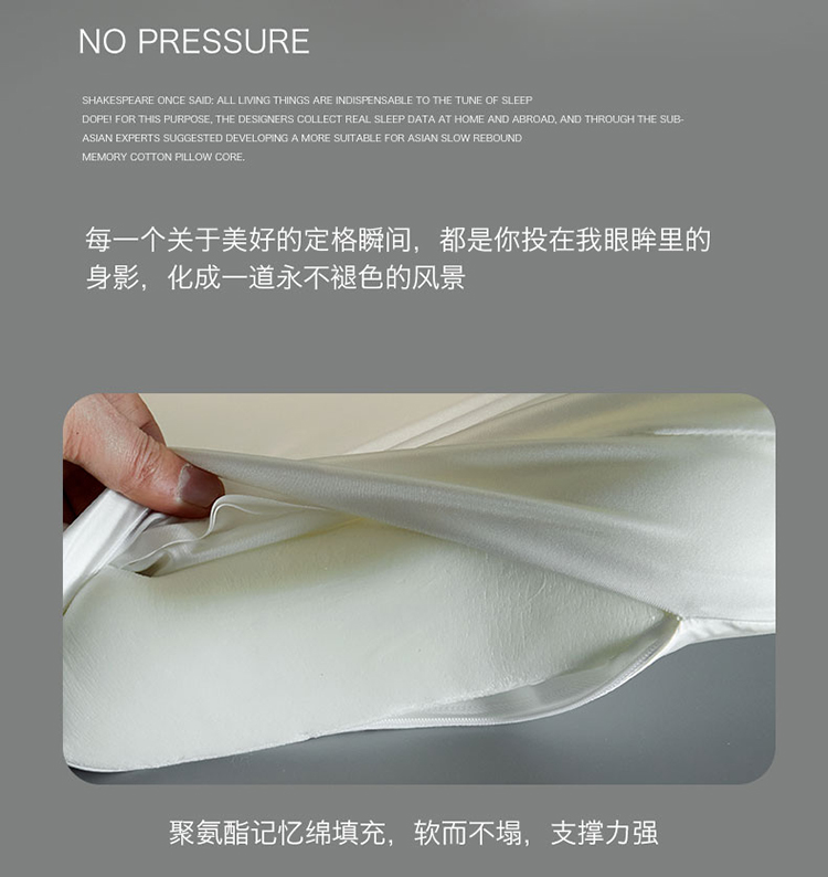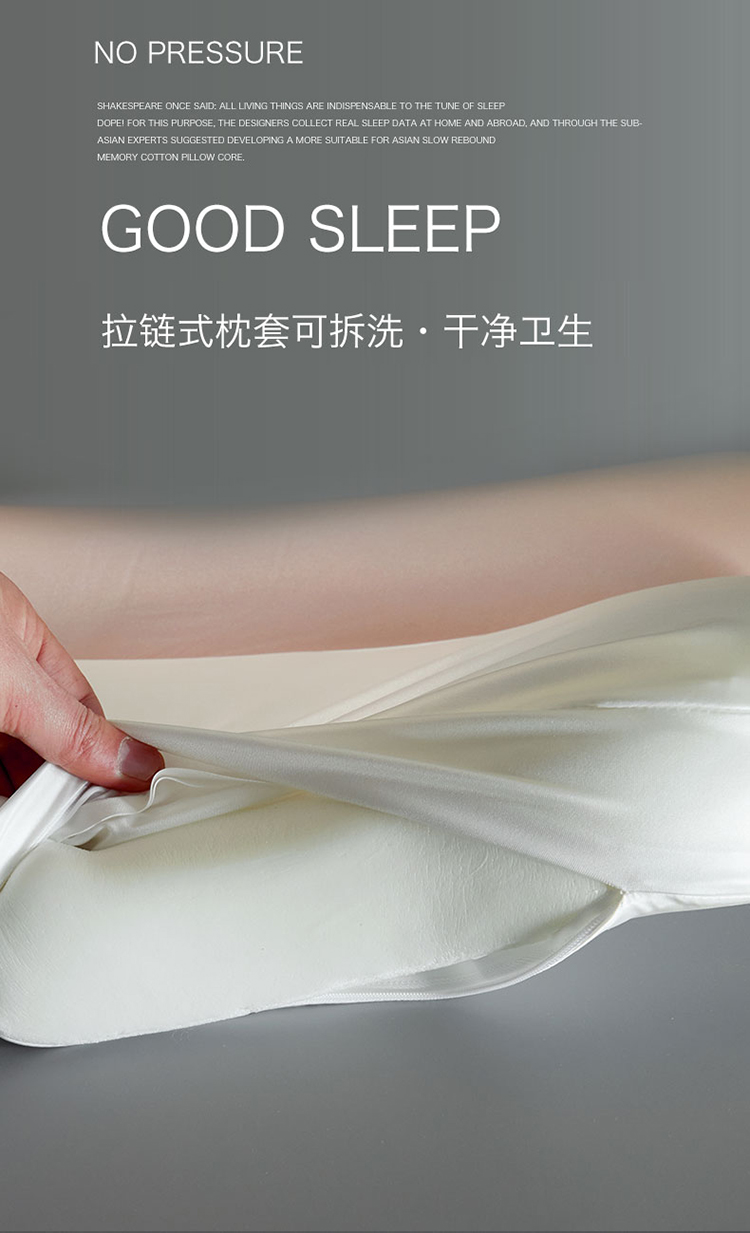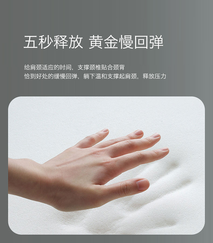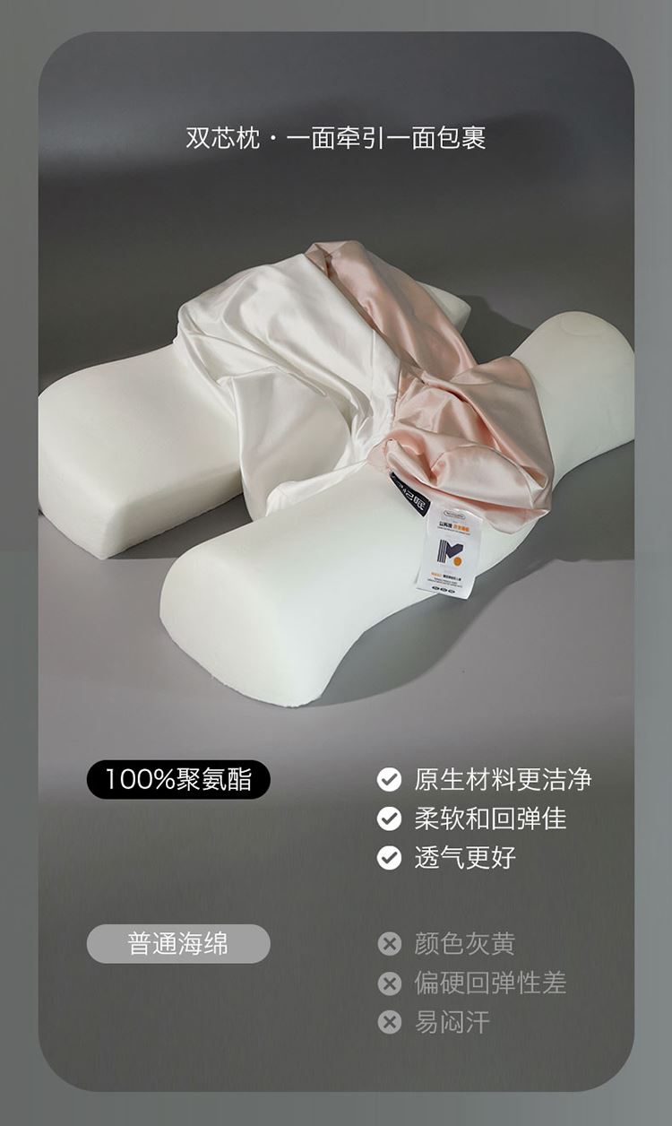 规格:15*50*10cm/20*45*7cm 面料:锦纶/氨纶 填充物:记忆棉 产品包装:精美手提袋 包装尺寸:50*77cm 1.零压力深睡枕缓解压力,舒缓颈椎,零压承托,舒适好眠软弹,释压无抵触感。 2.双造型枕芯,自适应整晚承托。180⁰稳定支撑拉伸包裹。