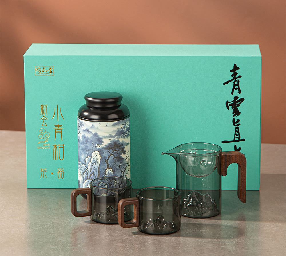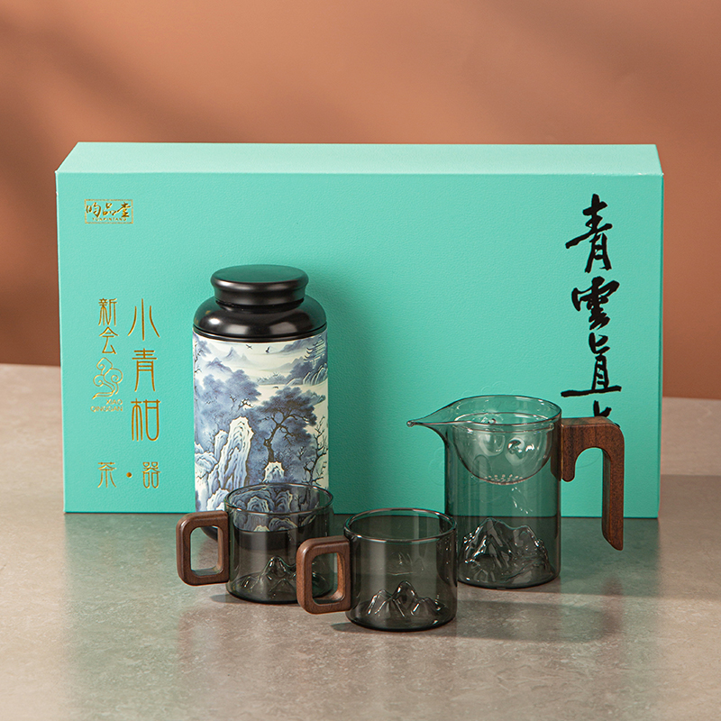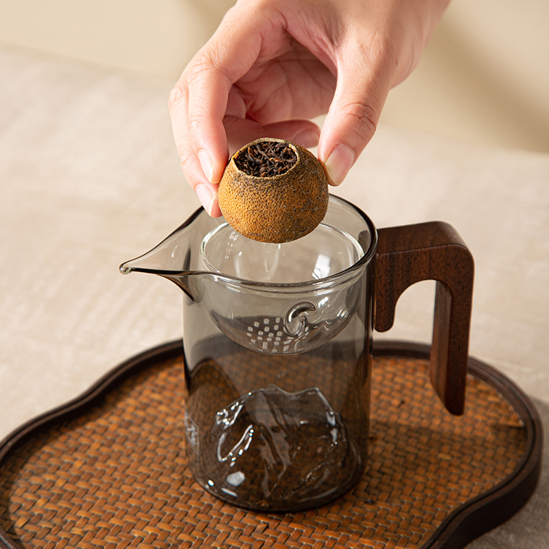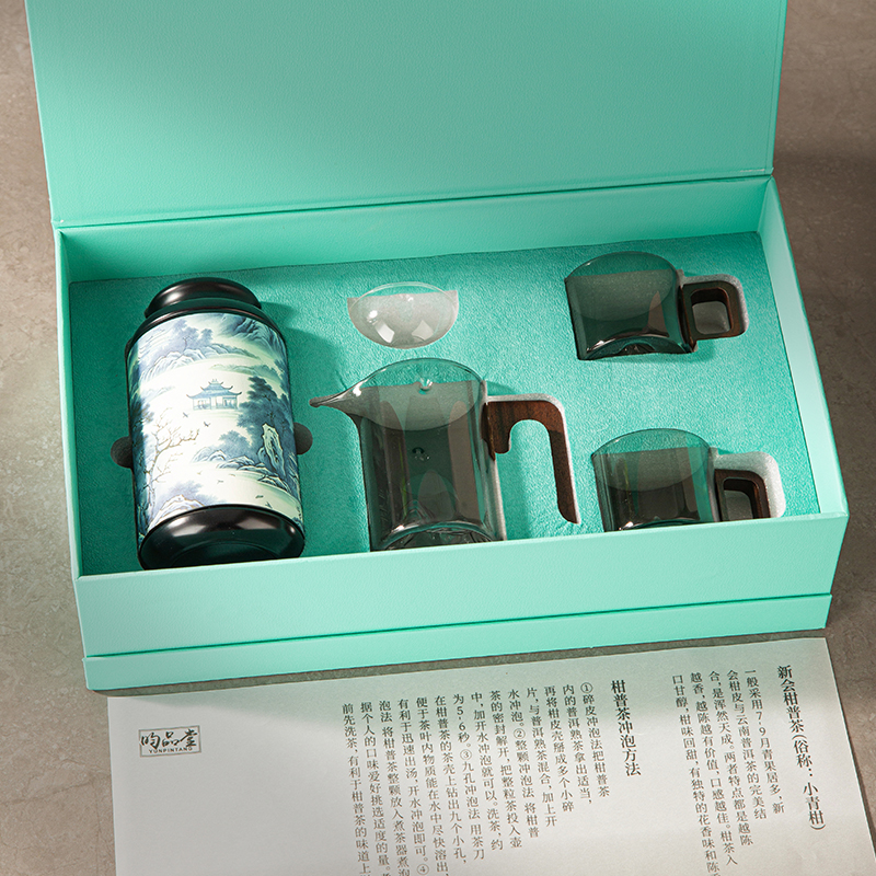 6.礼盒赠配小青柑专用泡茶壶与把手茶杯,杯内有观山造型设计,采用高硼硅耐热玻璃,实用且赏心悦目。