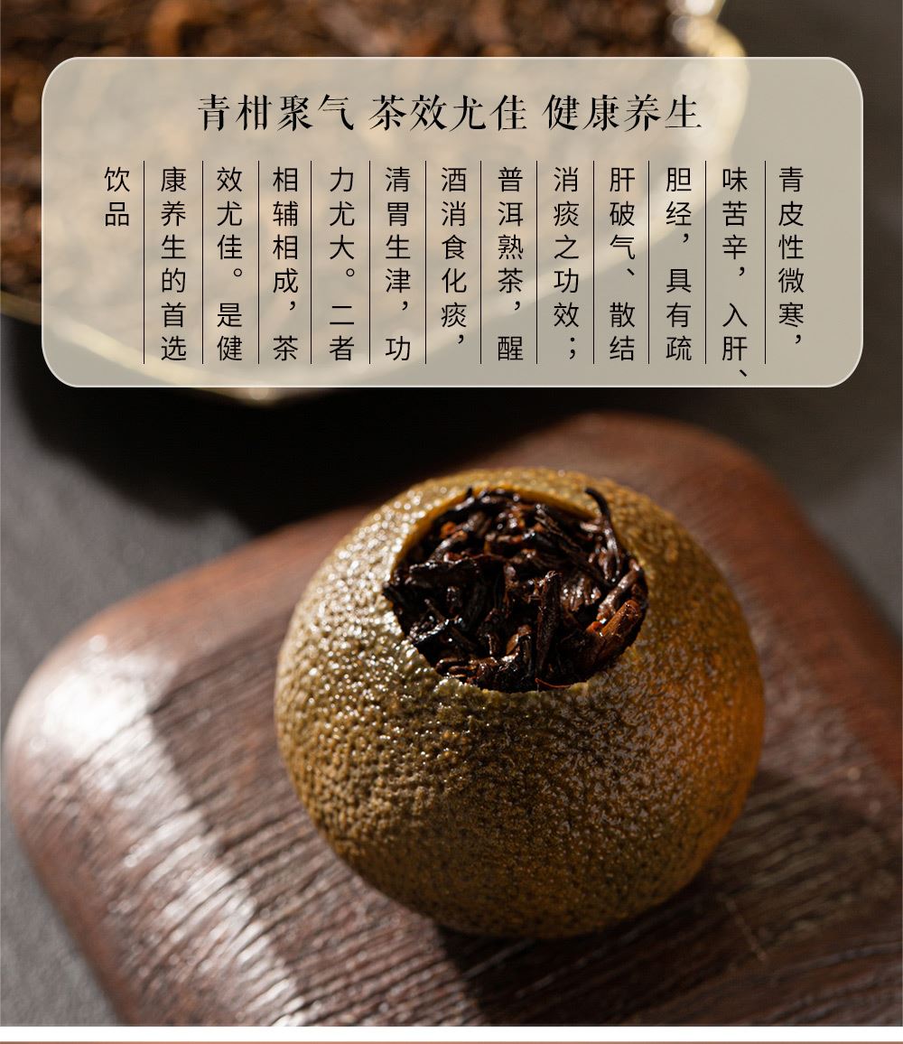 3.新会小青柑性温,甘香醇陈,油包清晰,油室饱满,芳香浓郁,具有唤醒味蕾,改善食欲不振,消滞健胃。