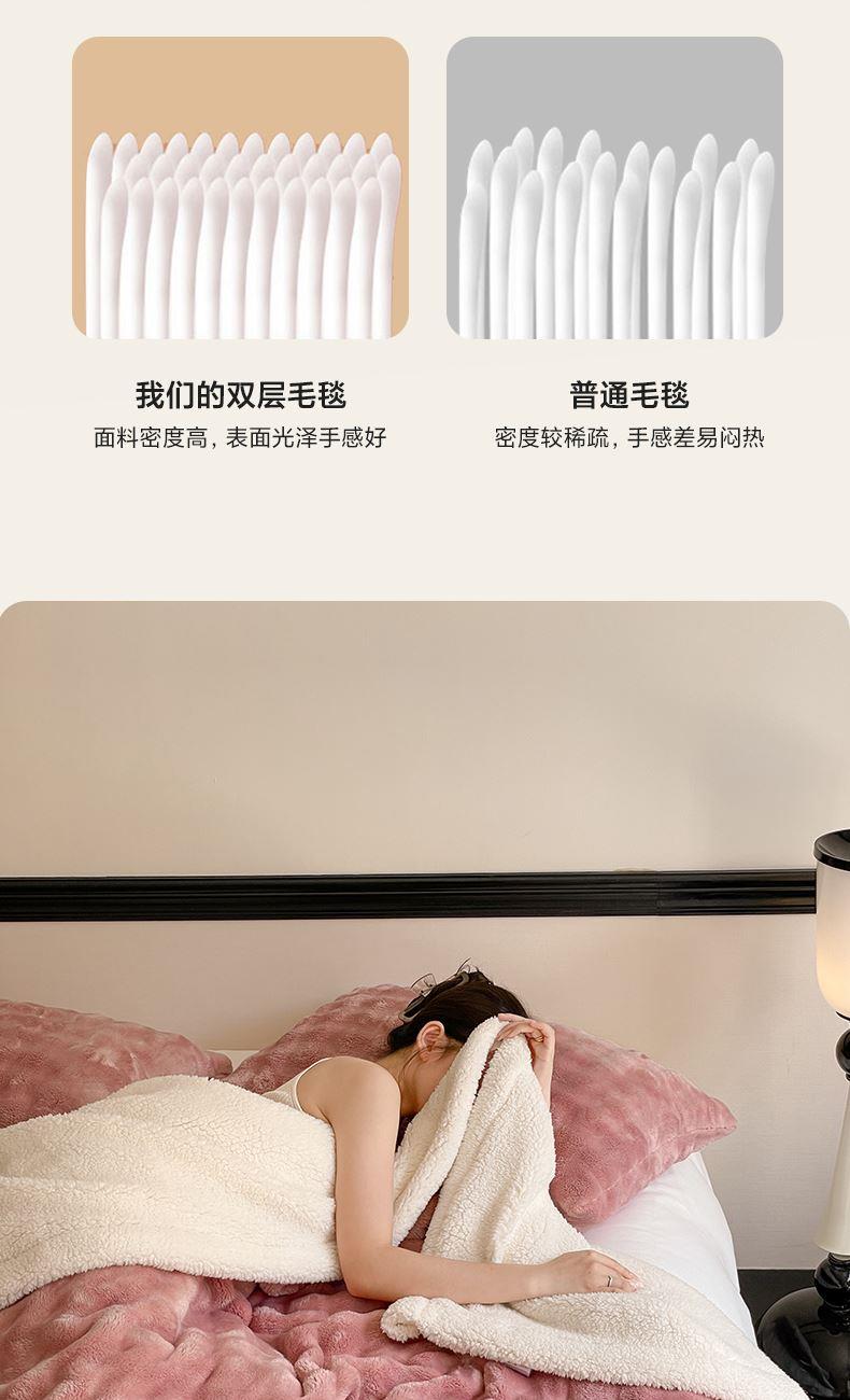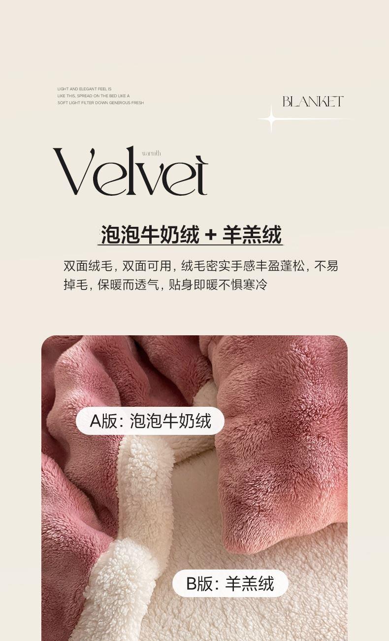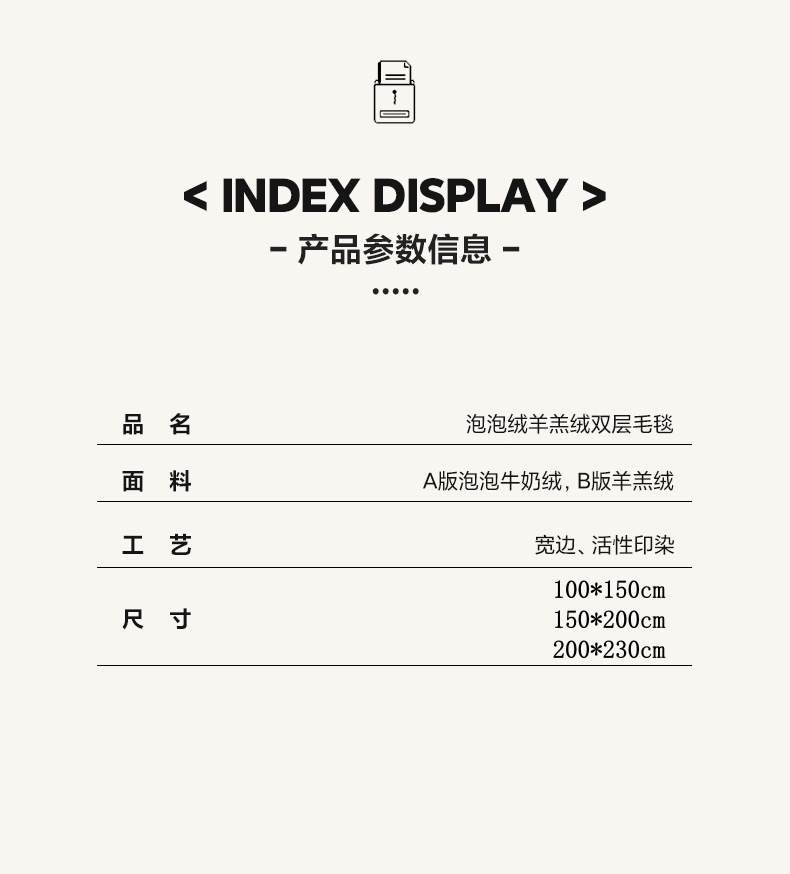 产品规格:150*200cm 花色:宝蓝、豆沙、卡其、米白、浅灰 面料:A版泡泡牛奶绒,B版羊羔绒 产品卖点:宽边、活性印染、两面不同,双面可用、软糯柔软,直击每个小仙女的心,双面绒毛双面可用,绒毛密实手感丰盈蓬松,不易掉毛,保暖而透气,贴身即暖不惧寒冷