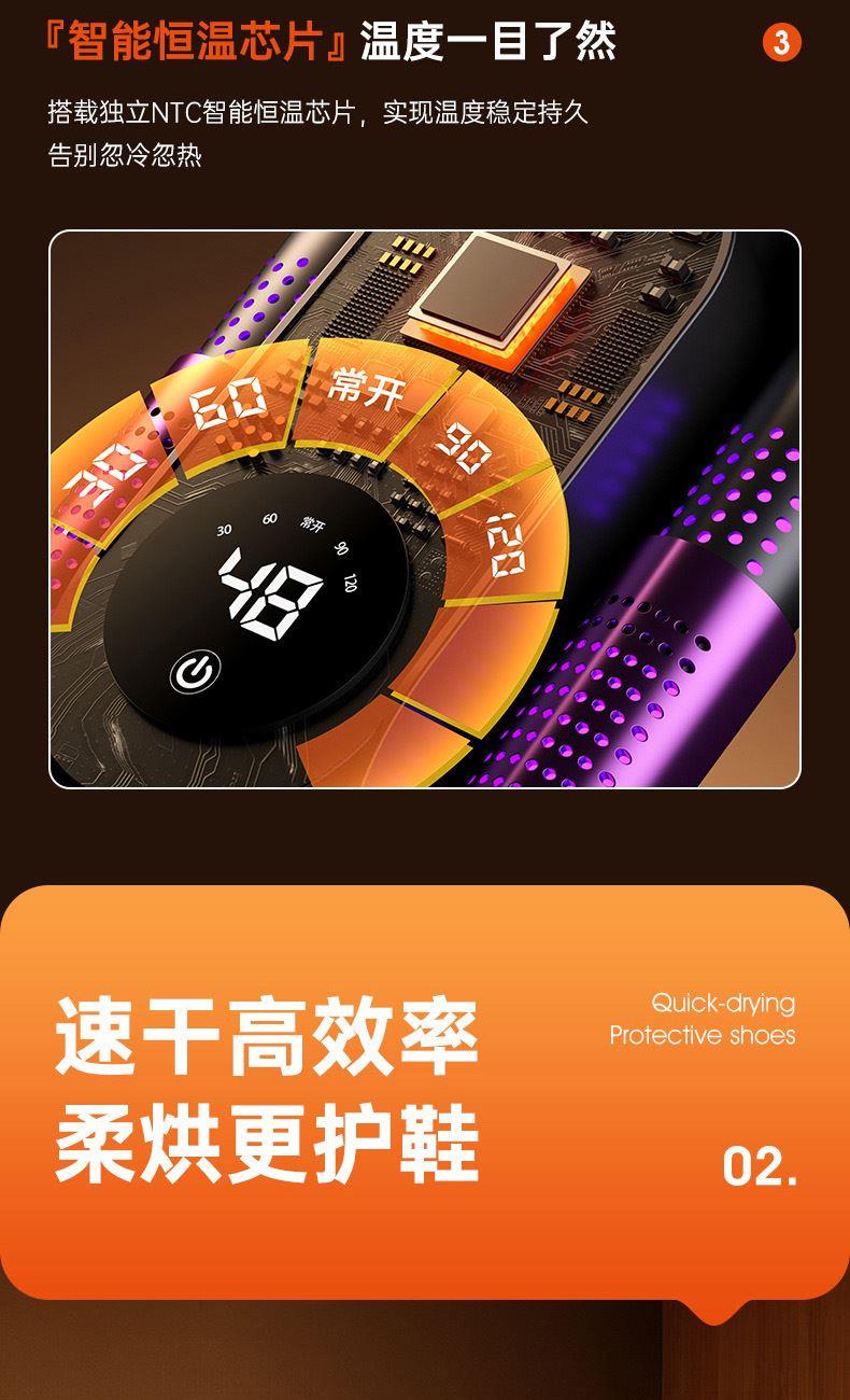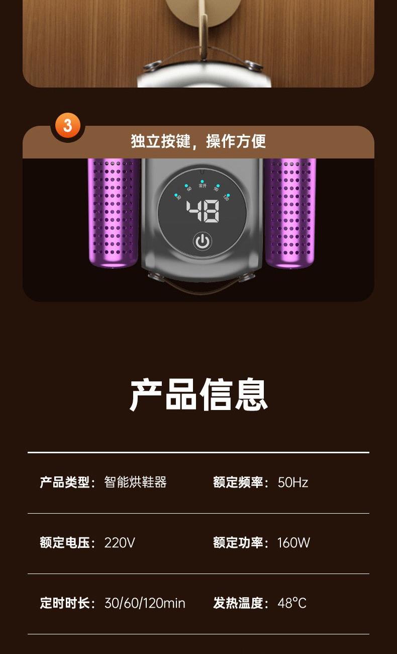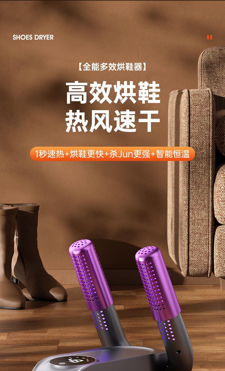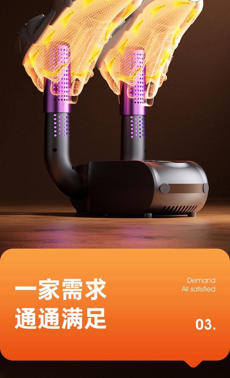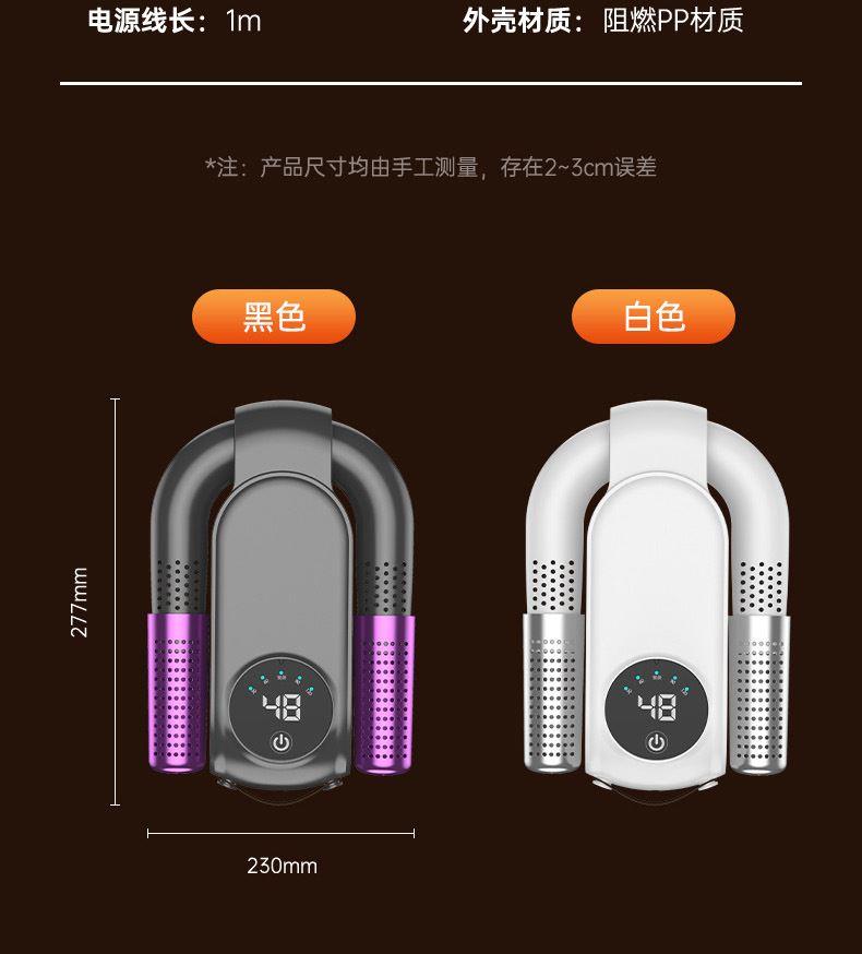 颜色:白色、灰紫色 供电方式:220V直插电 额定功率:150W 主机包装:18.3*8.8*27.5cm/570g 外箱尺寸:57.5*47*57.5cm/30台/18.1kg 产品标配:彩盒、主机、说明书 可折叠式出风口,360度立体热风烘干 双核PTC发热,智能恒温,烘干不伤鞋 UV紫光消菌,除臭净味二合一 2小时定时烘干