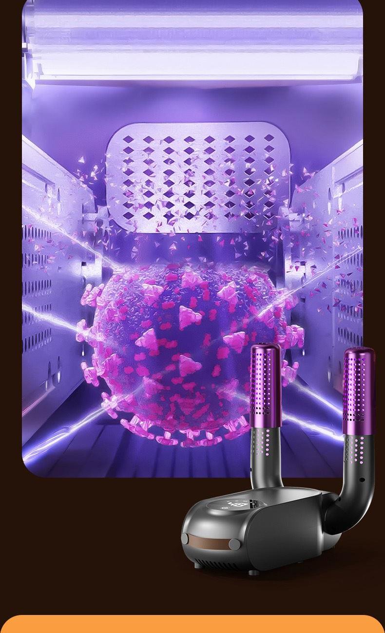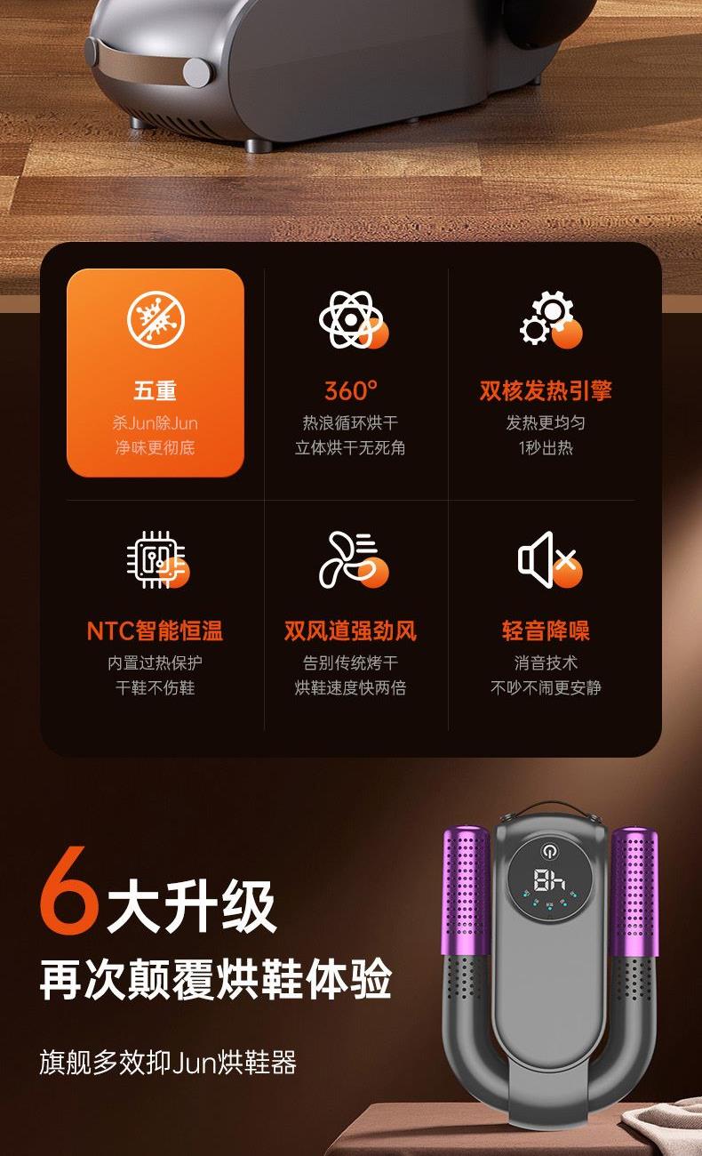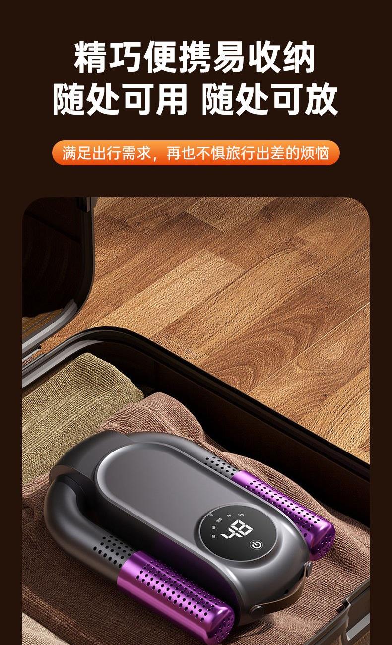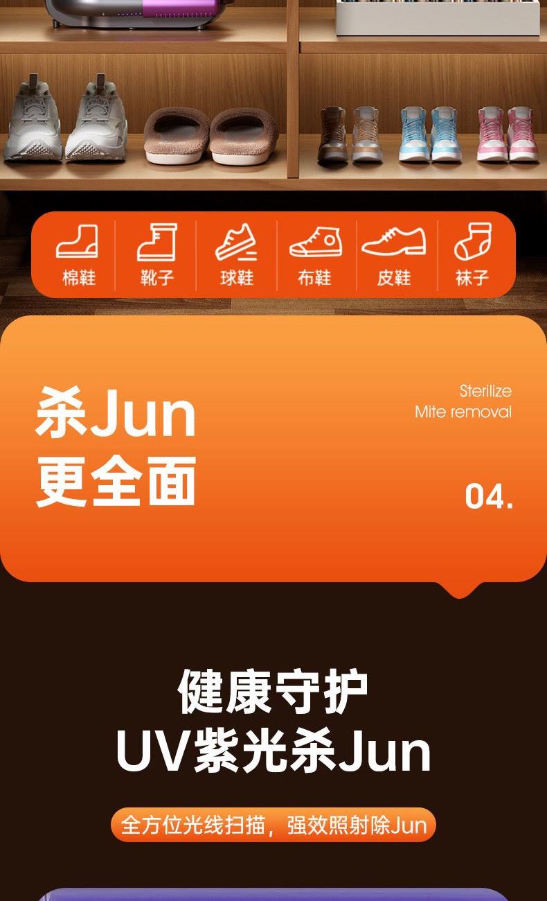 颜色:白色、灰紫色 供电方式:220V直插电 额定功率:150W 主机包装:18.3*8.8*27.5cm/570g 外箱尺寸:57.5*47*57.5cm/30台/18.1kg 产品标配:彩盒、主机、说明书 可折叠式出风口,360度立体热风烘干 双核PTC发热,智能恒温,烘干不伤鞋 UV紫光消菌,除臭净味二合一 2小时定时烘干