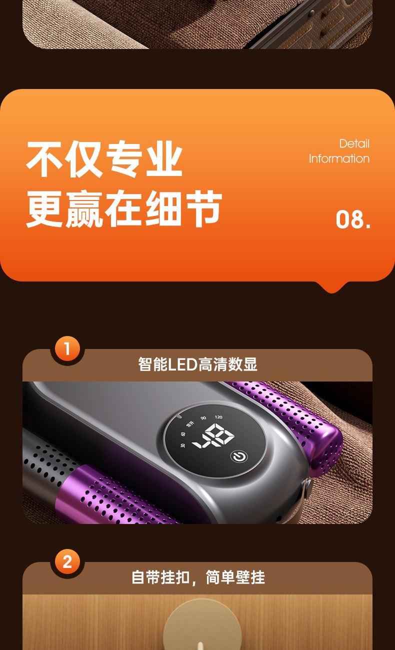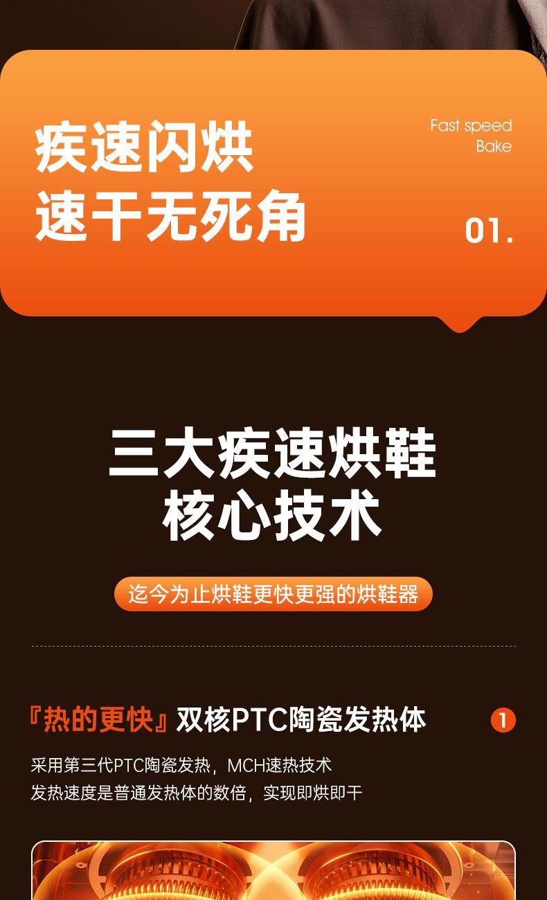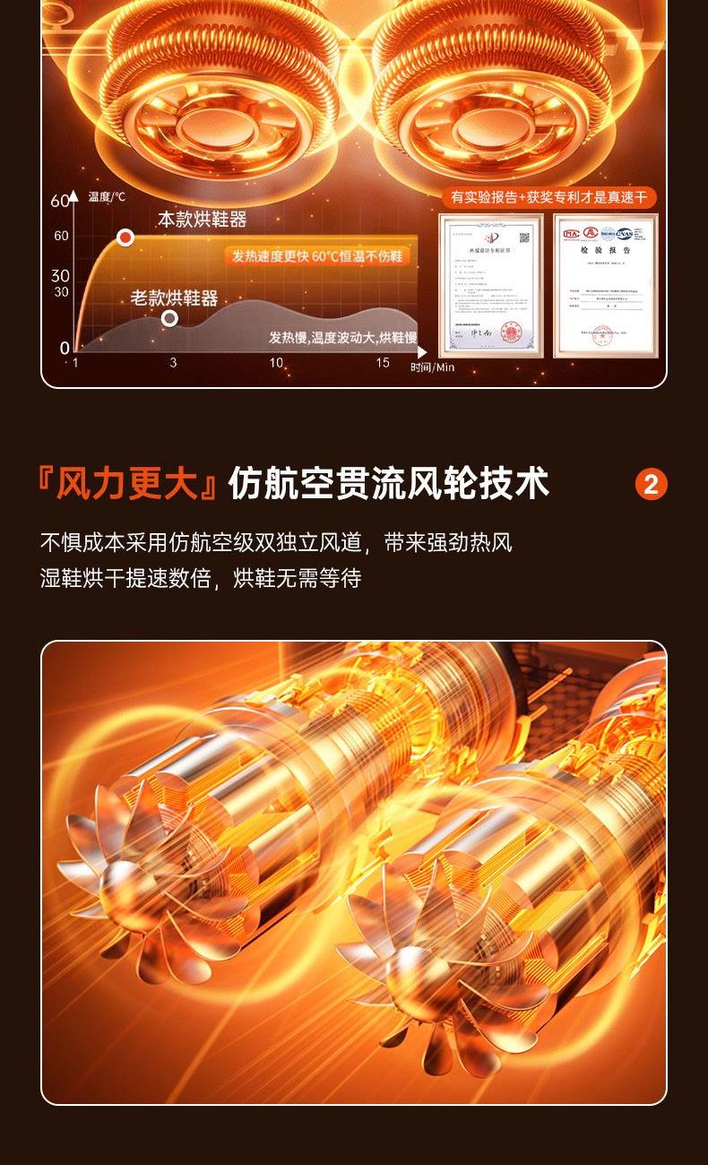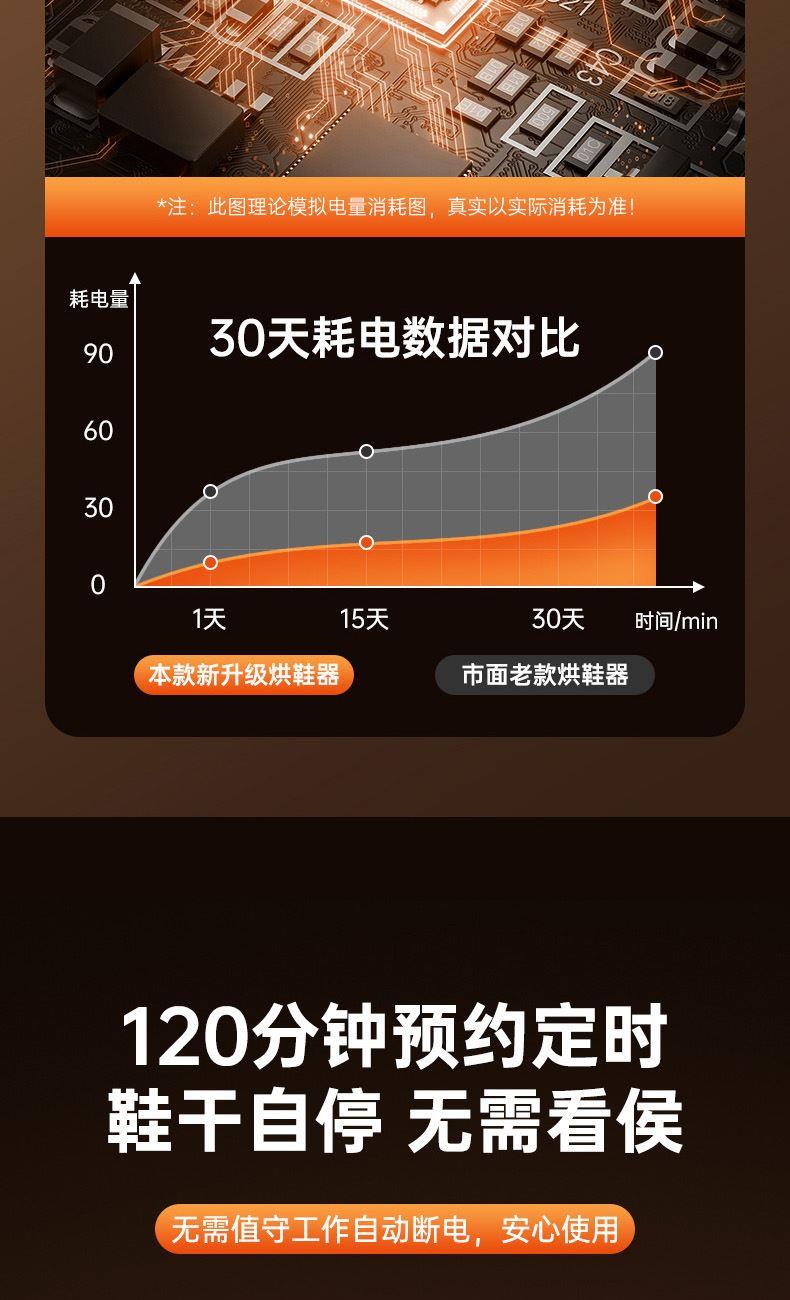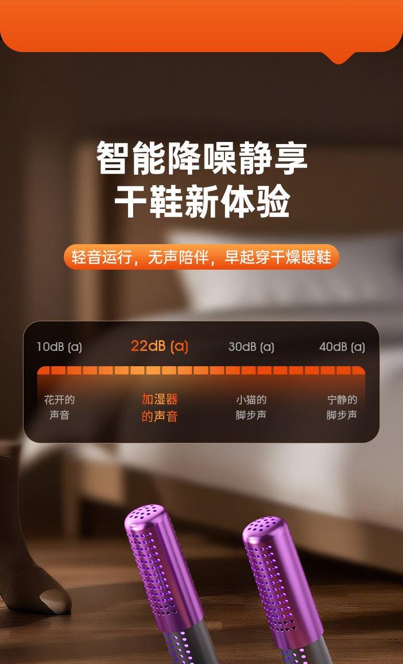 颜色:白色、灰紫色 供电方式:220V直插电 额定功率:150W 主机包装:18.3*8.8*27.5cm/570g 外箱尺寸:57.5*47*57.5cm/30台/18.1kg 产品标配:彩盒、主机、说明书 可折叠式出风口,360度立体热风烘干 双核PTC发热,智能恒温,烘干不伤鞋 UV紫光消菌,除臭净味二合一 2小时定时烘干