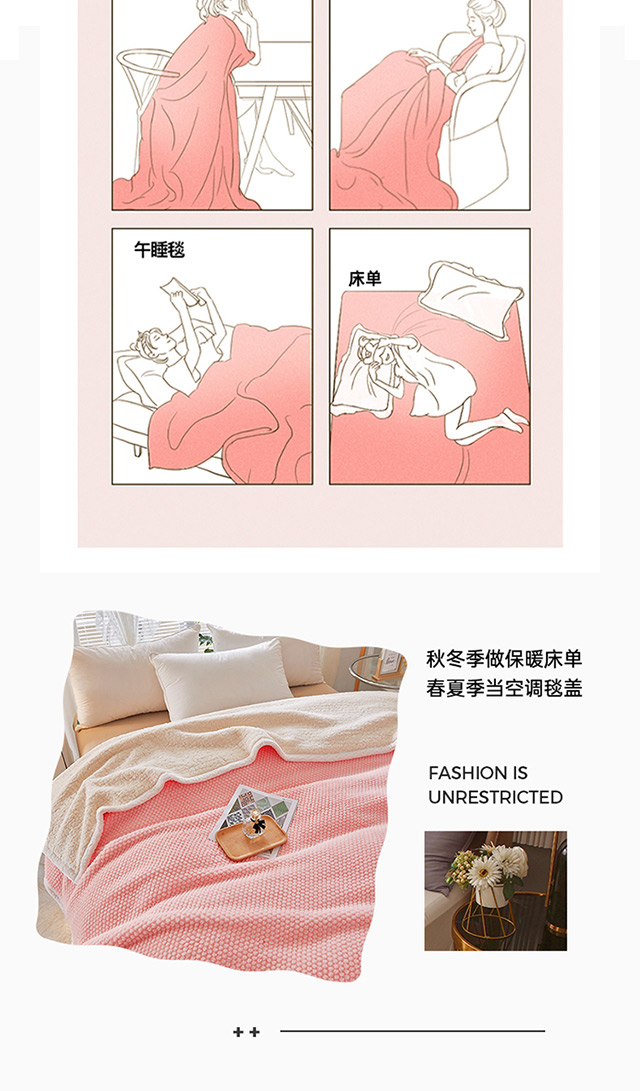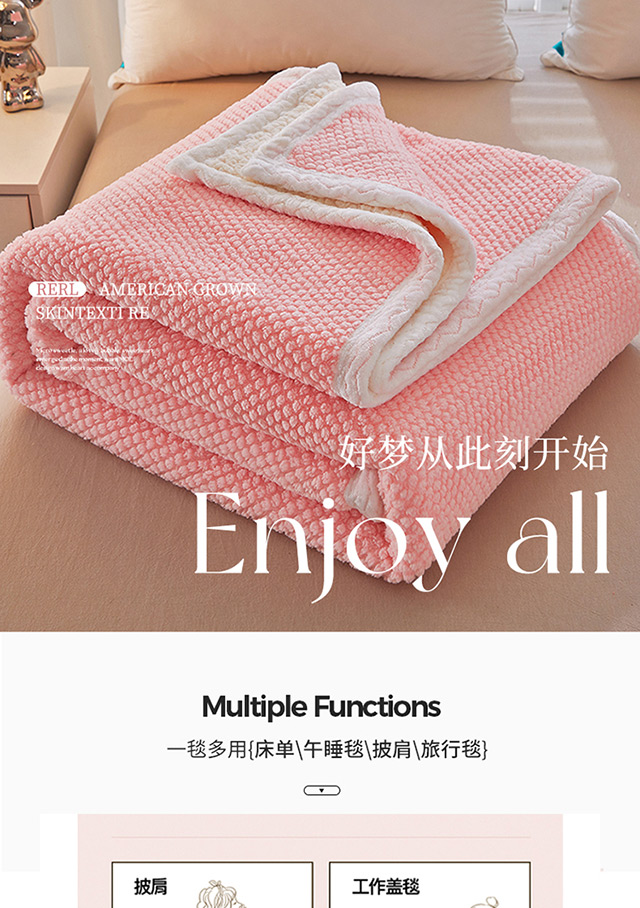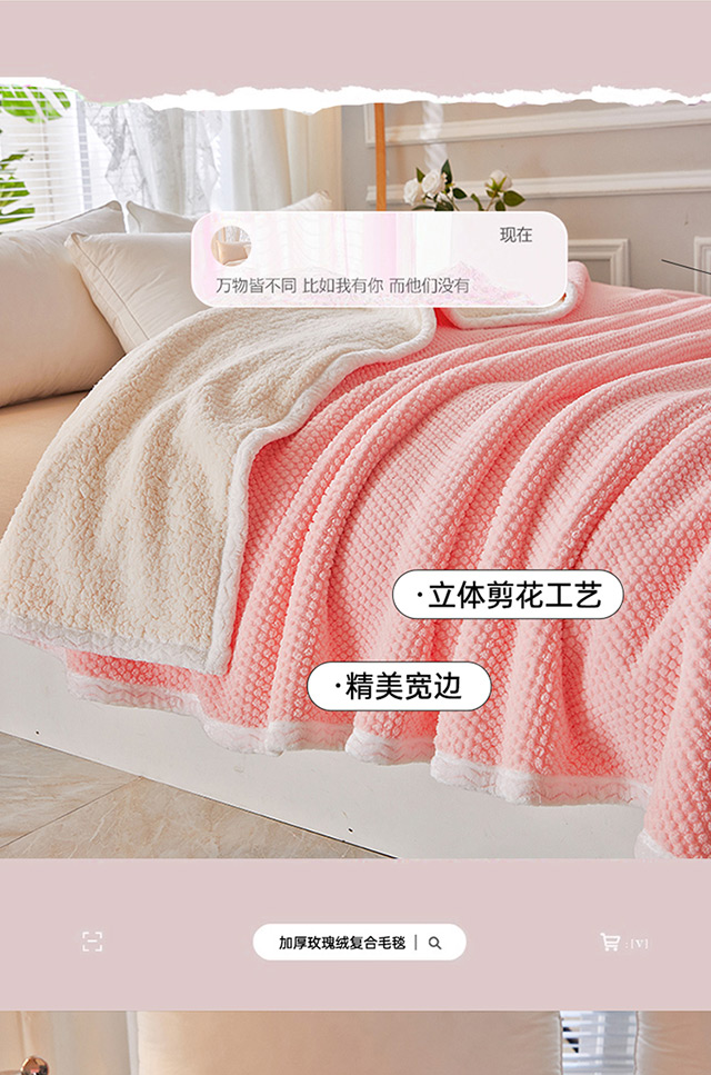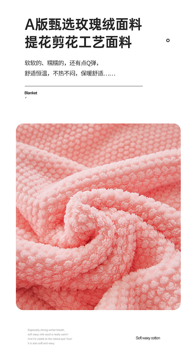 一条适合整个秋冬的毯子,享受每个被爱包裹的瞬间,柔糯亲肤的呵护,是您在这个寒冷季节的伴侣,它将为您的每一天带来温暖与舒适。 面料:玫瑰绒 规格:150*200cm