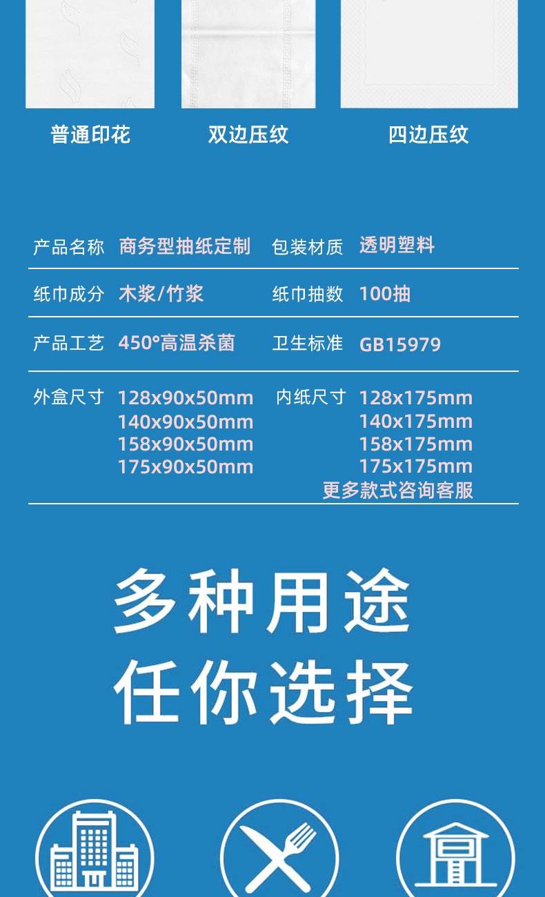 产品尺寸:188*90*52mm 内纸尺寸:188*180mm 净含量:100抽4层(400张) 外箱尺寸:64*50*65cm 主要成分:原生木浆 执行标准:GBT20808 卫生标准:GB15979 卫生许可证:(豫)卫消证字(2024)第0063号 产品等级:合格