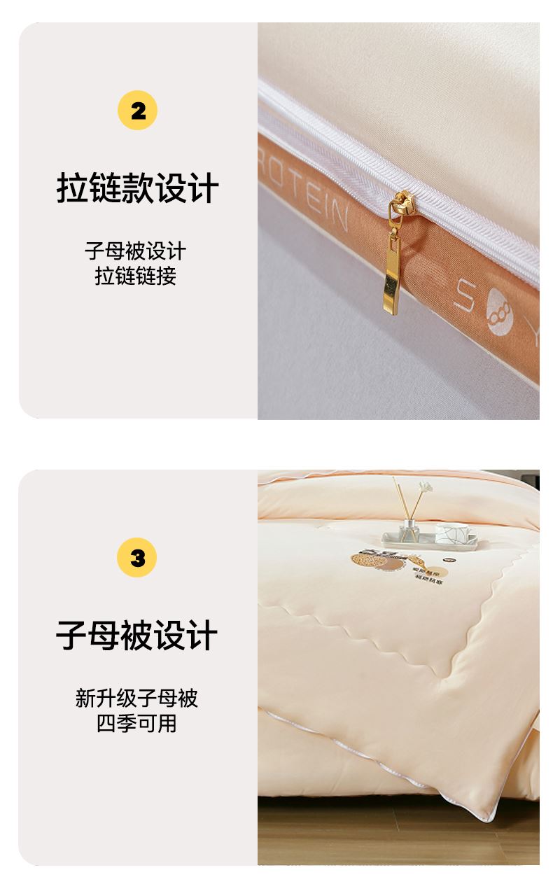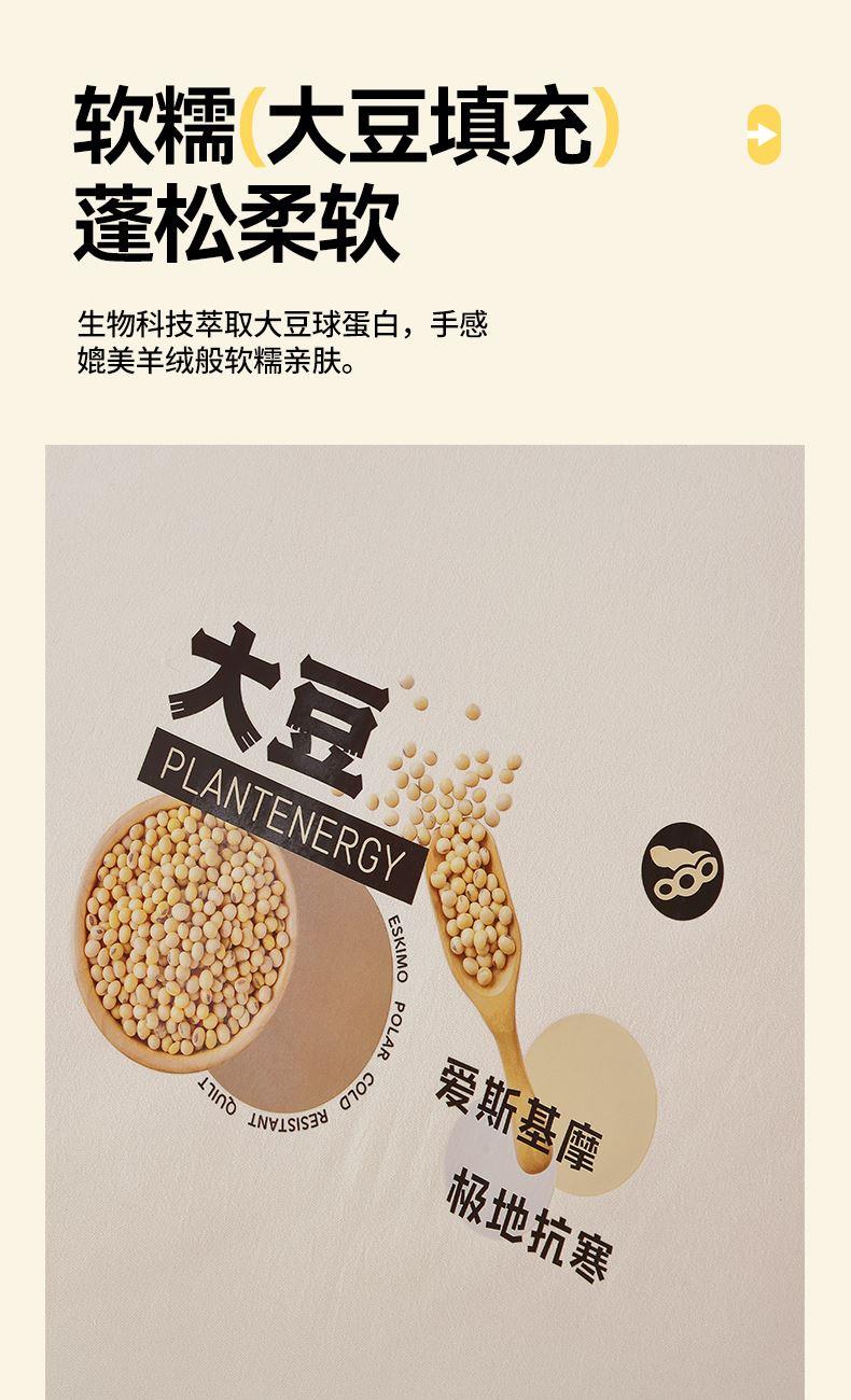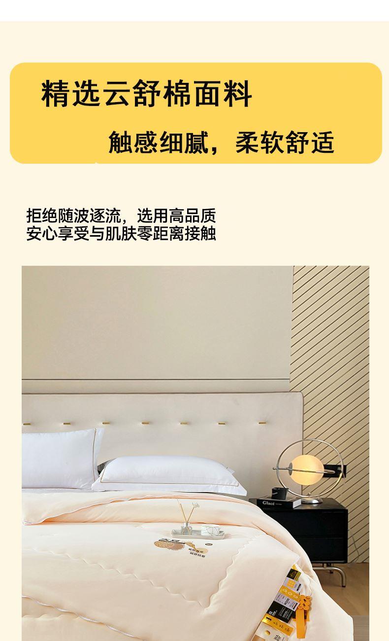 面料材质:云舒棉 填 充:大豆纤维/超细蛋白纤维 产品规格:200*230cm 克 重:母被:3000g,子被:2000g 产品包装:精美软包 特点:云舒棉采用PET高纯度纳米级纤维,经过熔融纺丝技术,触感柔软丝糯,吸湿透气性极好。萃取大豆精华,抵御极寒气候。