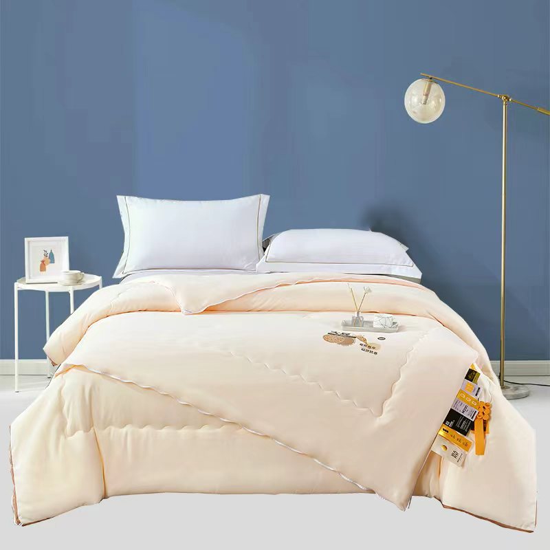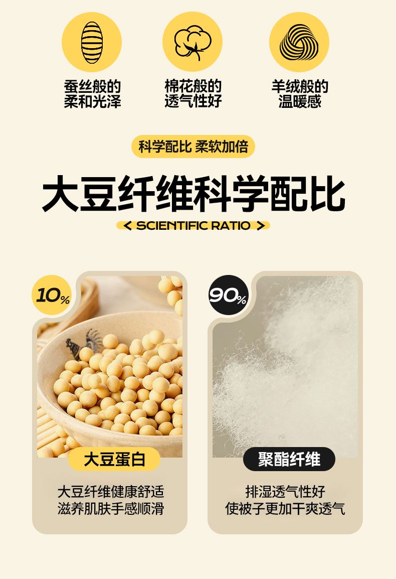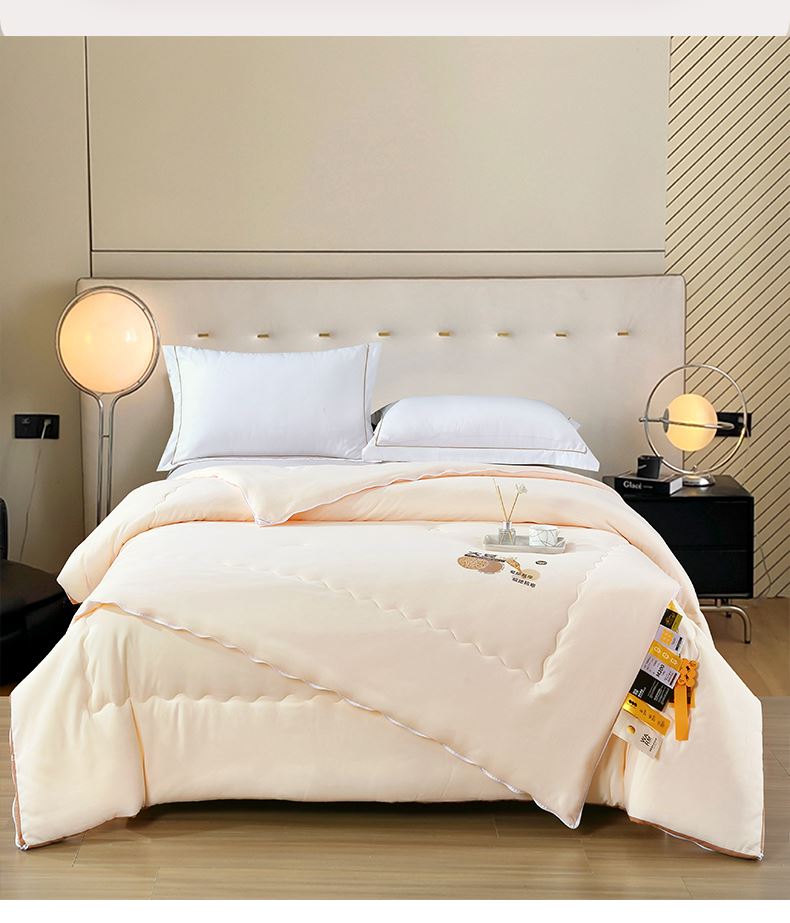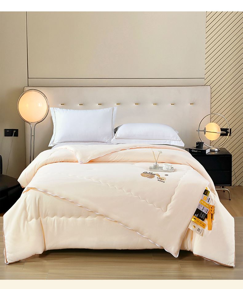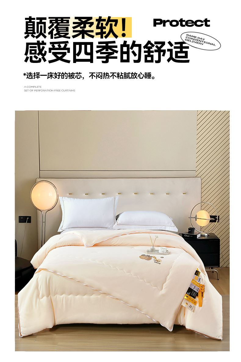 面料材质:云舒棉 填 充:大豆纤维/超细蛋白纤维 产品规格:200*230cm 克 重:母被:3000g,子被:2000g 产品包装:精美软包 特点:云舒棉采用PET高纯度纳米级纤维,经过熔融纺丝技术,触感柔软丝糯,吸湿透气性极好。萃取大豆精华,抵御极寒气候。