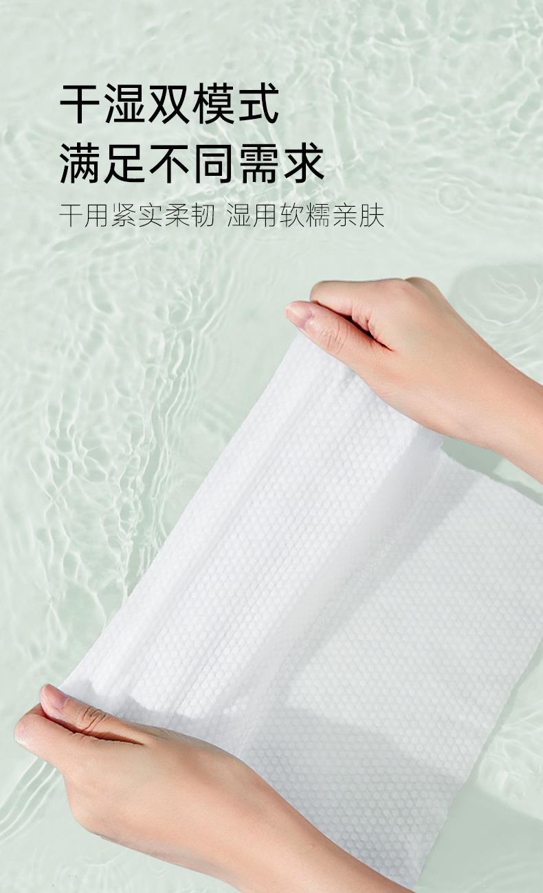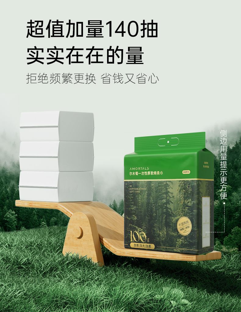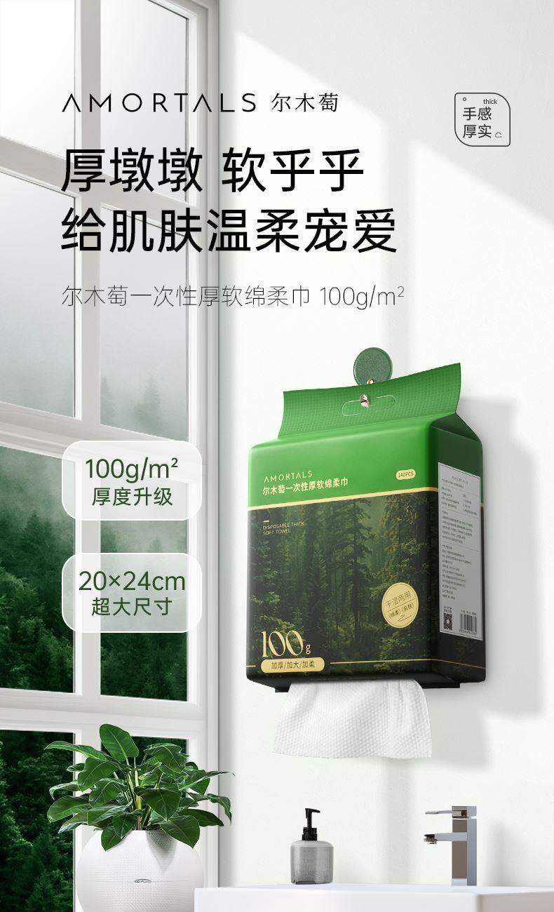 产品:AMORTALS尔木萄一次性厚软绵柔巾 材质:再生纤维素纤维 规格:20x24cm/片 100g/m2 纹理:珍珠纹+平纹净含量:140片/包 加厚100g/m²材质:厚度堪比小方巾,湿水后仍保持强韧,可擦拭3次以上不破裂 珍珠纹压花设计:凹凸表面增强清洁力,卸妆时省力50%,且触感亲肤 悬挂式便捷取用:防水背胶固定,防尘盖设计,抽取不连张,适合浴室潮湿环境 多功能使用:卸妆、洁面、擦镜台均可,敏感肌友好无荧光剂