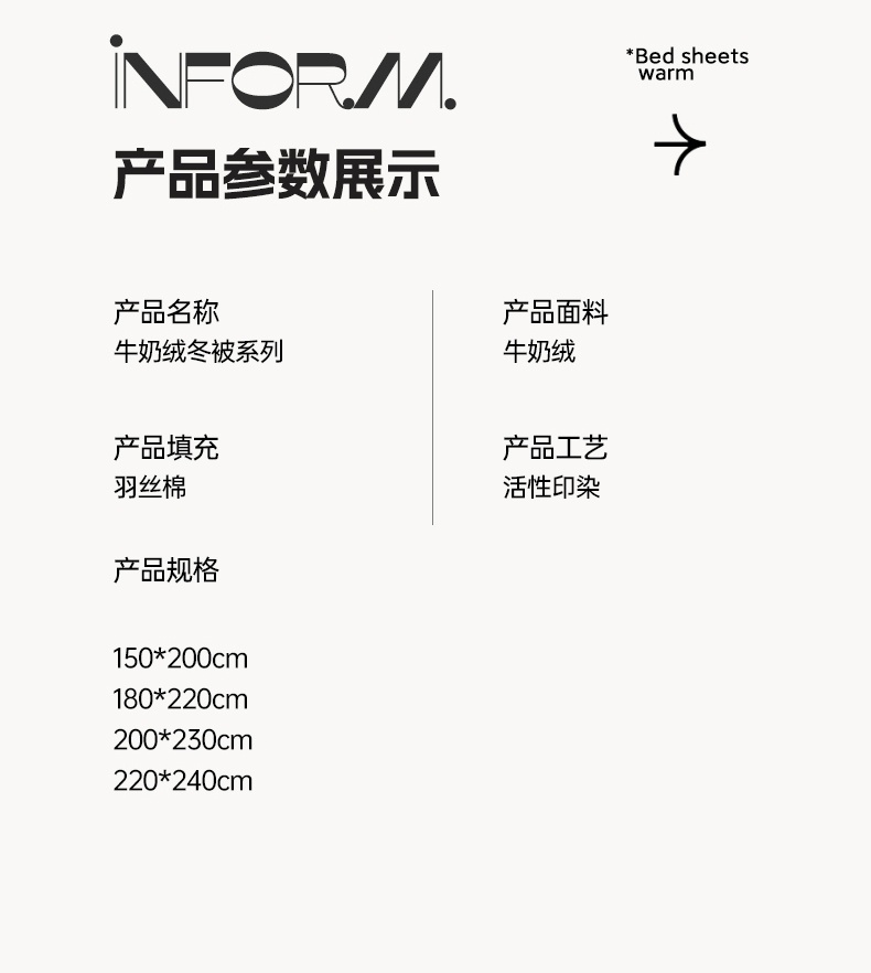 产品规格:150x200cm5斤 花色:咖啡、卡布奇诺、莫兰迪蓝灰、优雅蓝 面料:聚酯纤维 产品卖点:高支高密牛奶绒面料,一触即暖,不易闷热,不易掉毛、丰盈的暖绒触感温柔舒适,整张羽丝棉填充,轻盈舒适,暖而不易闷,将身心都归还于舒适的被窝