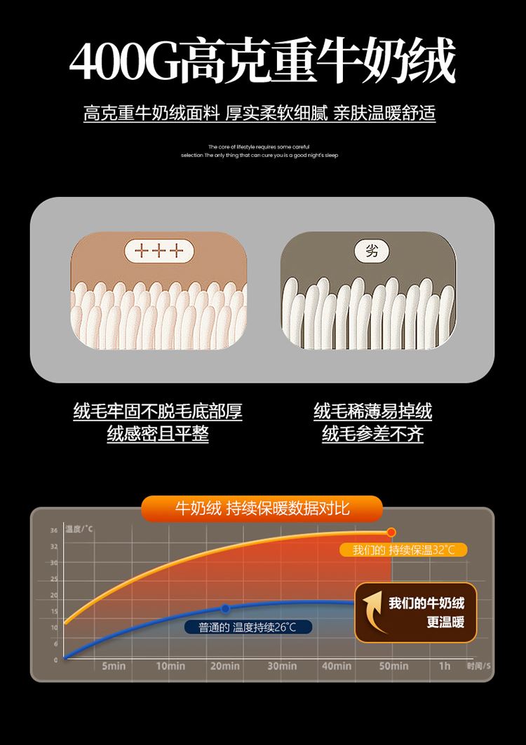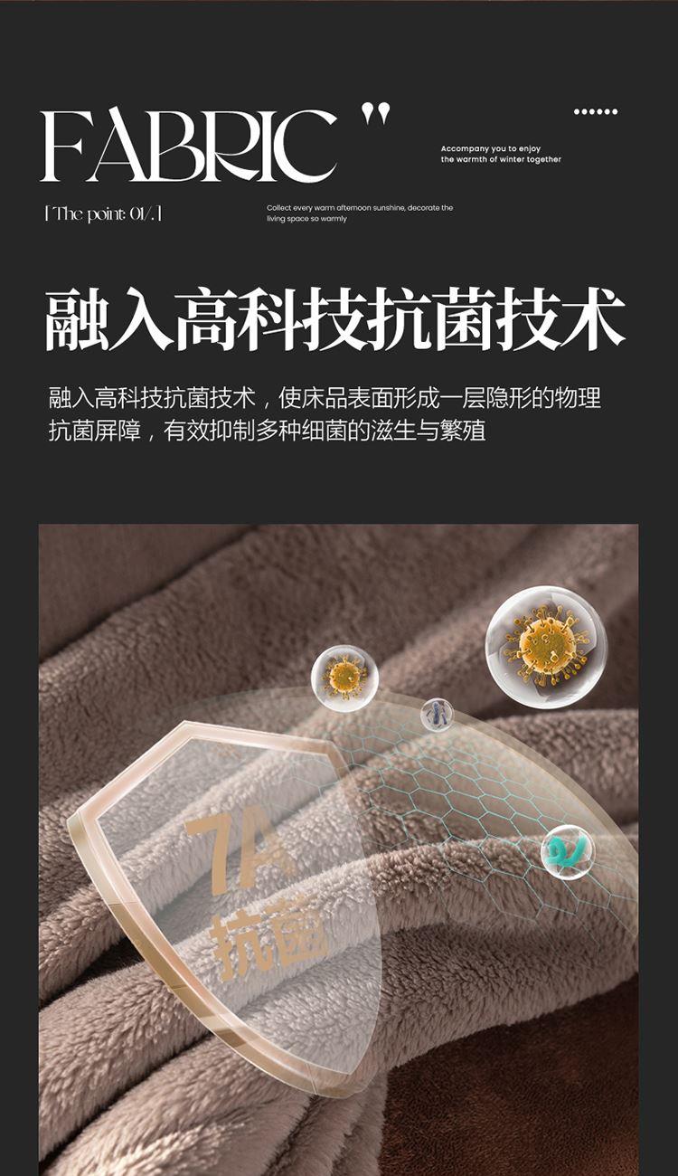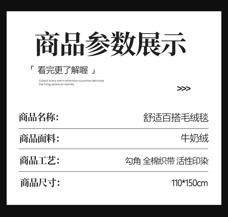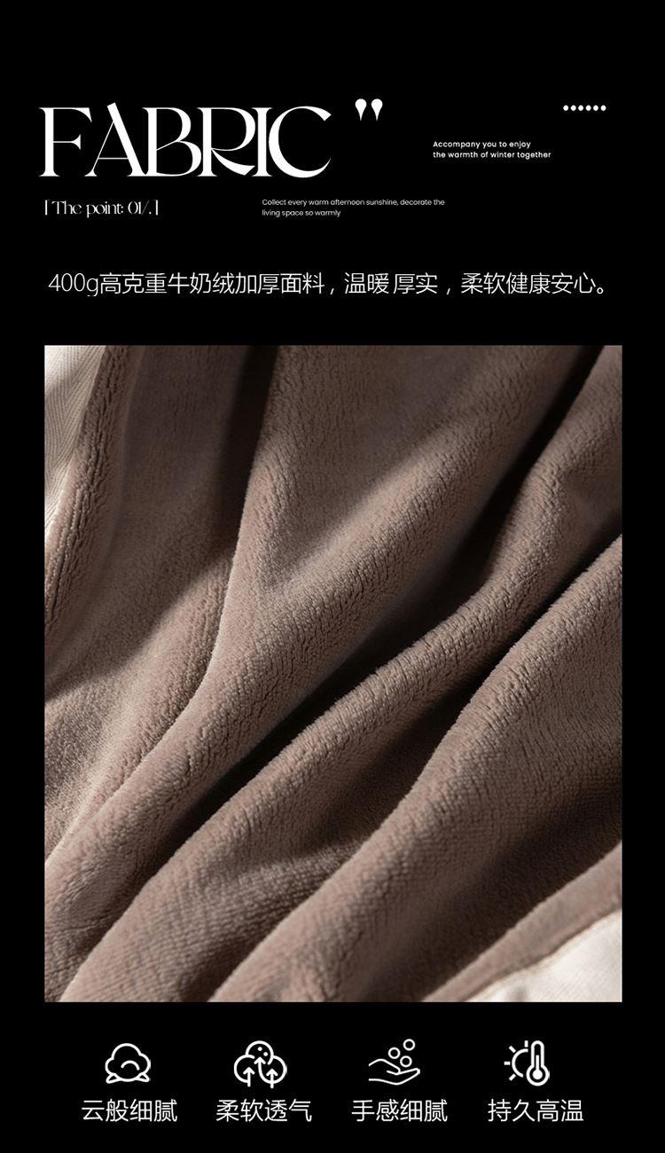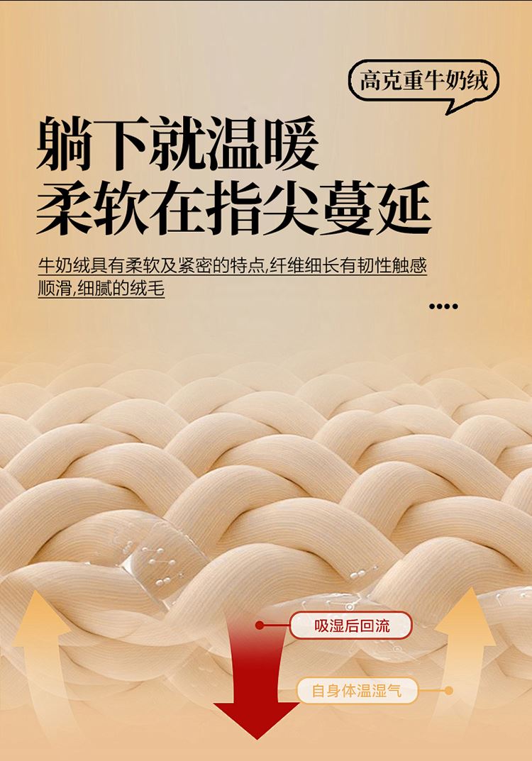 规格:110*150cm 面料:牛奶绒 克重:650g 产品包装:精美礼盒 包装尺寸:42*33*11cm 1.牛奶绒具有柔软及紧密的特点,纤维细长有韧性触感顺滑,躺下就温暖,柔软在指尖蔓延。 2.融入高科技技术,使床品表面形成一层隐形的物理屏障。