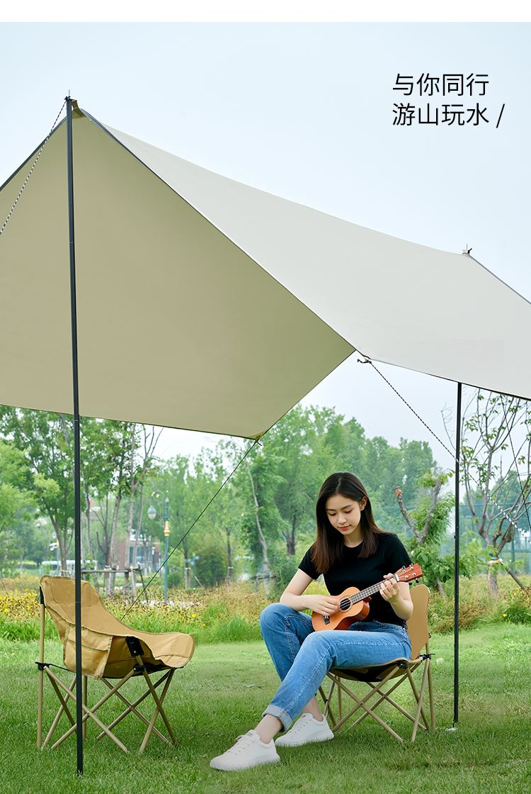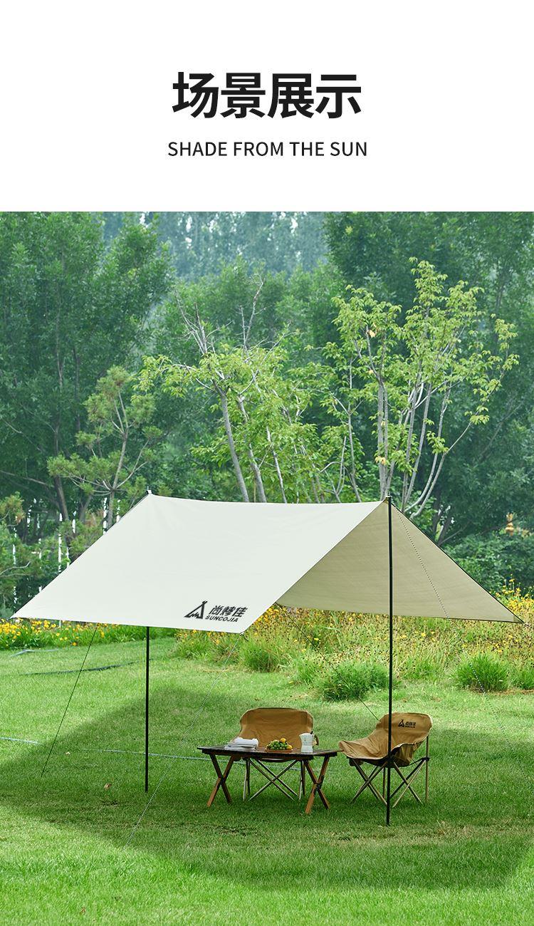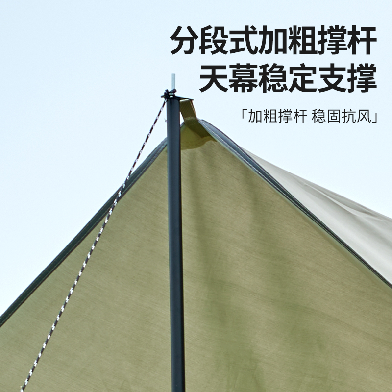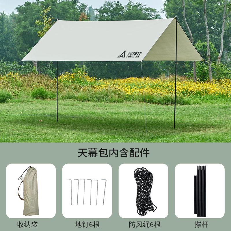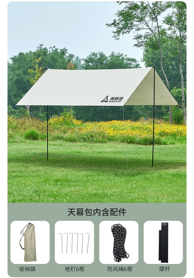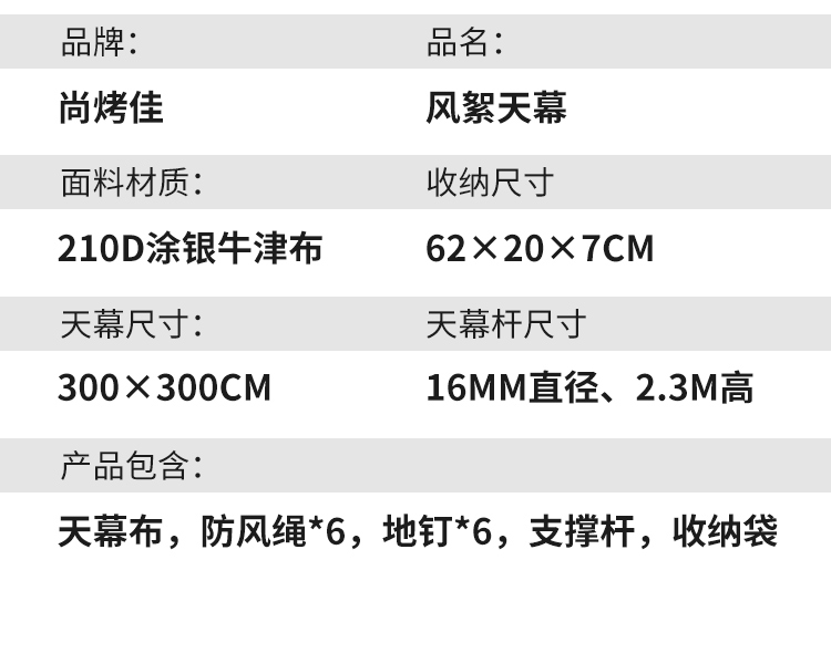 面料材质: 210D涂银牛津布 天幕尺寸: 300x300CM 收纳尺寸 62x20x7CM 天幕杆尺寸 16MM直径、2.3M高 产品包含: 天幕布,防风绳*6,地钉*6,支撑杆,收纳袋