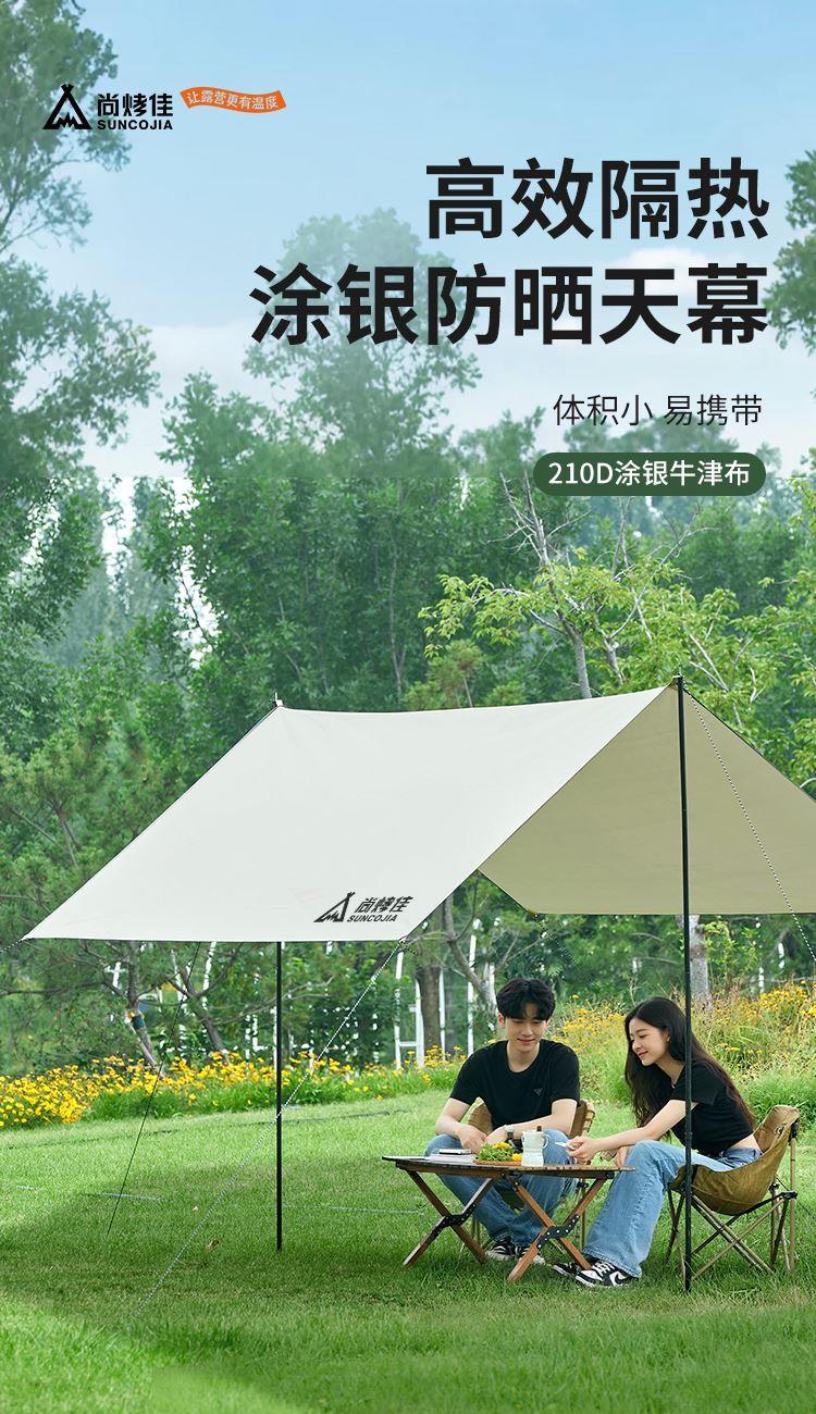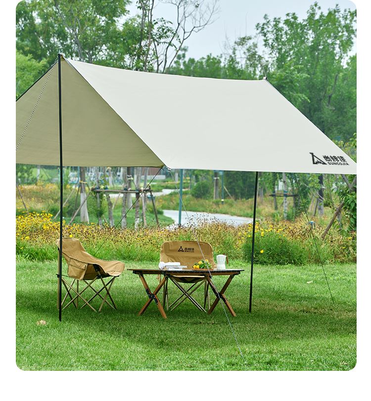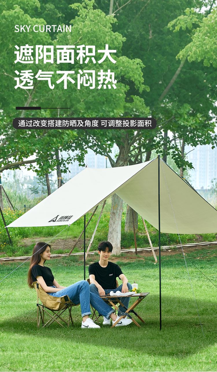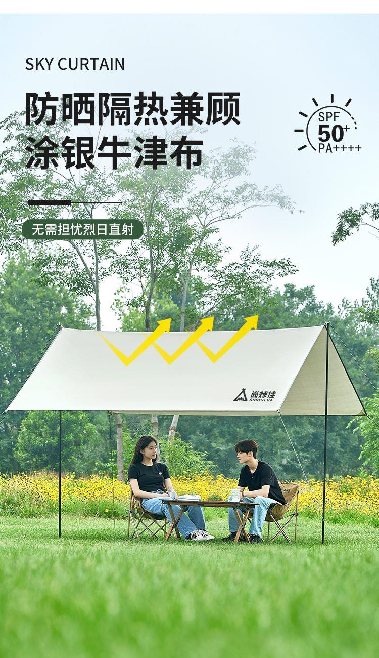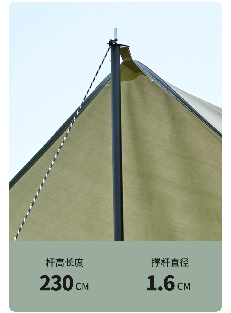 面料材质: 210D涂银牛津布 天幕尺寸: 300x300CM 收纳尺寸 62x20x7CM 天幕杆尺寸 16MM直径、2.3M高 产品包含: 天幕布,防风绳*6,地钉*6,支撑杆,收纳袋