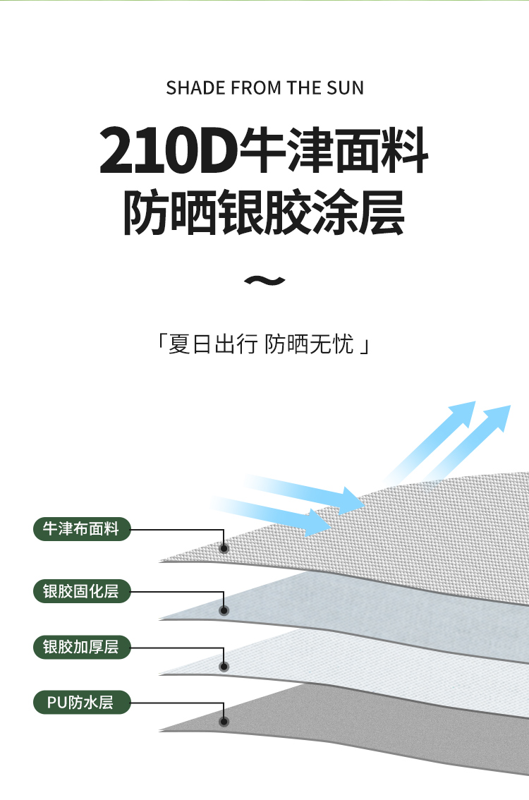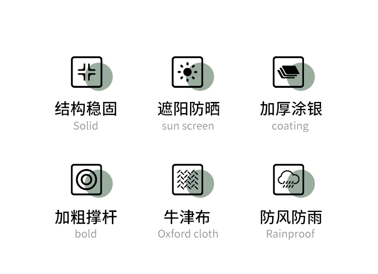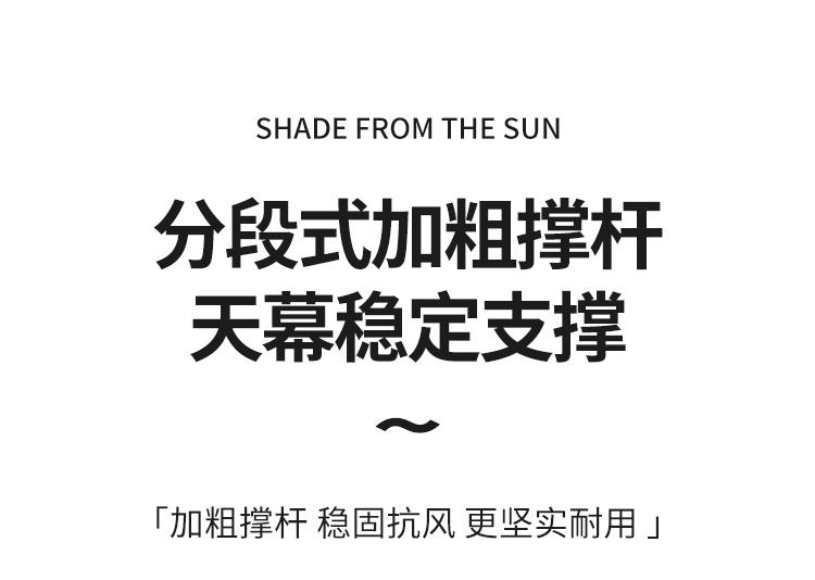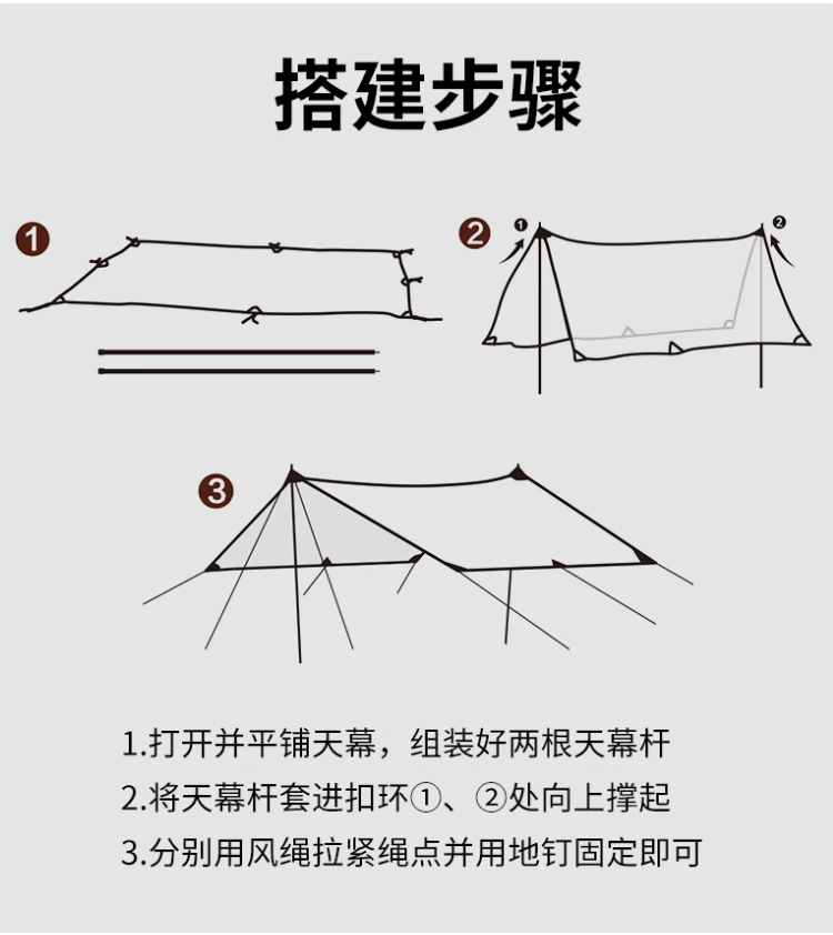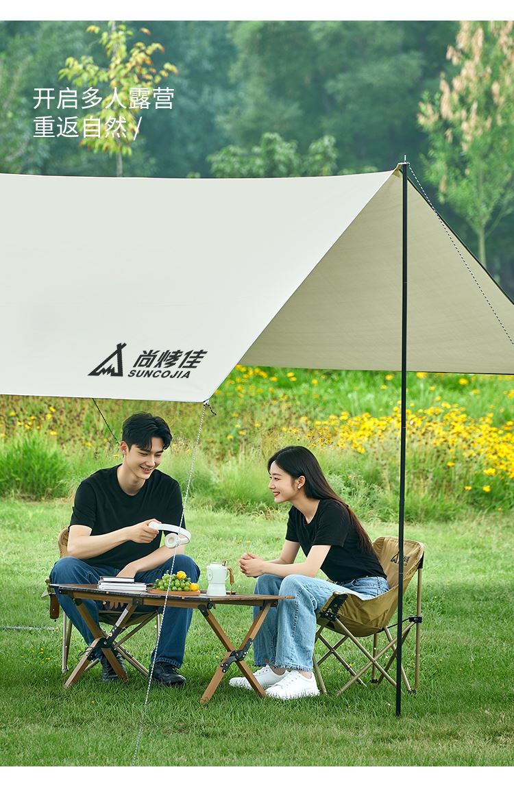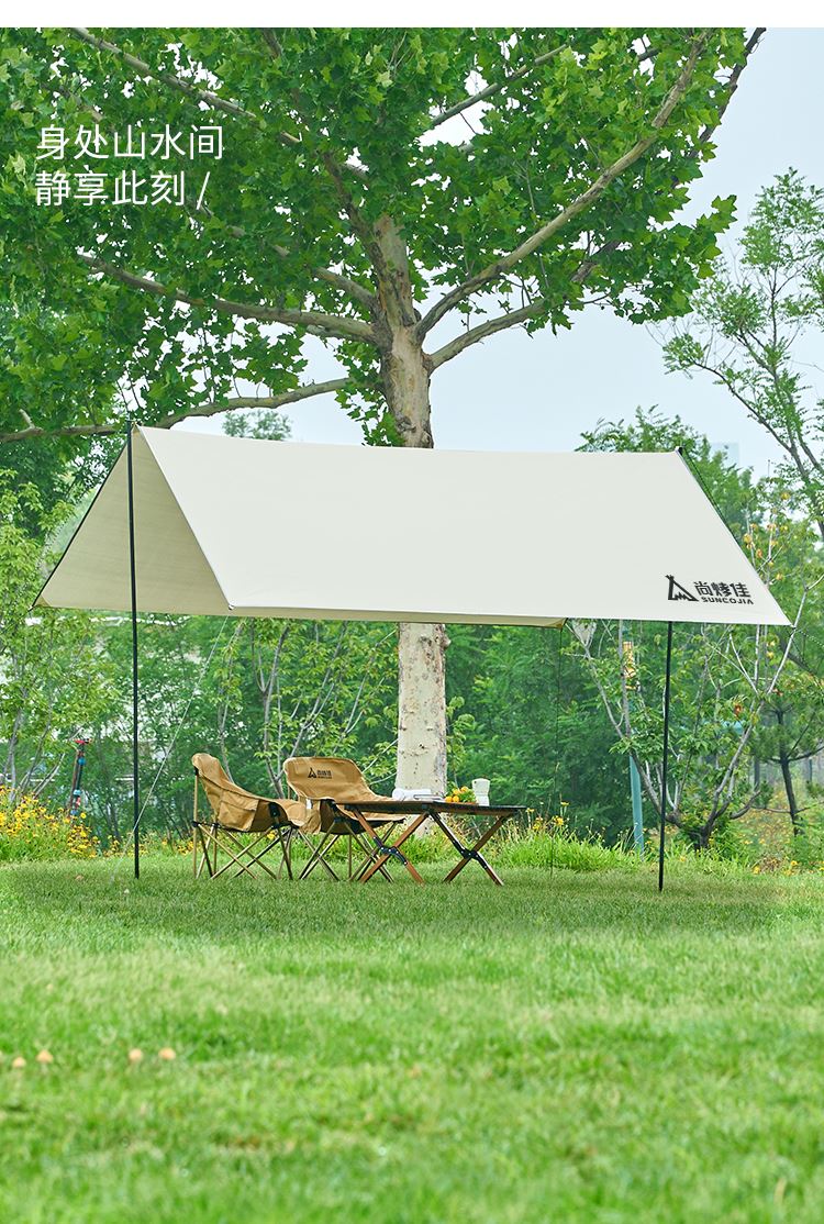 面料材质: 210D涂银牛津布 天幕尺寸: 300x300CM 收纳尺寸 62x20x7CM 天幕杆尺寸 16MM直径、2.3M高 产品包含: 天幕布,防风绳*6,地钉*6,支撑杆,收纳袋