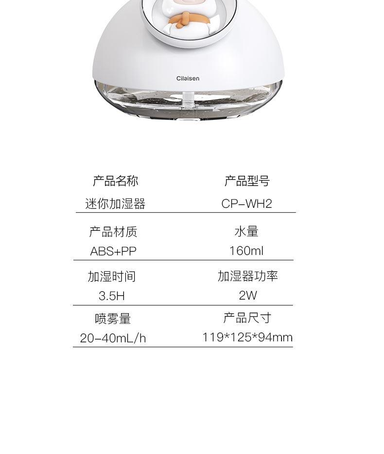 产品参数: 产品型号:CP-WH2 额定输入:5V⎓ 额定功率:2W 水箱容量:160mL 商品条码 : 6972831860662 产品尺寸 : 119X125X94mm 包装尺寸:120X120X100mm 产品毛重 : 200g 包装清单:主机x1、USB电源线x1、说明书x1 核心卖点: 1、细腻水雾,补水滋润,出雾量大,范围更广 2、小身材大能量,ABS+PP材质 3、居家办公,多场景使用 4、七彩渐变氛围灯,点亮环境,滋润一整屋 5、低音体验,安静好眠 6、便捷加水,宽大加水口 7、一键开/关,简单操作