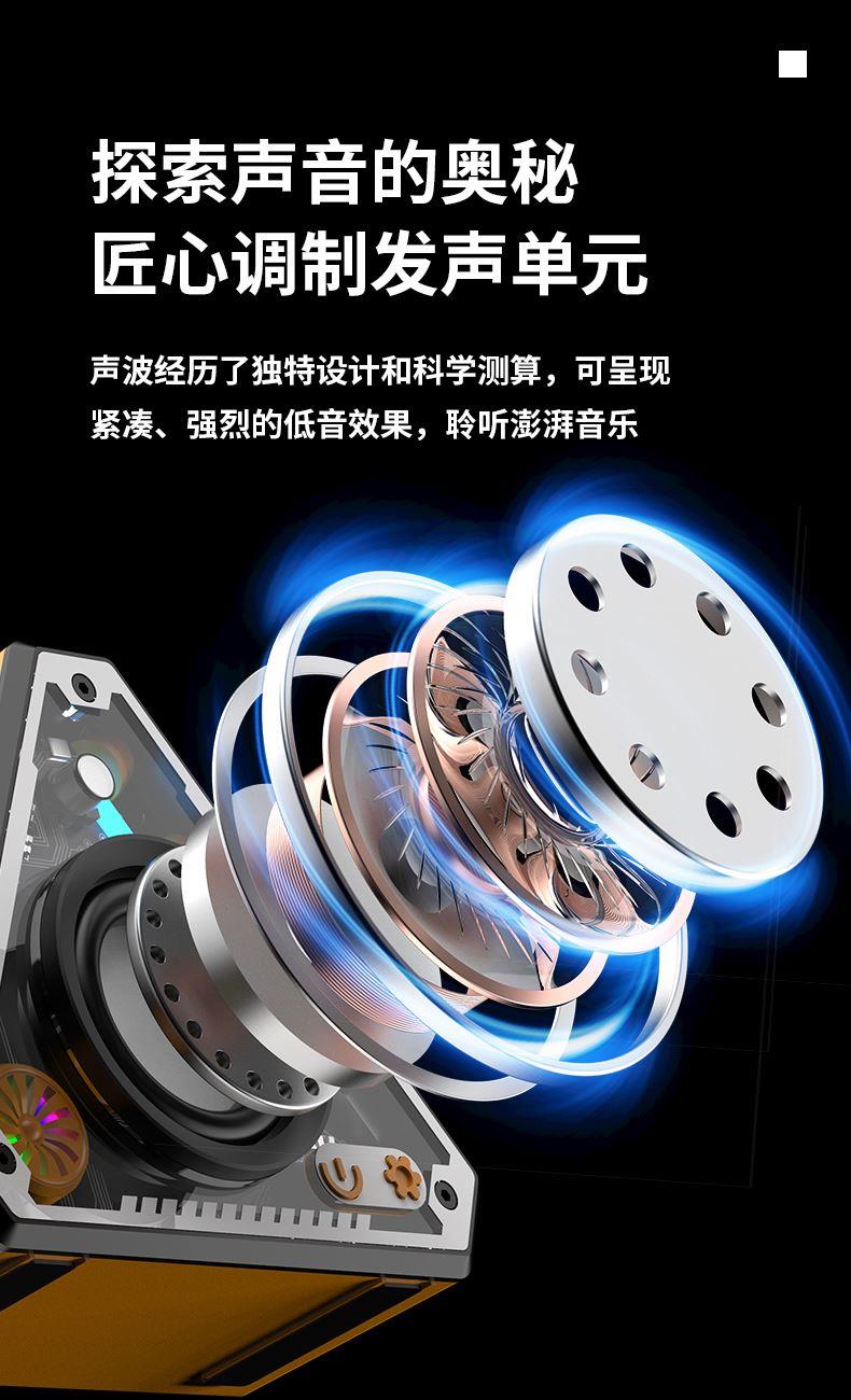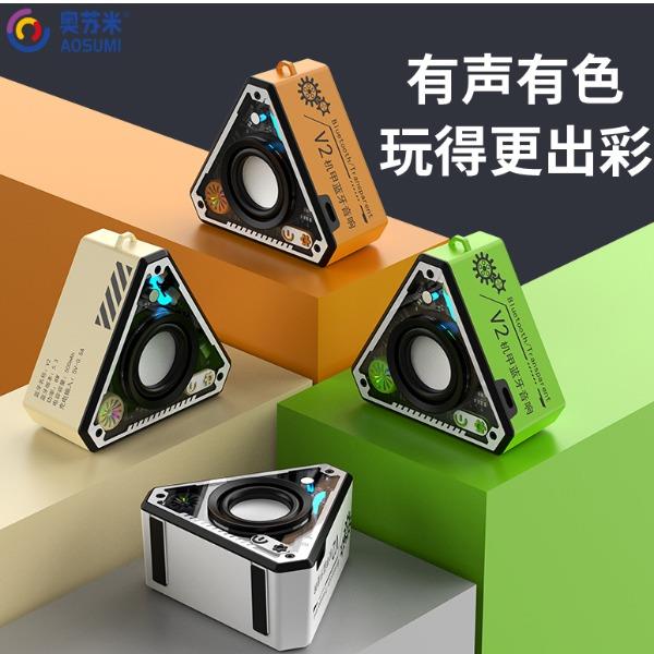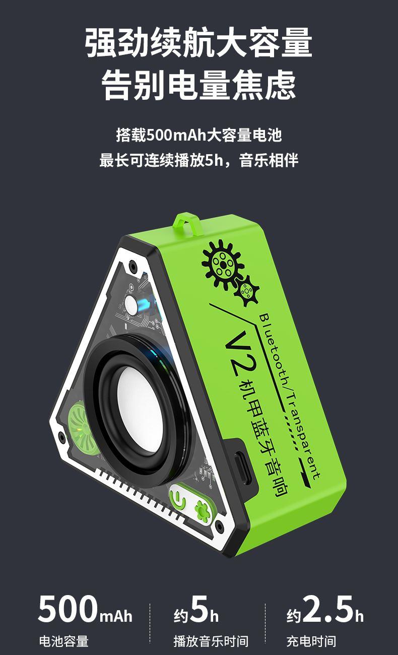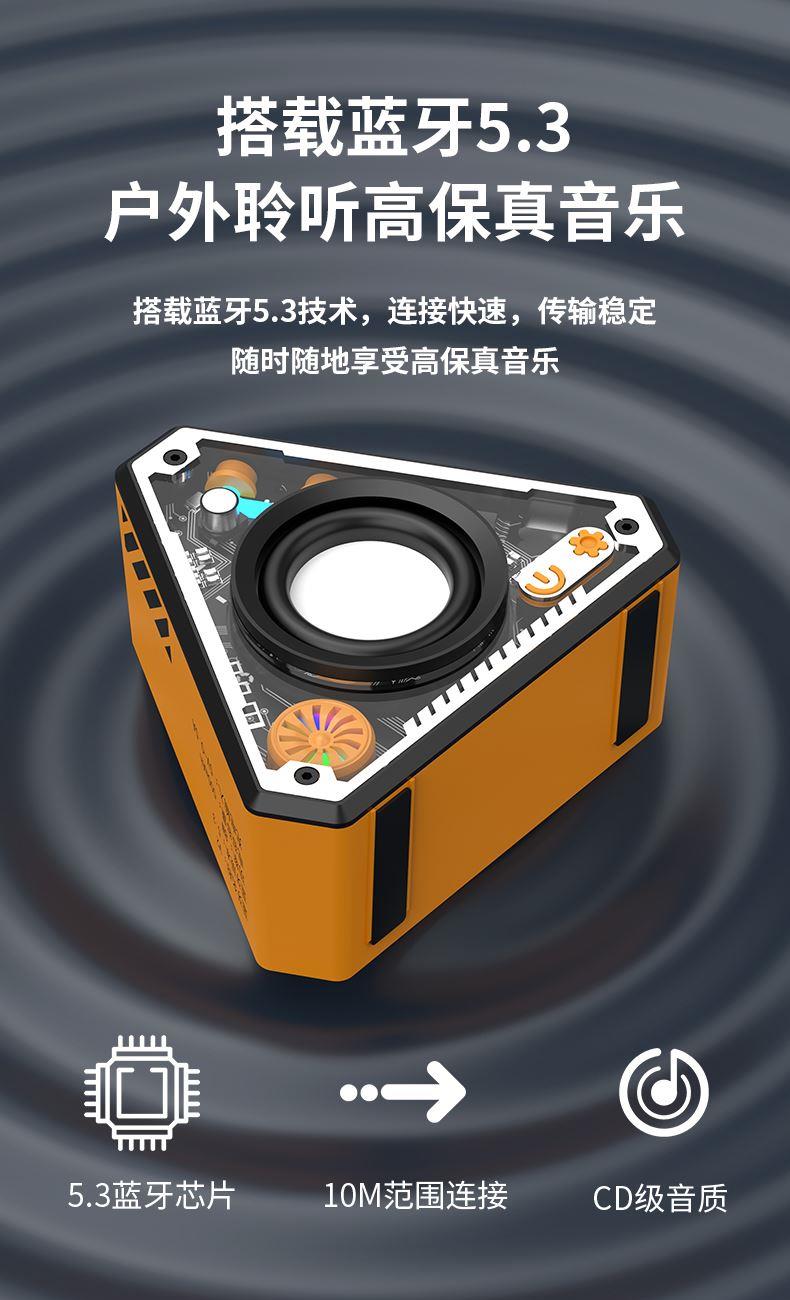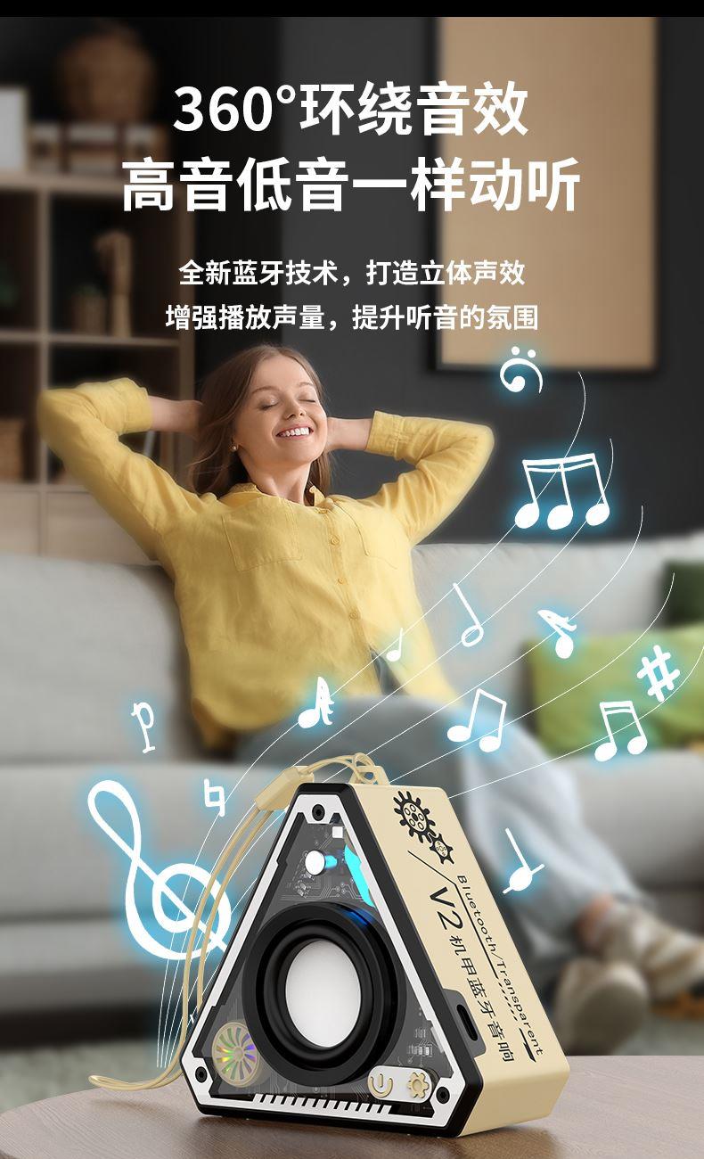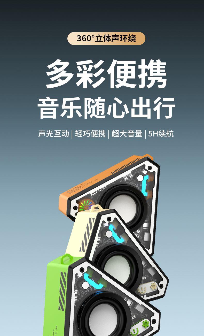 酷炫机甲户外便携蓝牙音响 颜色:米色 白色 橙色 绿色 材质:ABS+硅胶 尺寸:95*86*45mm 包装:彩盒包装 【功能特点】: 炫彩氛围灯音质一级棒 蓝牙连接/插卡播放 5.3蓝牙芯片连接稳定 360度环绕立体音质