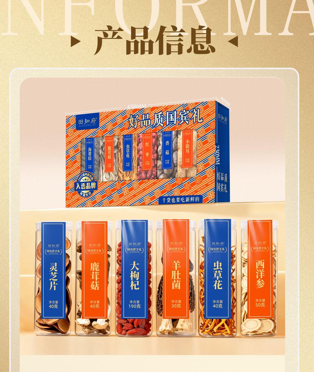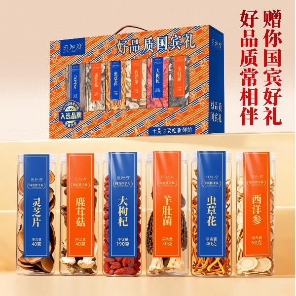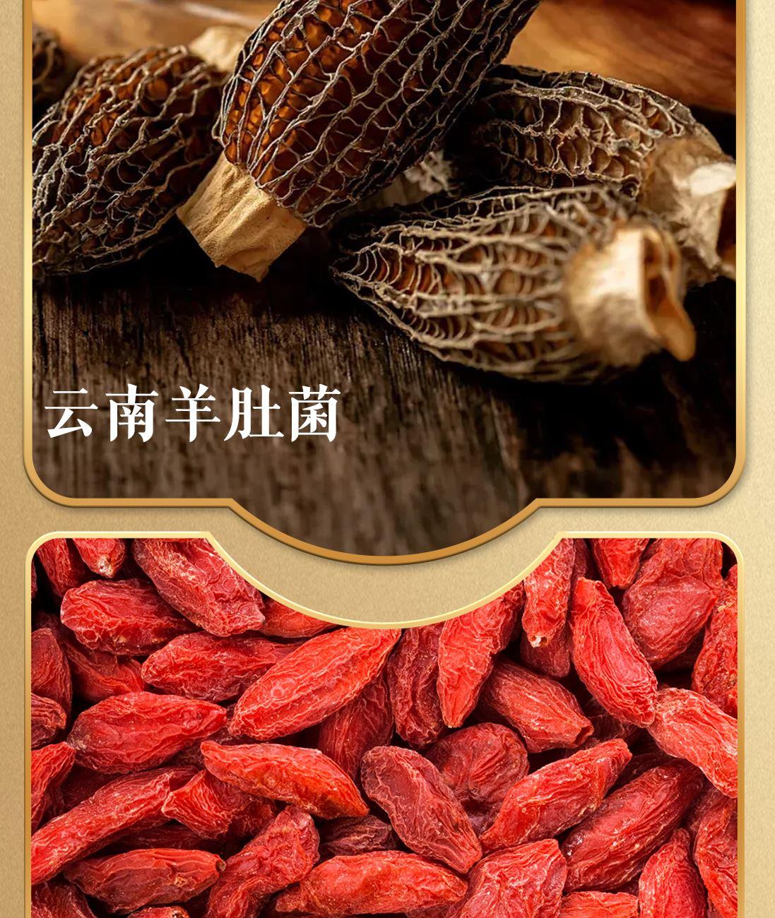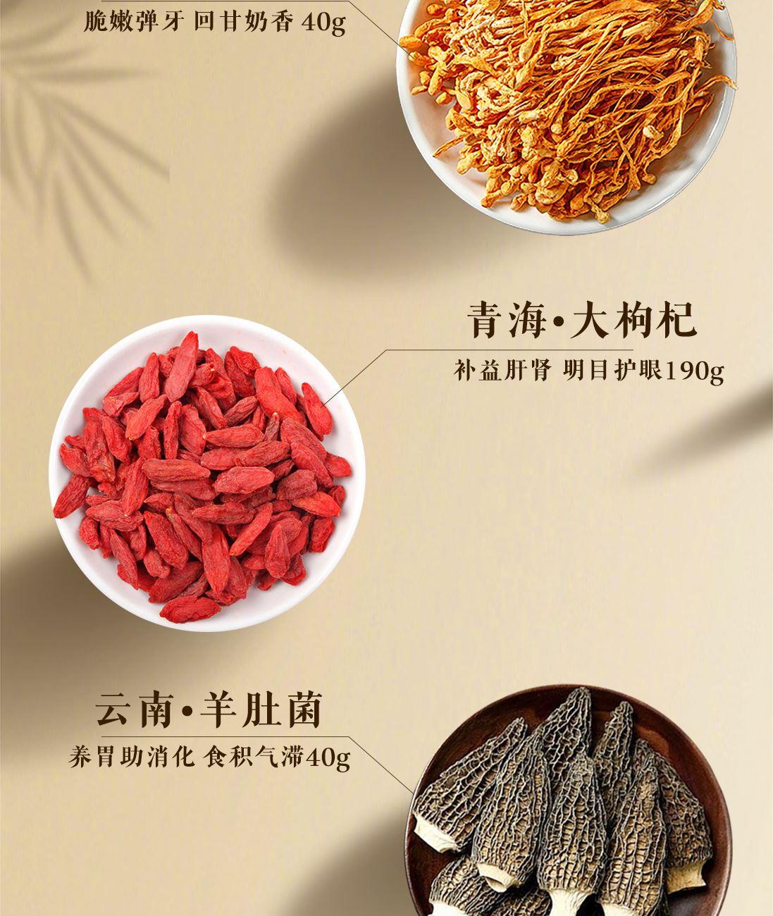 配置:灵芝片40g、鹿茸菇40g、西洋参50g、羊肚菌30g、虫草花40g、青海大枸杞190g 商品规格:390g/盒 产品尺寸:450*230*90mm 保质期:12个月 京东自营销量好评1w+,源头工厂,支持项目授权,项目保护