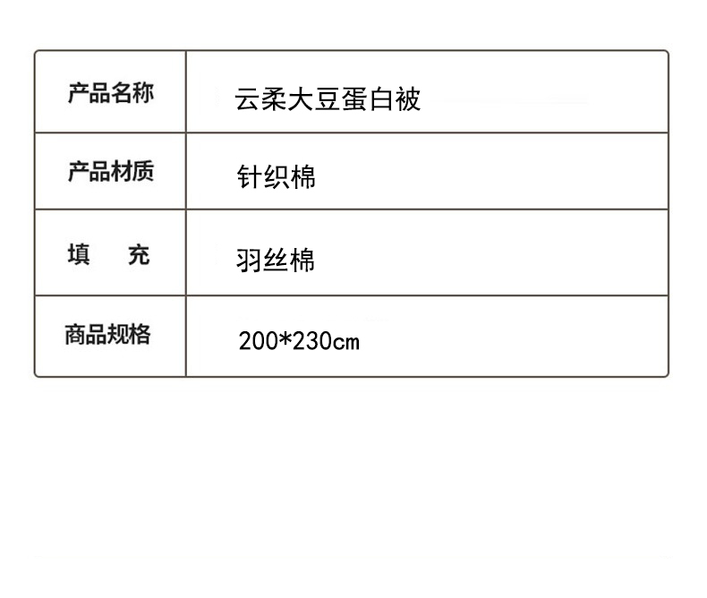 面料材质:针织棉 填 充:羽丝棉 产品规格:200*230cm 克 重:2000g 产品包装:精美礼盒 包装尺寸:50*40*20cm 1.针织棉面料质地较薄、较轻,吸水性和透气性能较好。 2.针织棉面料不容易缩水,还具有快洗易干的特点。