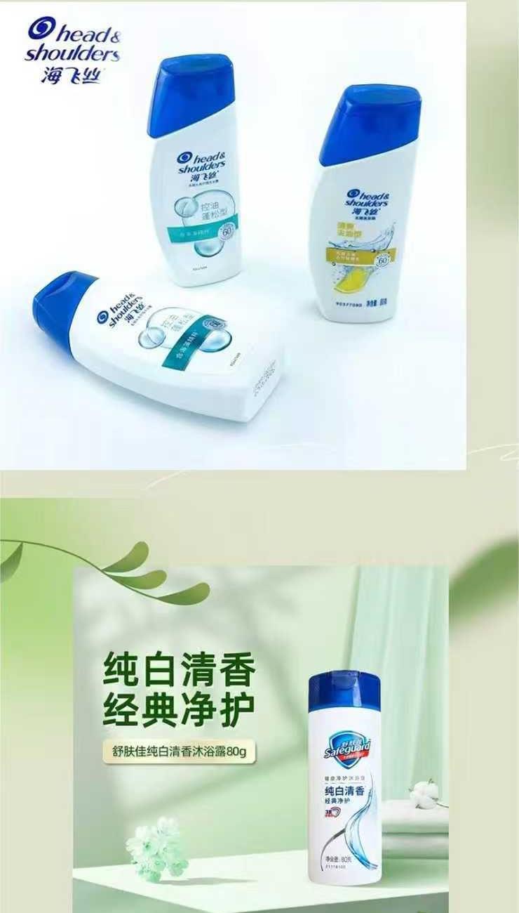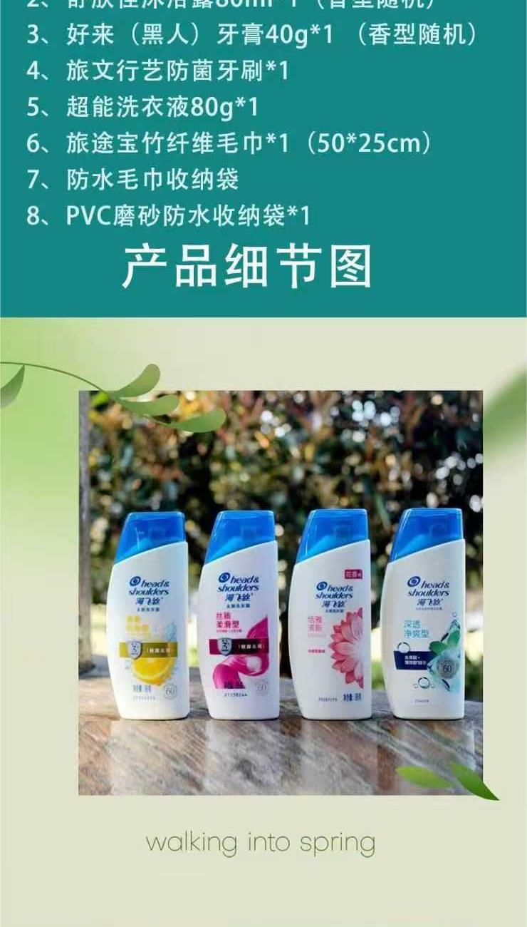 1、海飞丝洗发水80ml*1 2、舒肤佳沐浴露80ml*1(香型随机) 3、好来(黑人)牙膏40g*1 (香型随机) 4、旅文行艺牙刷*1 5、超能洗衣液80g*1 6、旅途宝竹纤维毛巾*1(50*25cm) 7、防水毛巾收纳袋 8、PVC磨砂防水收纳袋*1 这款产品套装涵盖了清洁护理用品和个人旅行配件,为您提供全面的日常护理和旅行保障。其中包括海飞丝洗发水、舒肤佳沐浴露、好来(黑人)牙膏等高品质的个人洗护产品,以及旅文行艺牙刷、超能洗衣液、旅途宝竹纤维毛巾等实用工具。同时,我们还提供了防水毛巾收纳袋和PVC磨砂防水收纳袋等物品整理解决方案。这些产品既实用又美观,让您的生活更便捷、舒适和安全。