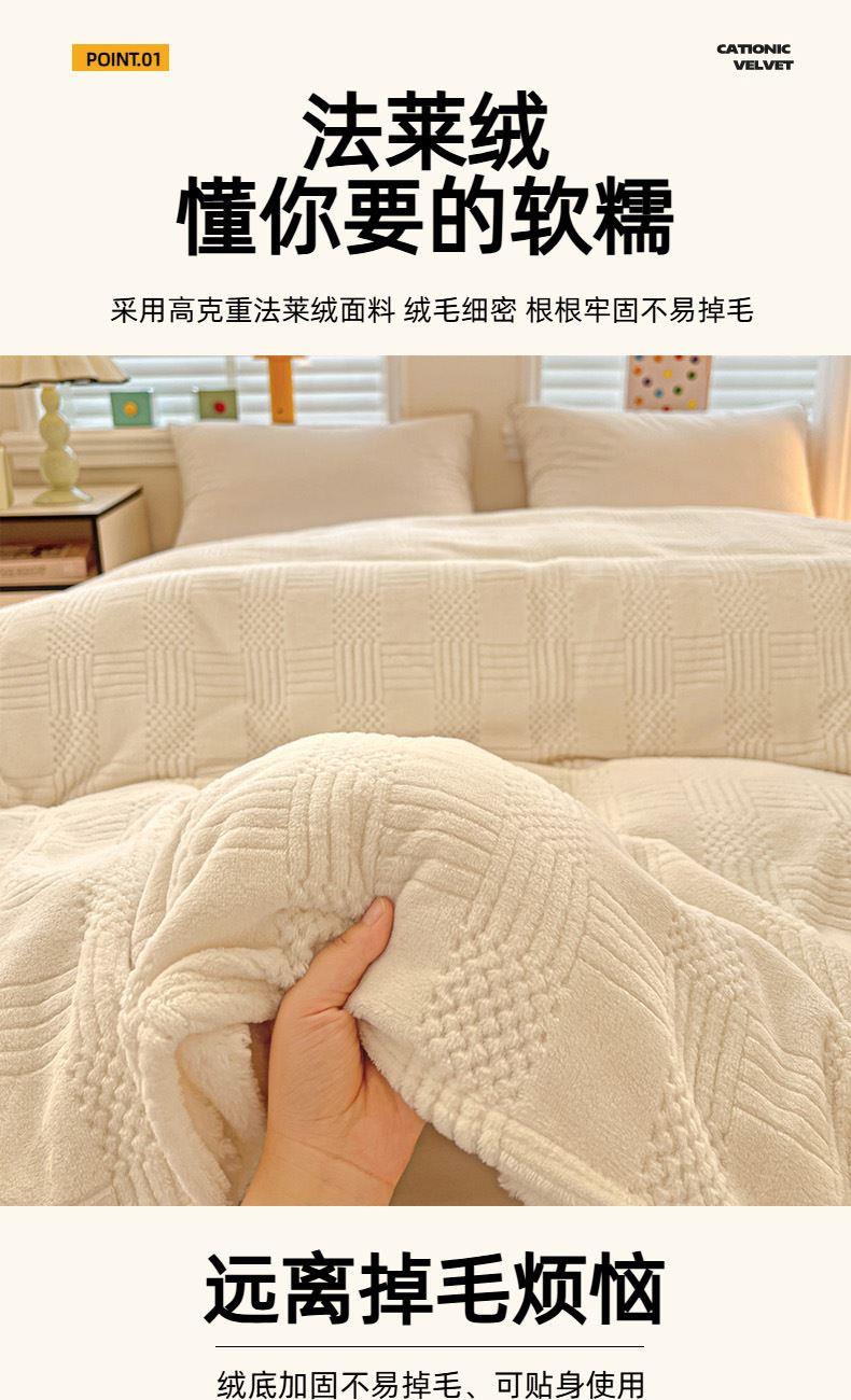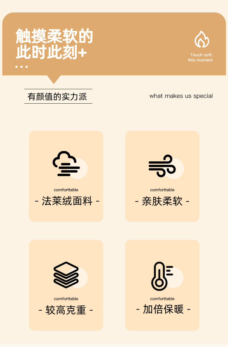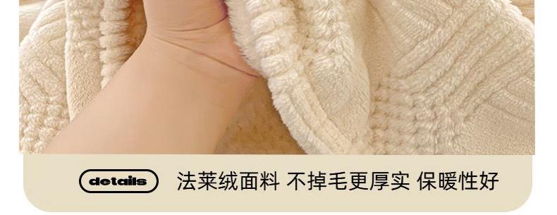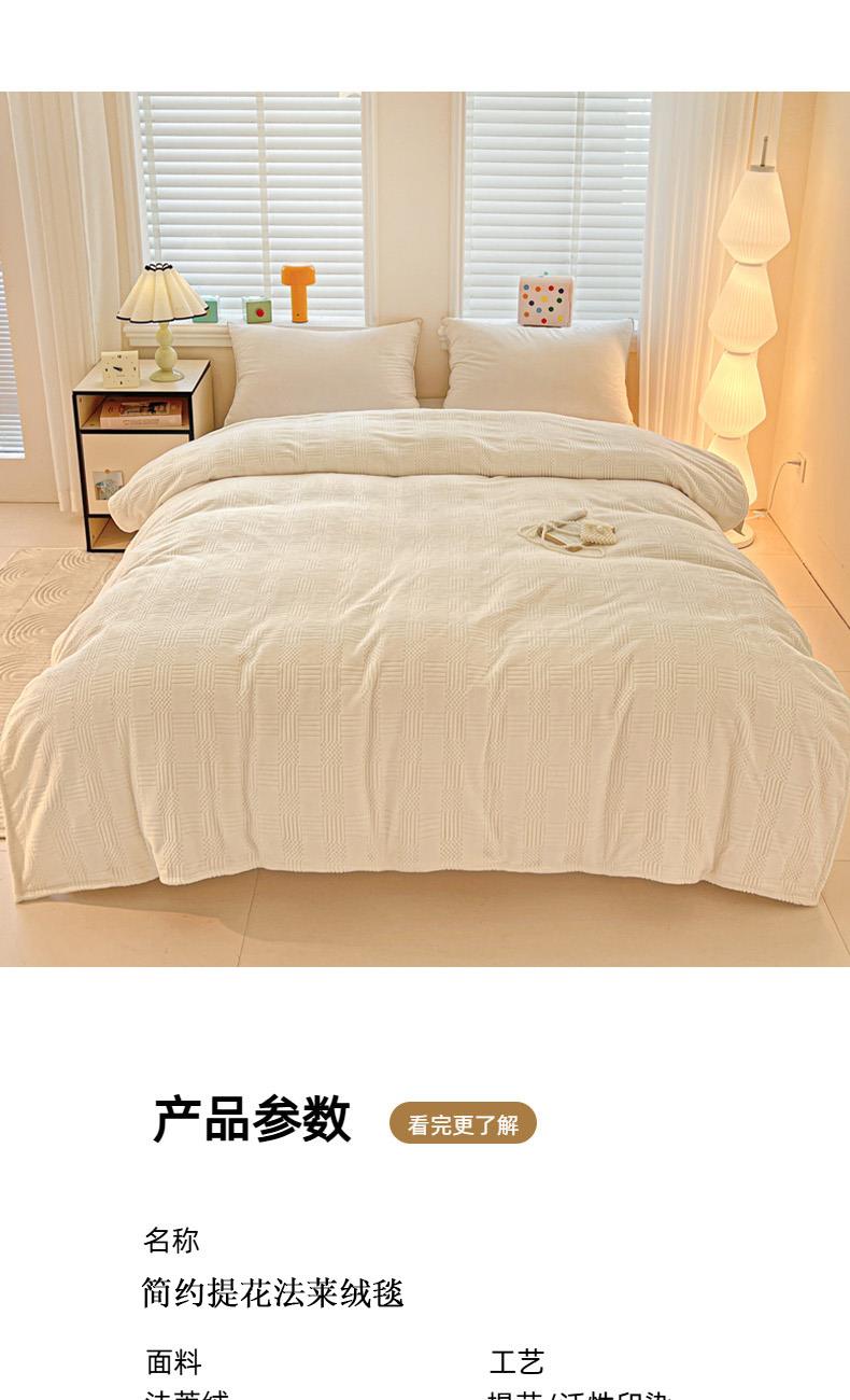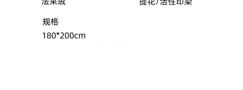 [ 货号 ]:NT-M25502 [ 规格 ]:180*200cm [ 面料 ]:法莱绒 [ 克重 ]:950g 特点:法莱绒面料保暖性好,柔软舒适,触感细腻,亲肤性佳。抗皱性强,耐磨损,可机洗、水洗,日常保养简单。