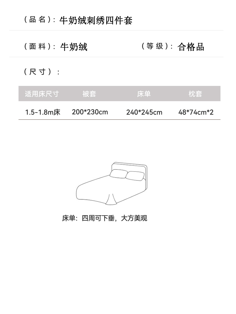 被套:200*230cm 床单:240*245cm 枕套:48*74cm*2 面料:牛奶绒 产品包装:精美软包 包装尺寸:50*40*20cm 特点:牛奶绒面料,充分吸收汗气蒸发产生的热量,舒适透气,精美大方,绒感细腻,呵护您娇嫩肌肤新型植绒技术,绒毛结构丰盈紧实,不易掉毛告别掉毛烦恼。
