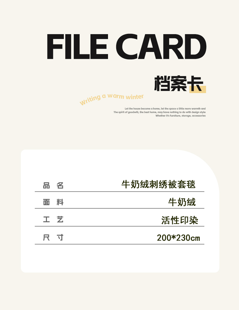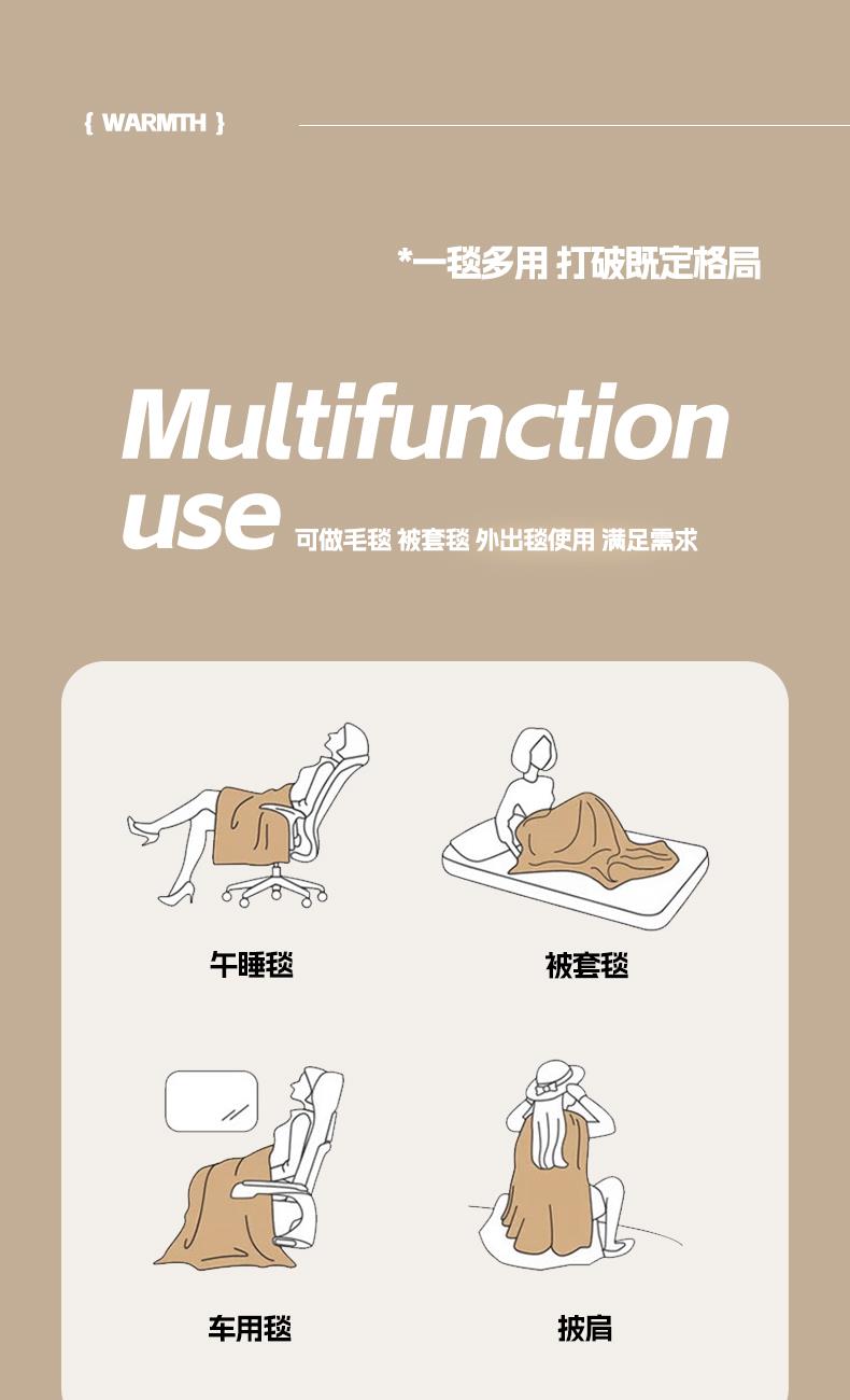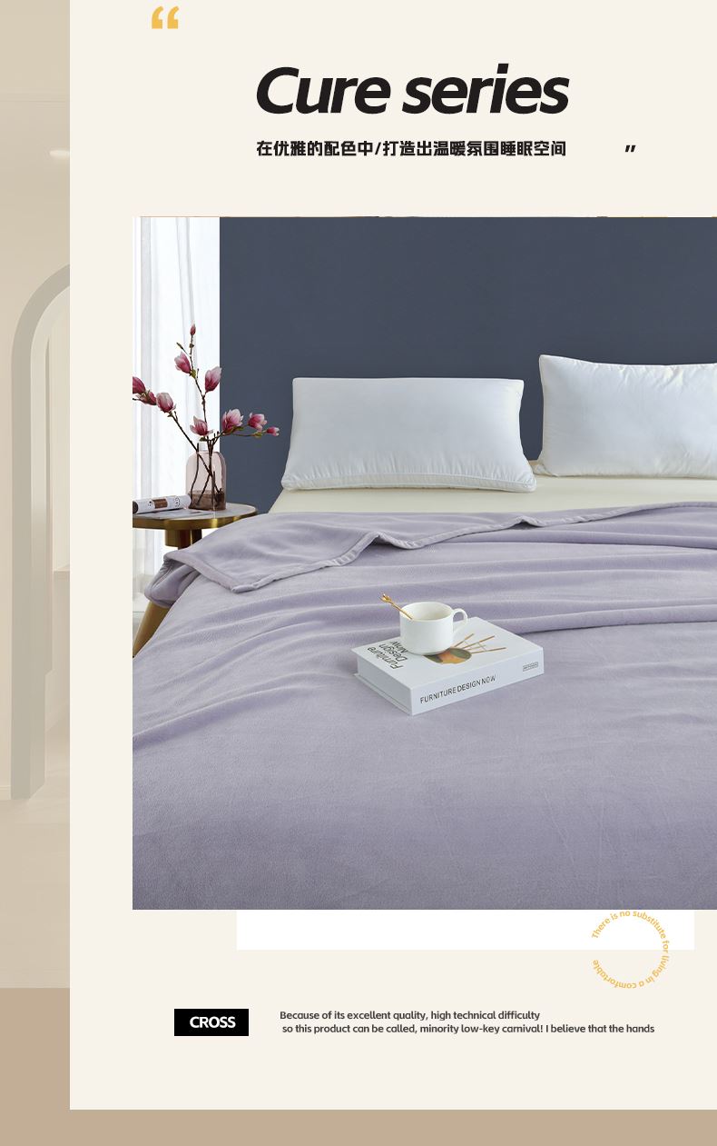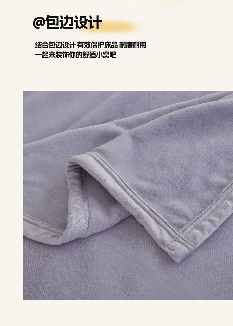 规格:200*230cm 面料:牛奶绒 克重:2200g 产品包装:精美礼盒 包装尺寸:48*35*16cm 特点:牛奶绒面料,充分吸收汗气蒸发产生的热量, 舒适透气,精美大方,绒感细腻,呵护您娇嫩 肌肤新型植绒技术,绒毛结构丰盈紧实,不 易掉毛告别掉毛烦恼。