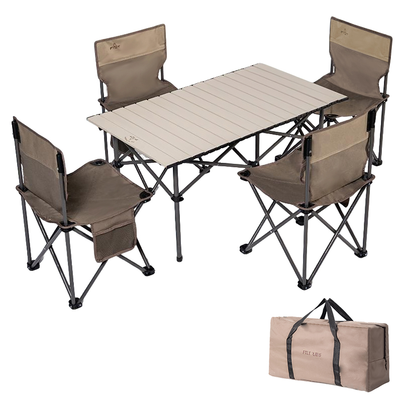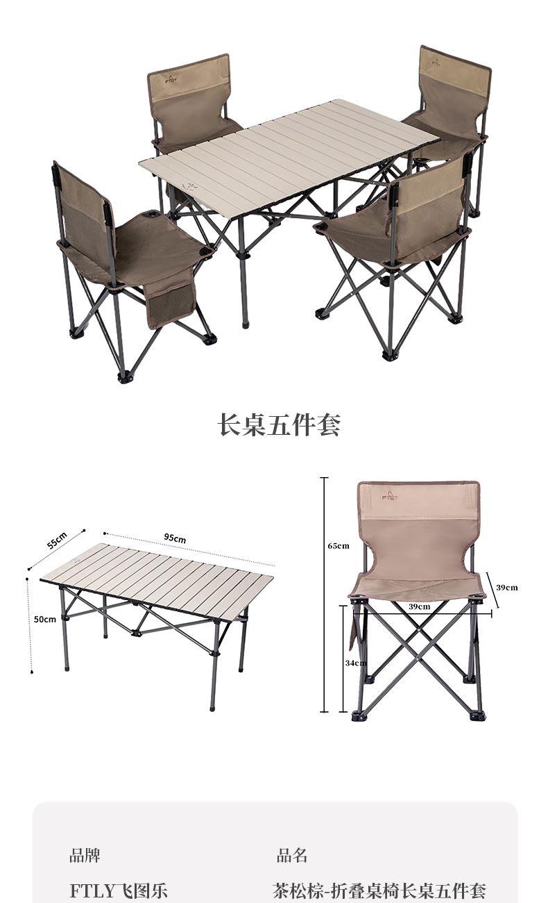 材质:600D双层牛津布 +镀锌合计钢管 商品颜色:茶松棕 商品规格:五件套(一桌四椅) 桌子尺寸:95*55*50cm 椅子尺寸:65*39*39cm 商品重量:10kg 商品承重:120kg 需要同款长桌三件套一桌两椅的,可以联系我司业务 1、升级合金钢加长桌面,防水耐腐蚀; 2、加大号便携折叠椅,久坐不累; 3、一桌多椅,折叠收纳,不占空间 ; 4、高承重,高负荷,舒适享受; 5、轻奢配色,贴近自然;