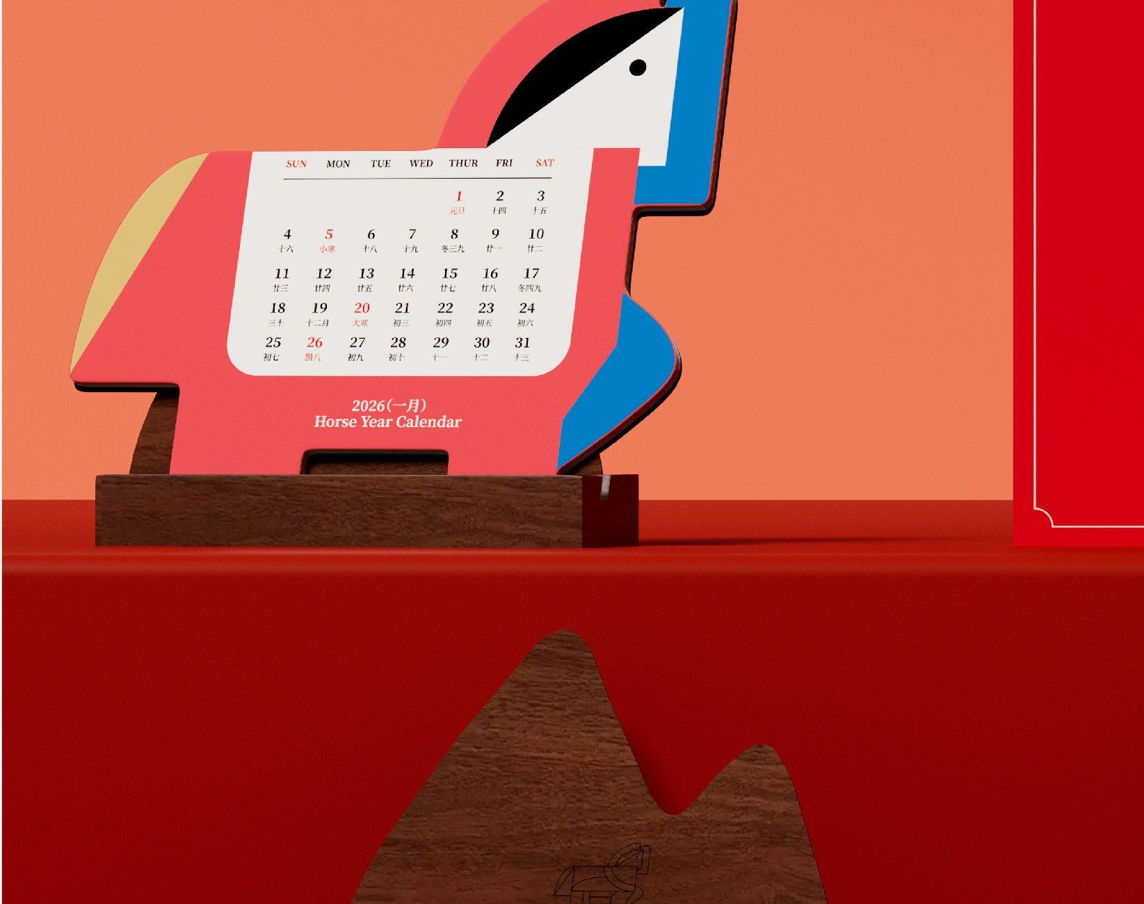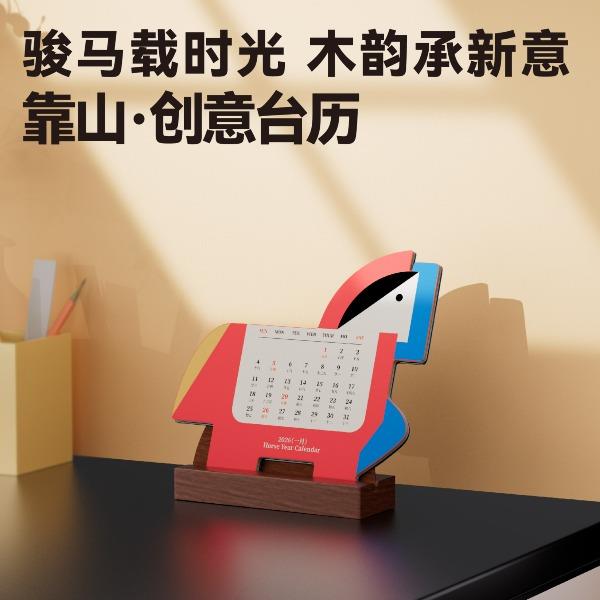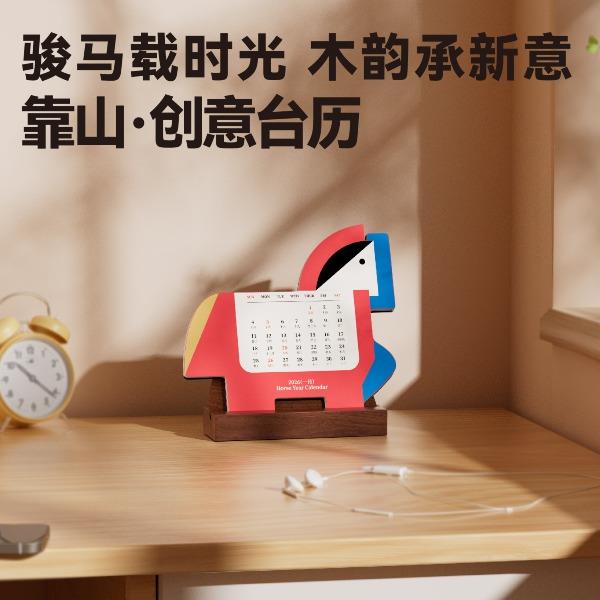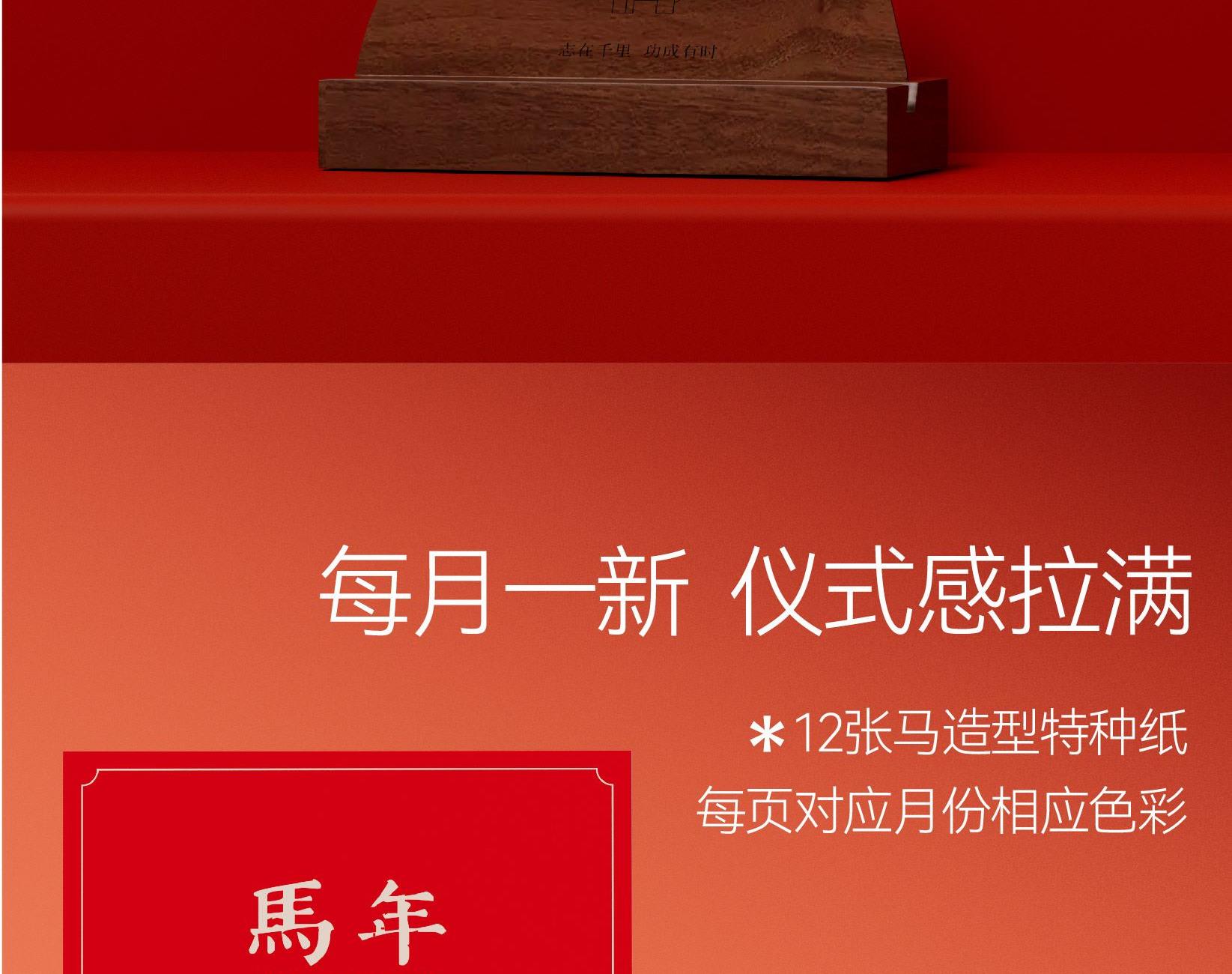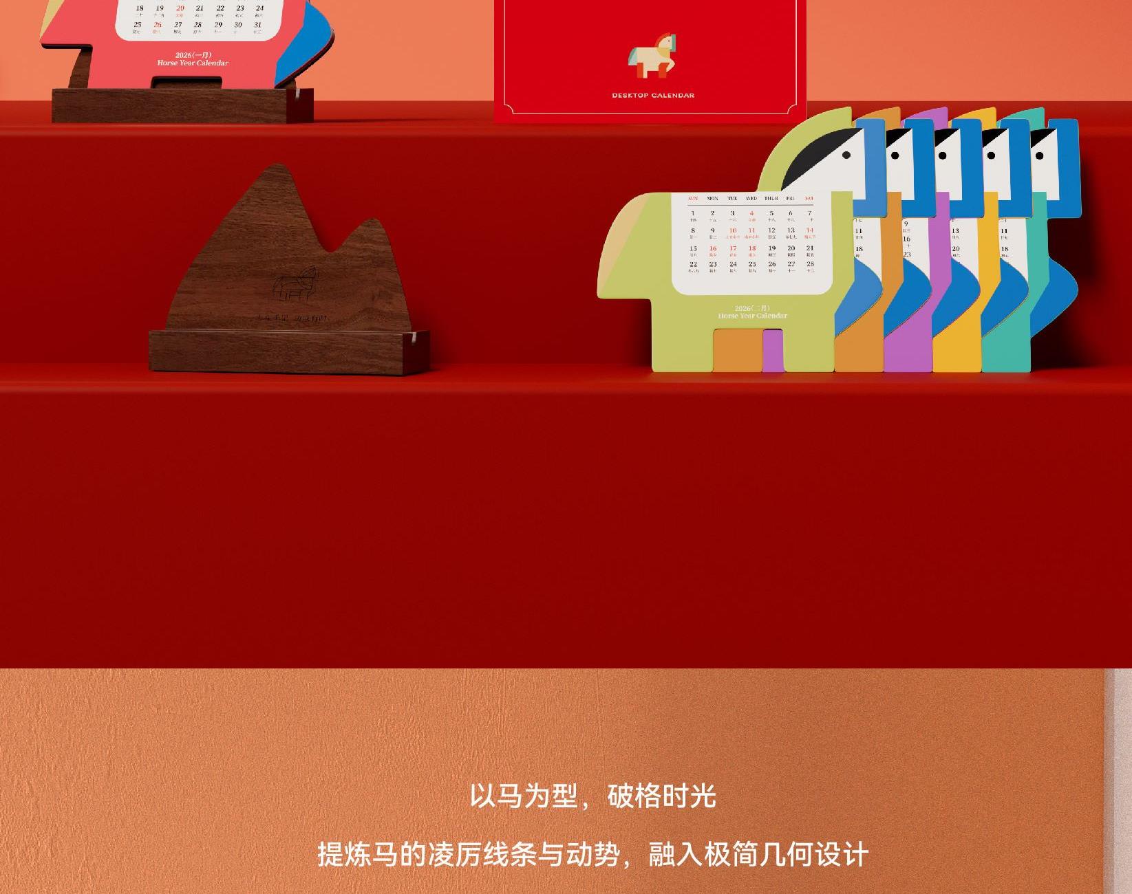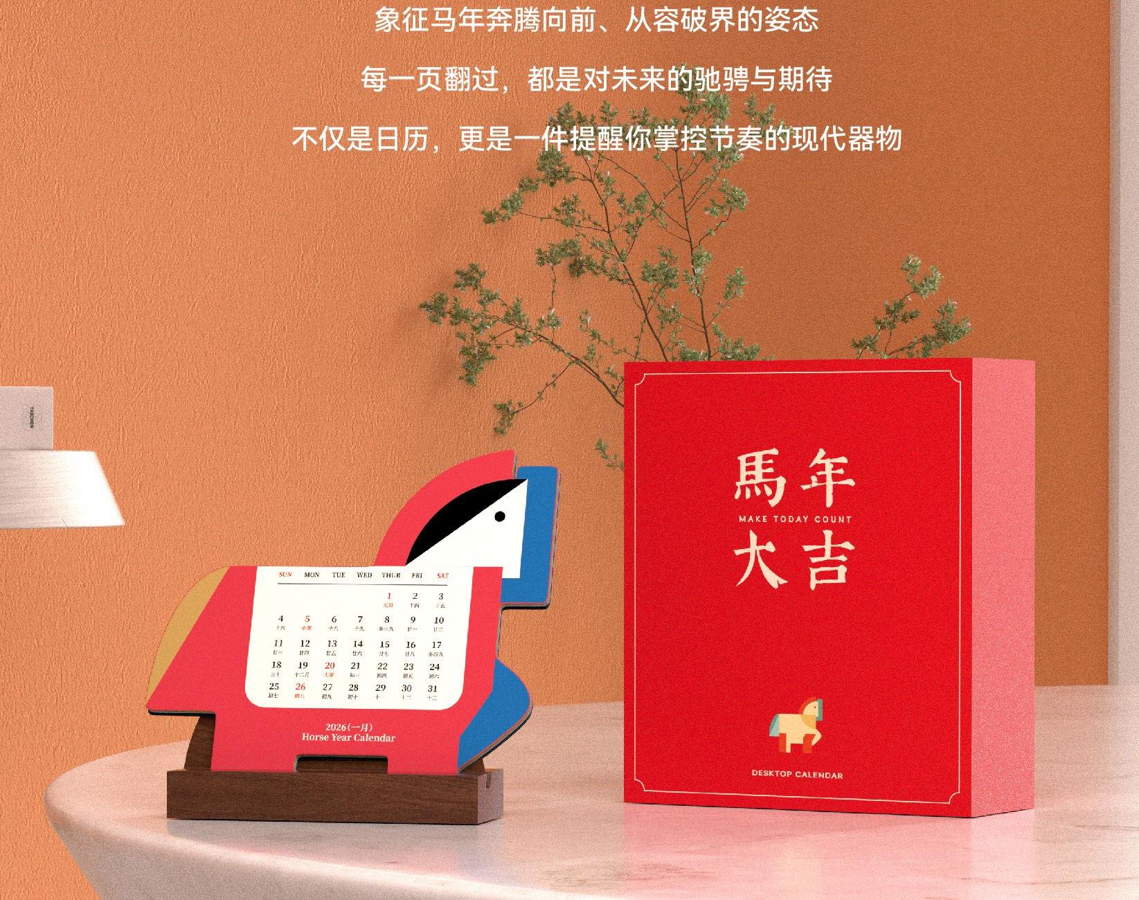 以马为型,破格时光。提炼马的凌厉线条与动势,融入极简几何设计。 象征马年奔腾向前、从容破界的姿态。每一页翻过,都是对未来的驰骋与期待。不仅是日历,更是一件提醒你掌控节奏的现代器物。 内配:月历*1、胡桃木底座/手机支架*1 尺寸:月历-150x143mm 底座-100x55x35mm 背板-100x90mm 材质:月历-特种纸 底座-黑胡桃木 包装尺寸:154x134x60mm