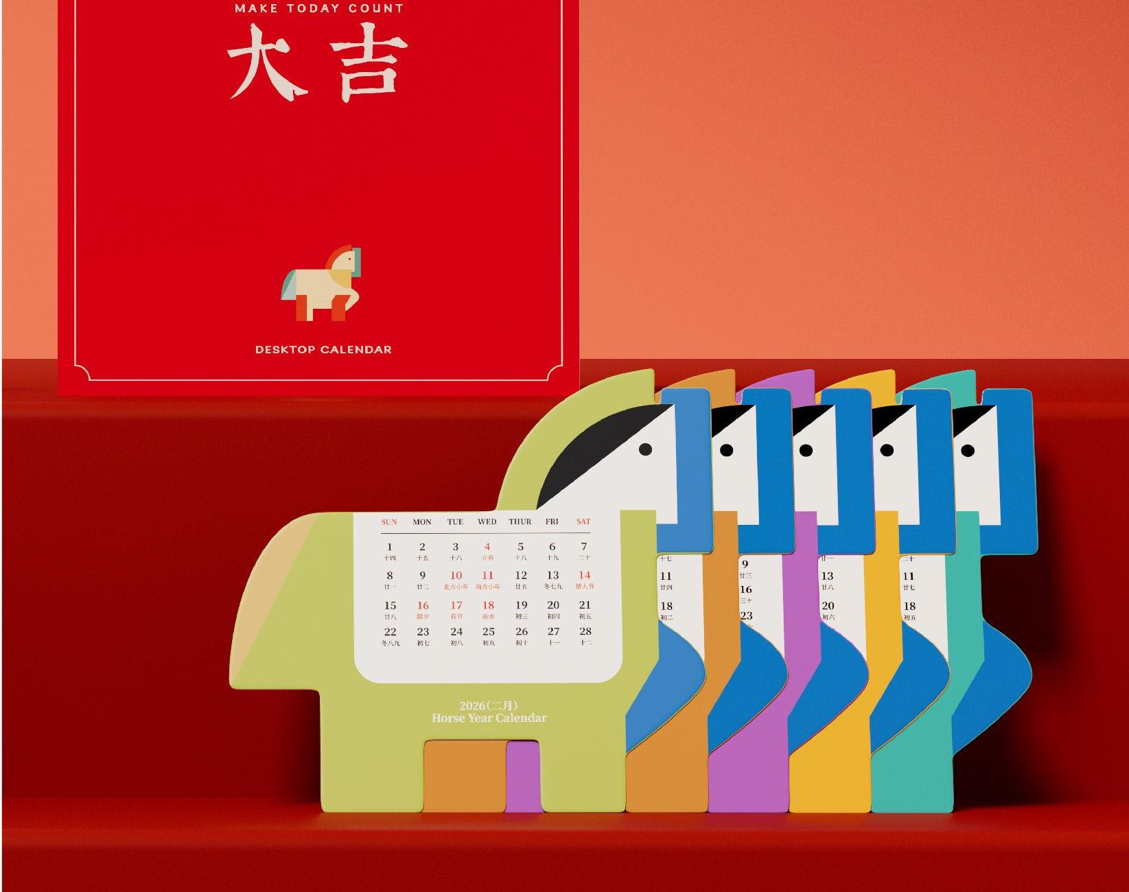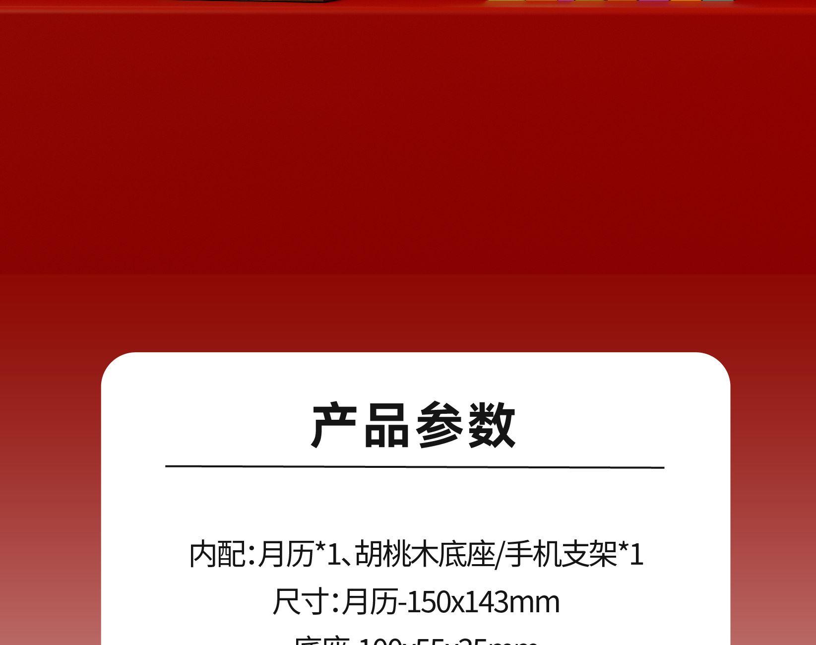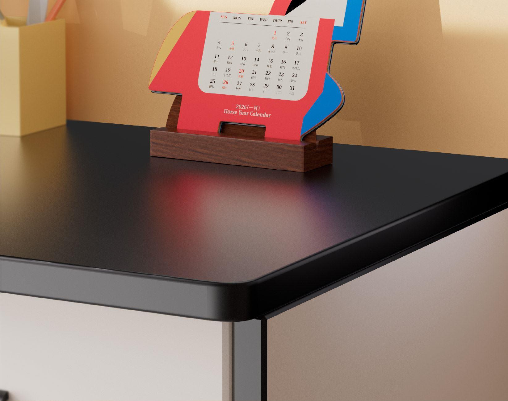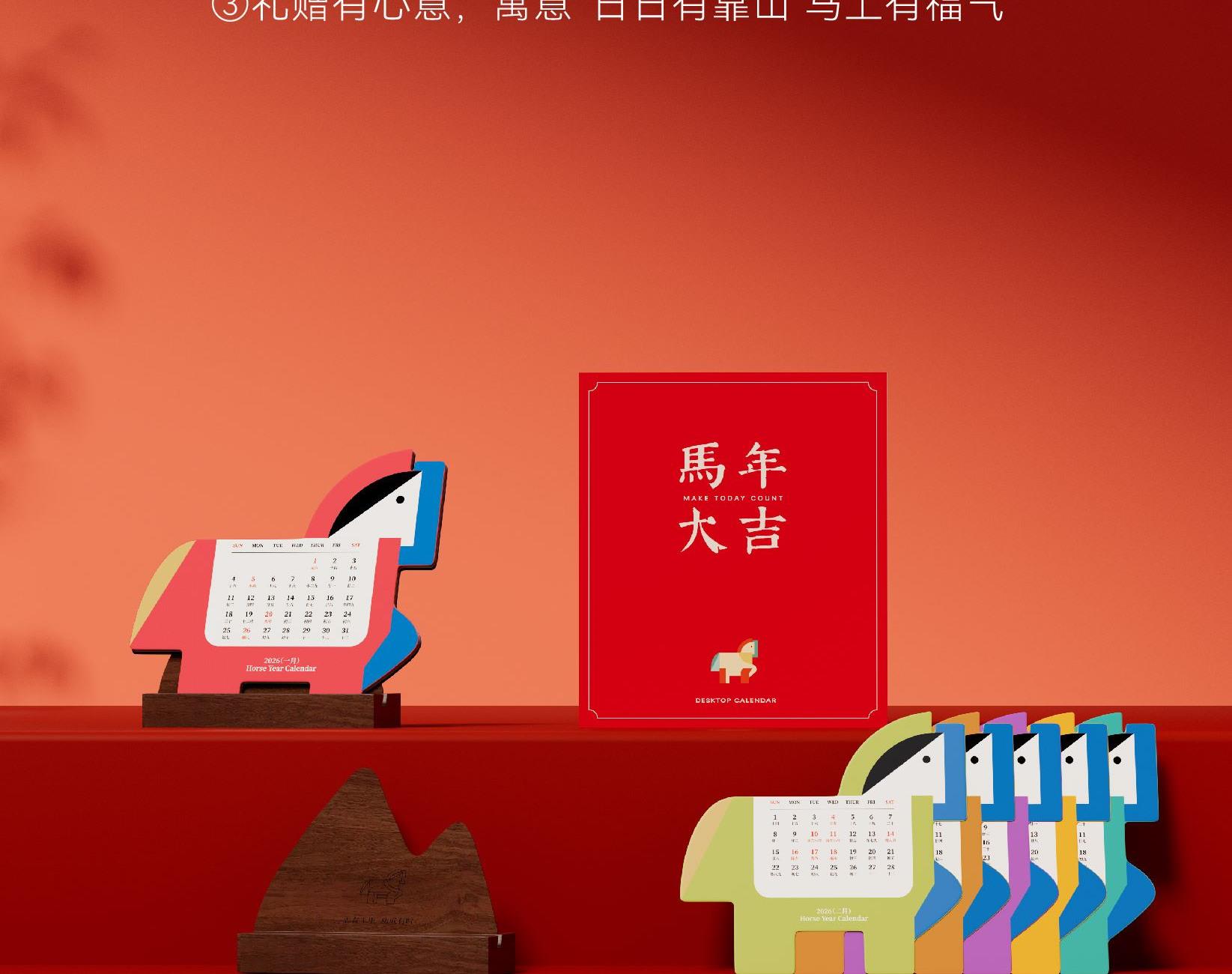 以马为型,破格时光。提炼马的凌厉线条与动势,融入极简几何设计。 象征马年奔腾向前、从容破界的姿态。每一页翻过,都是对未来的驰骋与期待。不仅是日历,更是一件提醒你掌控节奏的现代器物。 内配:月历*1、胡桃木底座/手机支架*1 尺寸:月历-150x143mm 底座-100x55x35mm 背板-100x90mm 材质:月历-特种纸 底座-黑胡桃木 包装尺寸:154x134x60mm