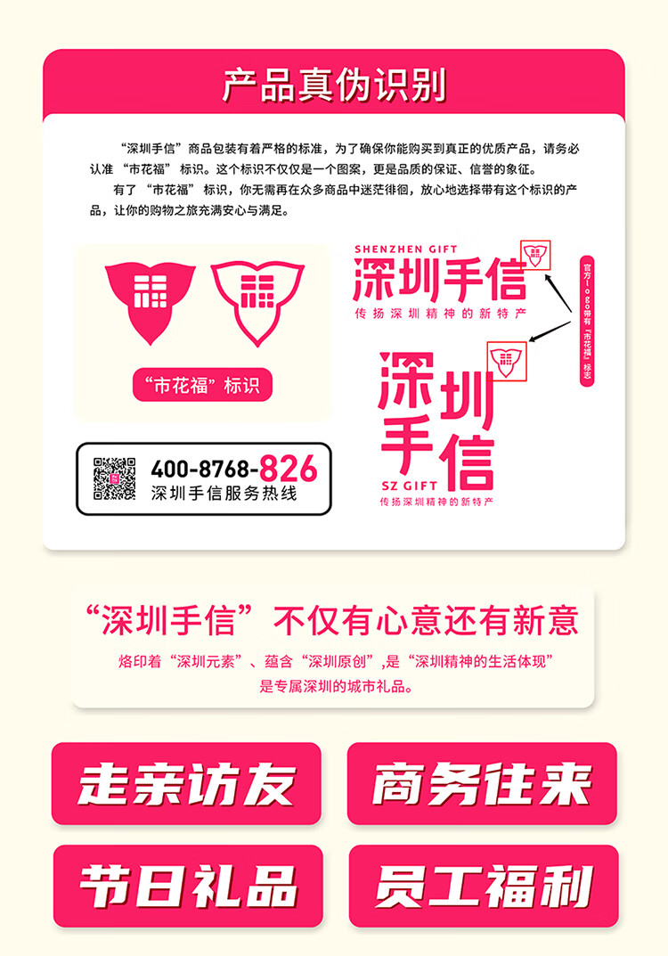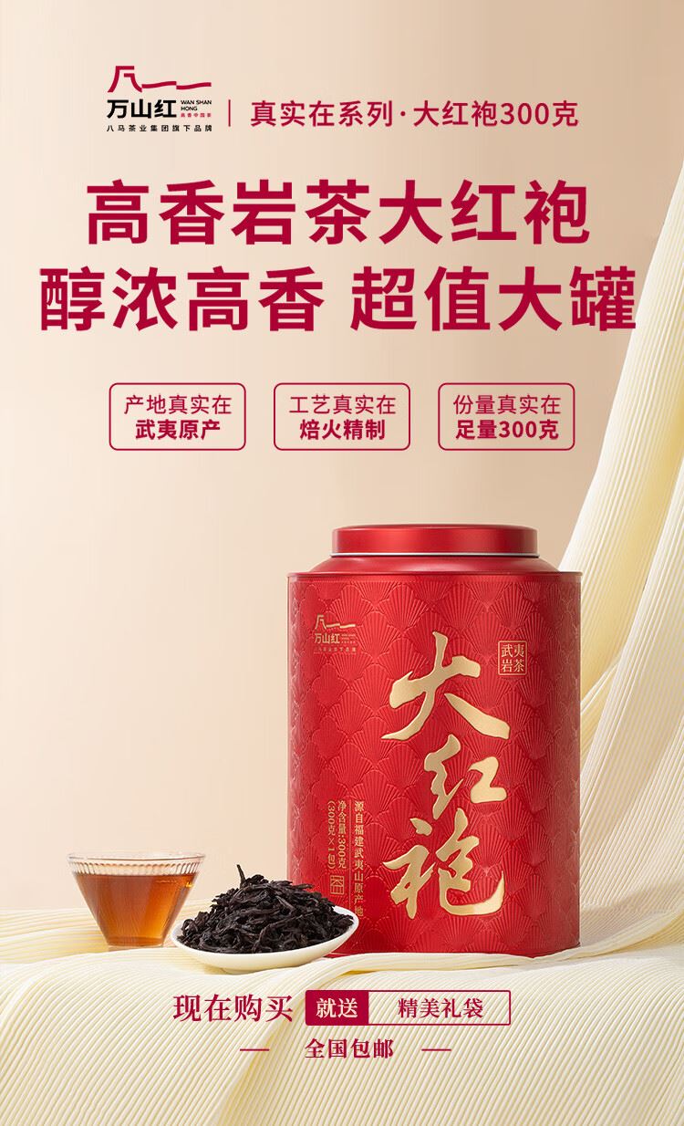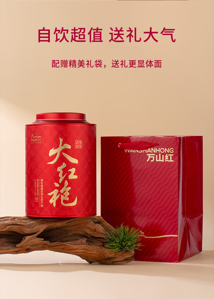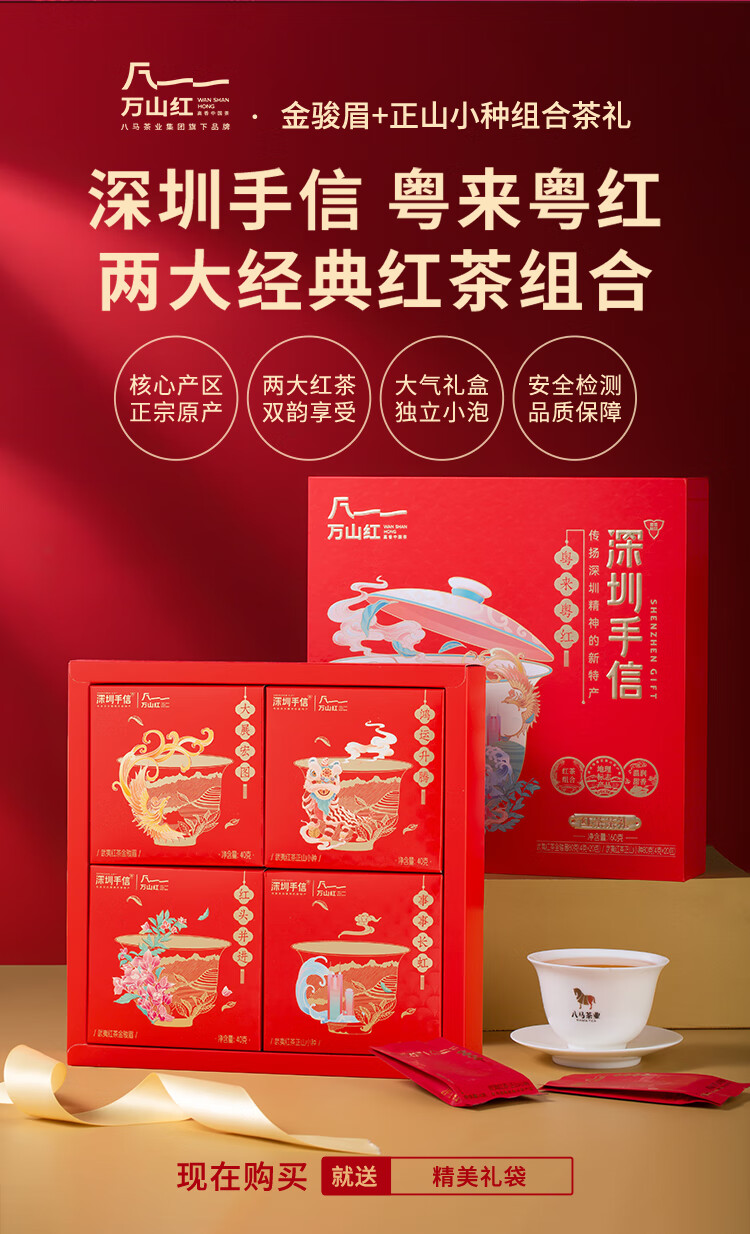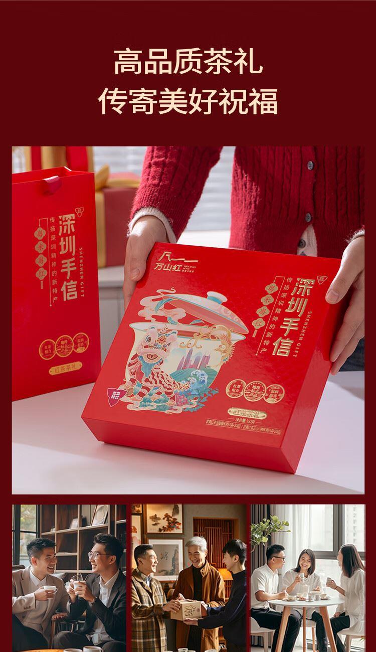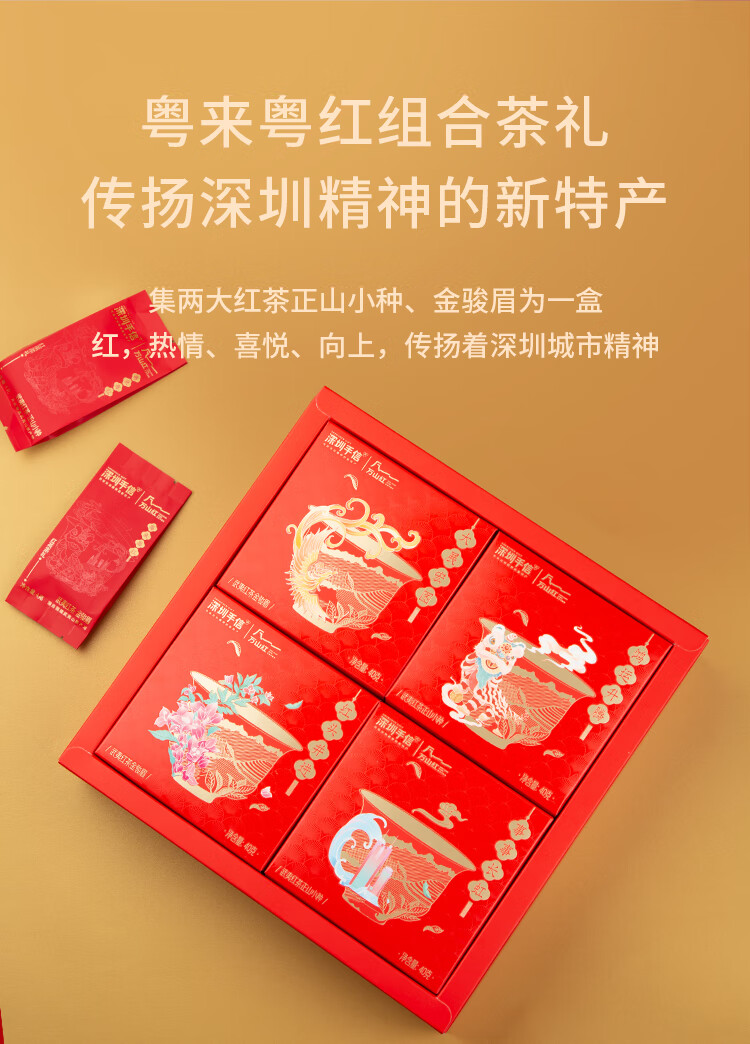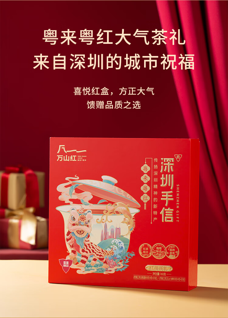 礼盒内配: 金骏眉4克X20包 正山小种4克X20包 净含量:160克 单罐内配: 大红袍300克 净含量:300克 推荐理由: 自饮一罐,送礼一盒 大红袍(罐装) - 产地工艺:源自福建武夷山原产地,采用传统焙火工艺,造就地道武夷岩茶品质。 - 口感品质:茶叶滋味醇浓,香气馥郁且耐泡,武夷原产保障正宗口感。 - 包装与场景:红色大罐包装,视觉喜庆且容量实在,适合自饮品鉴或日常赠礼。 深圳手信红茶茶礼(礼盒装) - 地域与文化:定位“深圳手信”,是传播深圳精神的新特产,包装融入岭南醒狮、深圳城市景观等元素,文化特色鲜明。 - 品类与品质:属于红茶组合礼,涵盖多类红茶,产自核心产区,经过安全检测,品质有保障。 - 包装与体验:大气礼盒设计,内置独立小泡,精致小巧且便于携带、冲泡,送礼彰显尊贵感,是展现深圳特色的优质伴手礼选择。