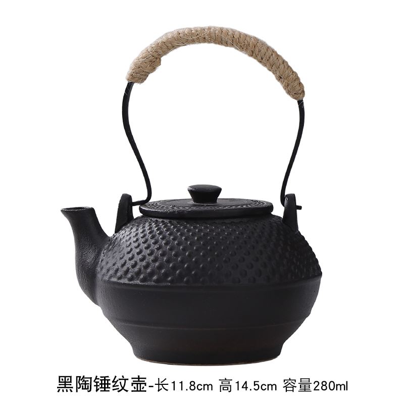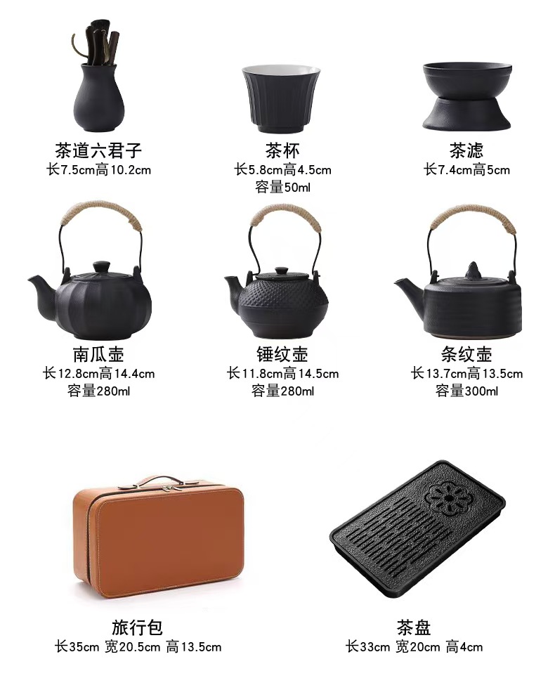 配制:1壶 6杯 1公道杯1茶托茶漏 1双层茶盘1茶巾茶夹 1旅行箱 规格:壶:14.5*11.8cm 材质:黑陶 工艺说明:表面有珍珠般细小颗粒,触感舒适。 手感细腻舒适,粗陶古朴厚重,别具风味。三种壶型,可自由选择。双层茶盘,大旅行箱,方便携带,实用美观性兼具。