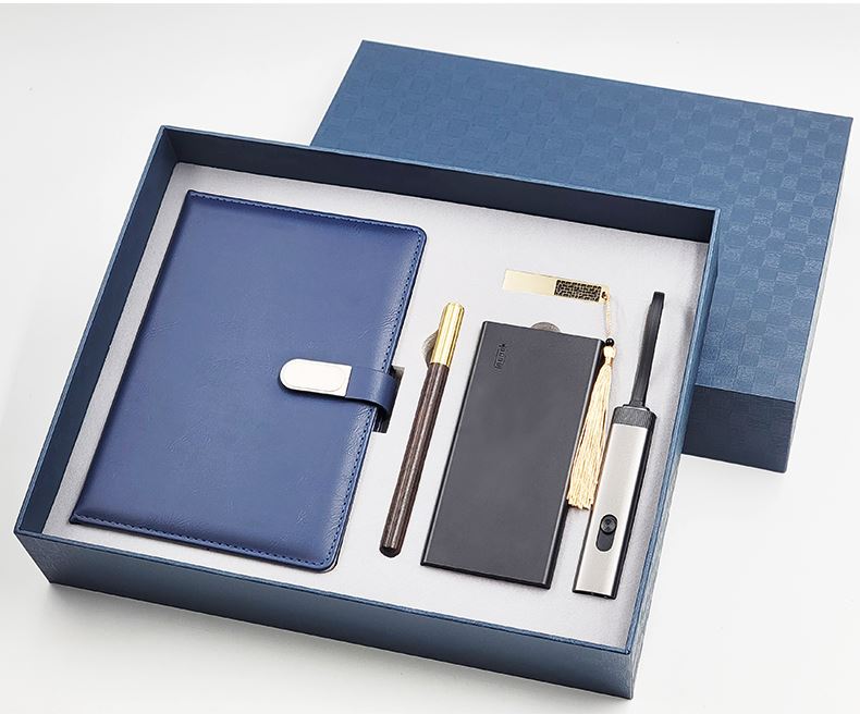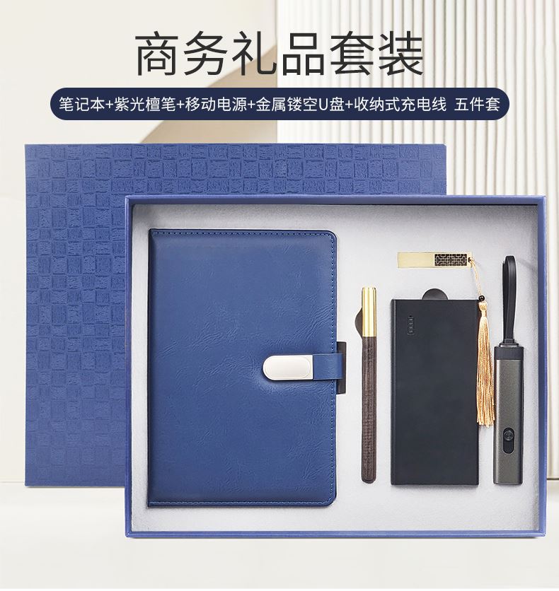A5搭扣硬皮PU皮笔记本 金属镂空16GU盘 紫光檀木笔 一拖三收纳式充电线 10000mAh移动电源 配精装礼盒+手提袋 包装盒尺寸:328x263x75mm 手提袋尺寸:335x293x85mm 重量:约30kg