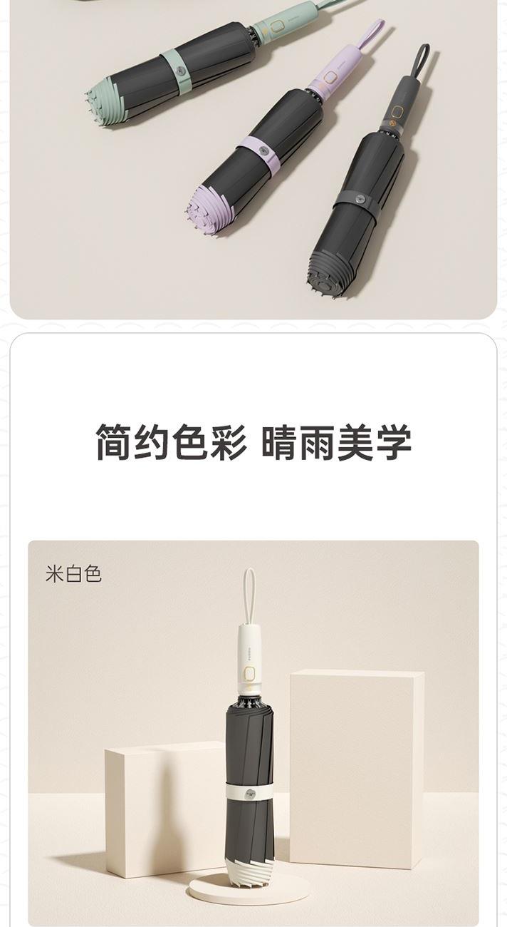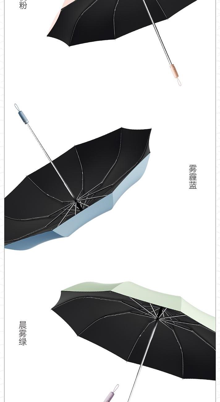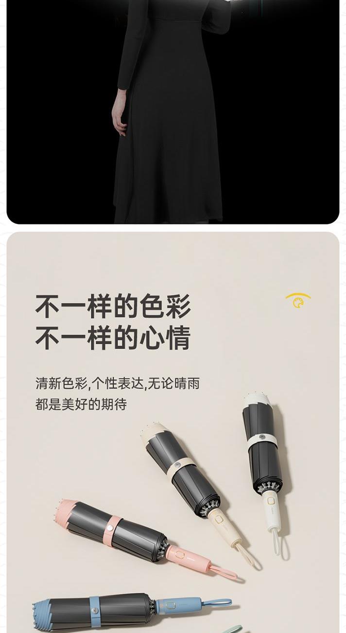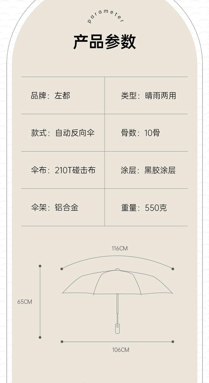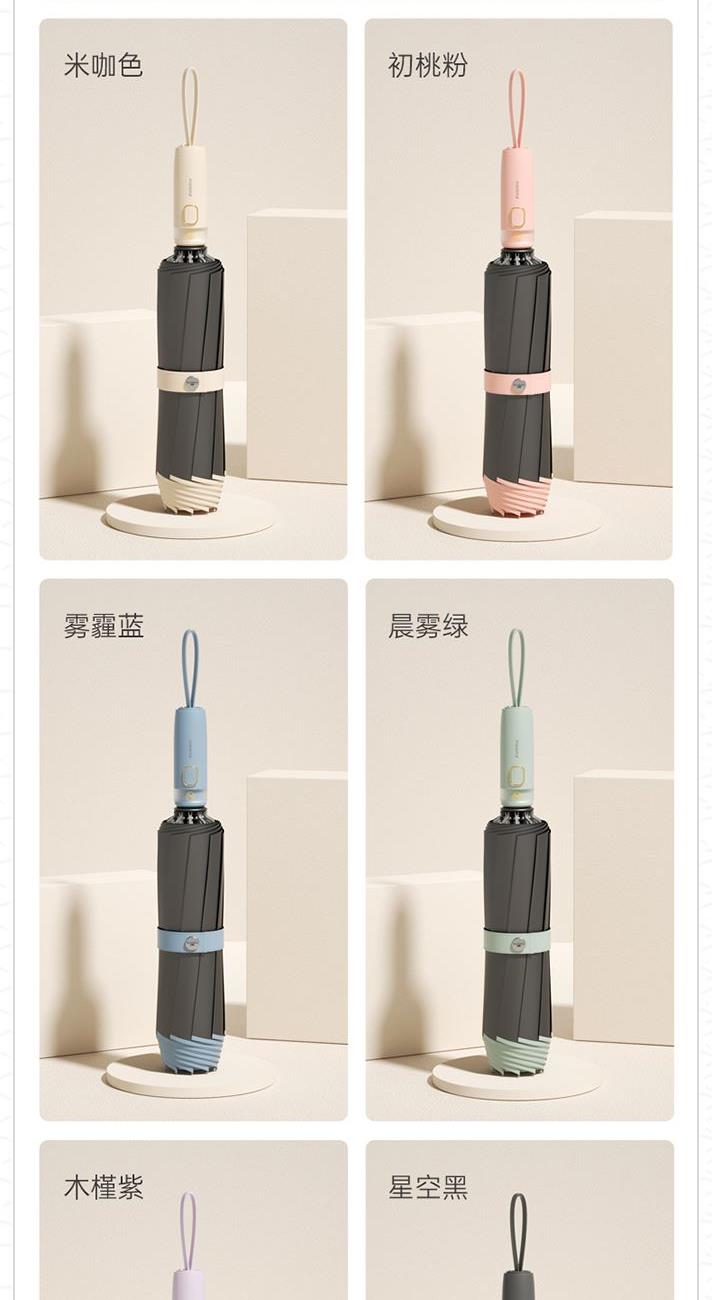 商品货号:ZD149 伞架材质:铝合金,玻纤,不锈钢中棒 伞面材质:280T抨击布 款式:全自动三折晴雨伞 商品参数:直径:105cm 高度:65cm 收拢直径:5cm 收拢高度:30cm 商品毛重:550 商品颜色:米咖色(黑胶) 雾霾蓝(黑胶)初桃粉(黑胶) 木槿紫(黑胶)米白色(黑胶) 晨雾绿(黑胶)星空黑(黑胶) 商品包装:本布伞套