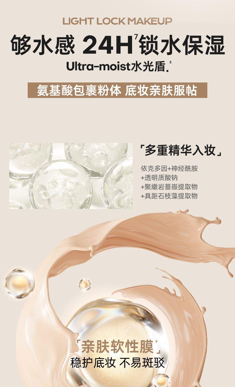 1、 奶霜质地 半透妆感 奶霜质地,绵密易铺展。定制色粉,修饰每寸肌肤,色粉表面干法处理工艺,更稳定和均匀,高倍柔焦肌肤。 2、 微米粉体 更加贴服 0.2—0.3微米级气流研磨球形粉末,亲油疏水粉体。防汗持妆,保持肌肤清爽细腻。 3、 高折光率油脂取代传统单一云母提亮 双重提亮,减少堵塞毛孔的同时,柔亮肌肤。 4、多重养护添加 风格守护美肌 依克多因搭配泛醇,修复肌肤屏障,舒敏。 虾青素搭配麦角硫因,高倍抗氧,对抗肌肤暗沉。 福瑞达玻尿酸搭配燕麦提取物,深度补充肌肤水分
