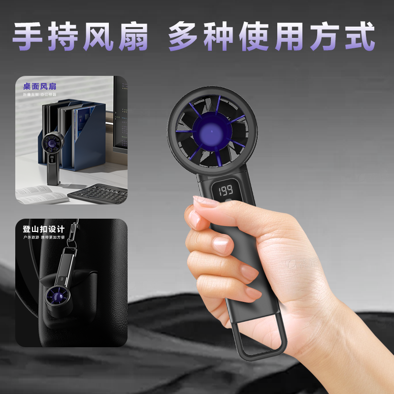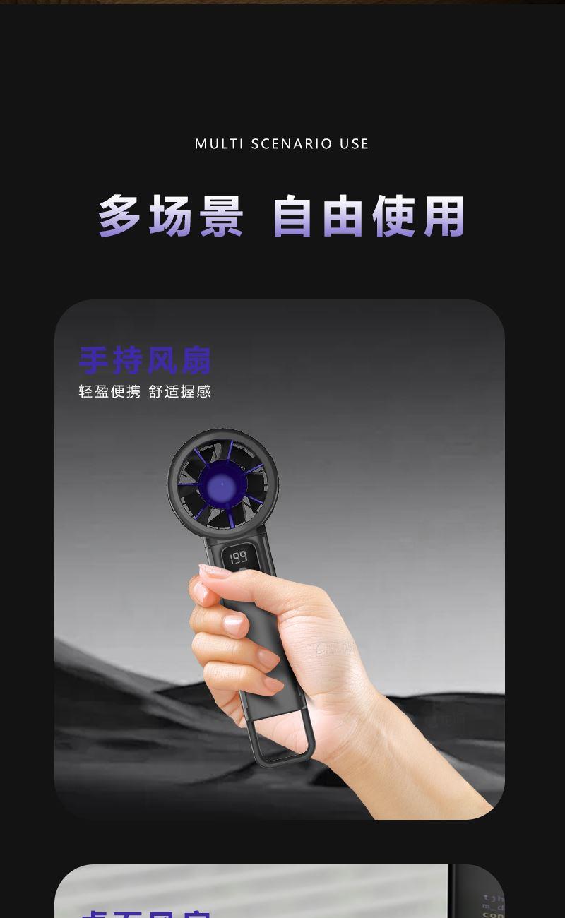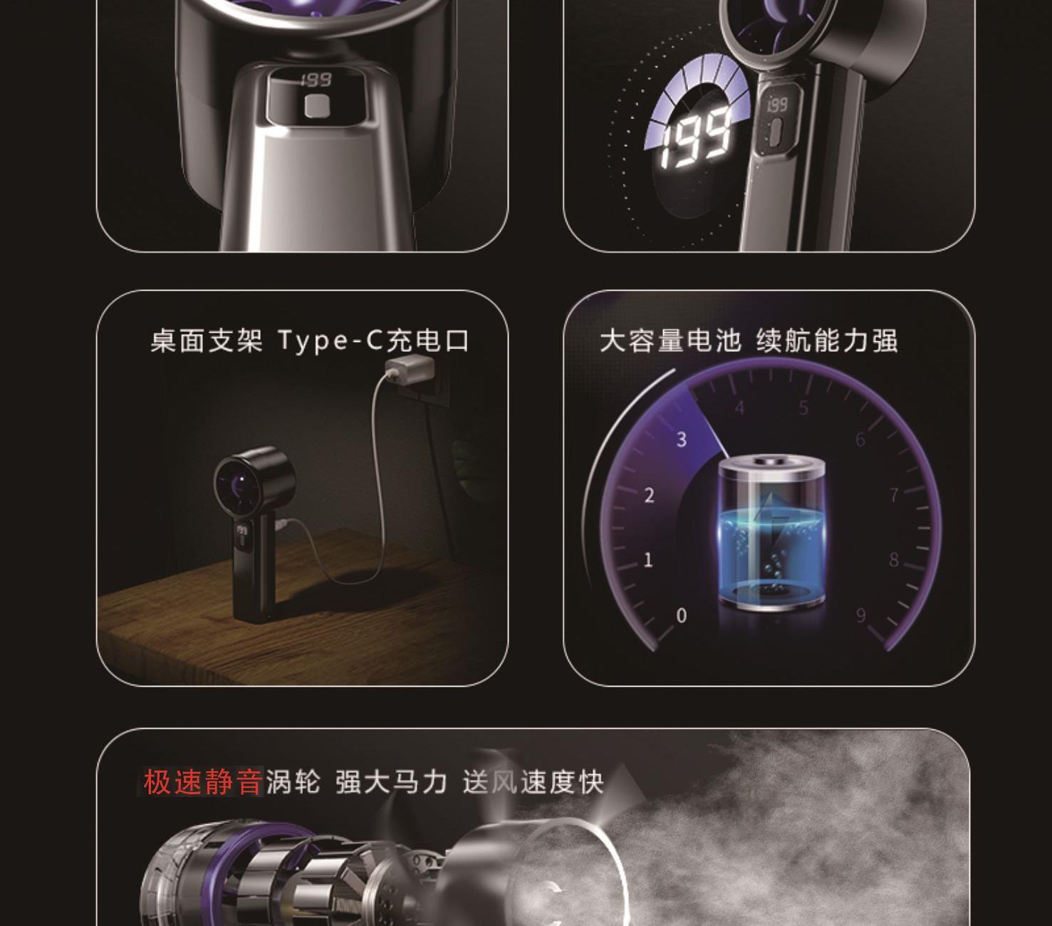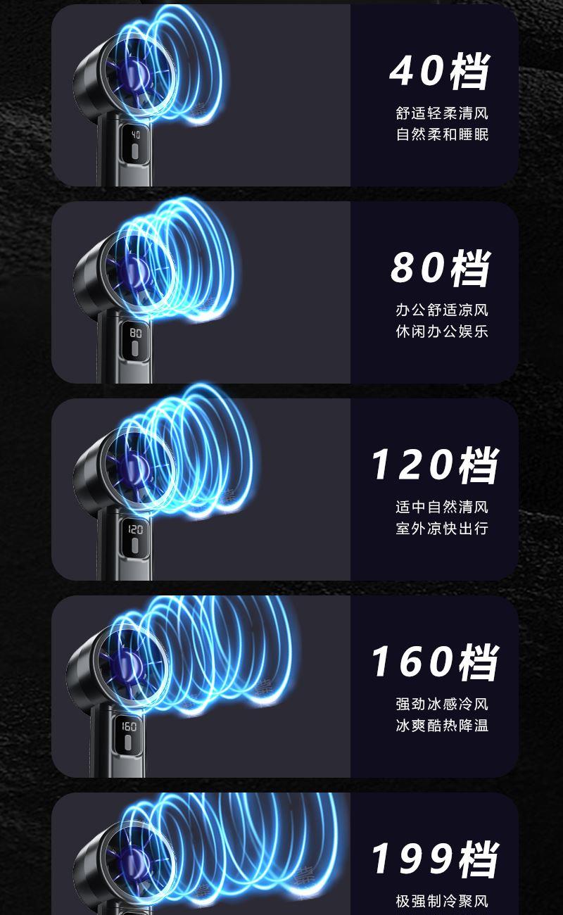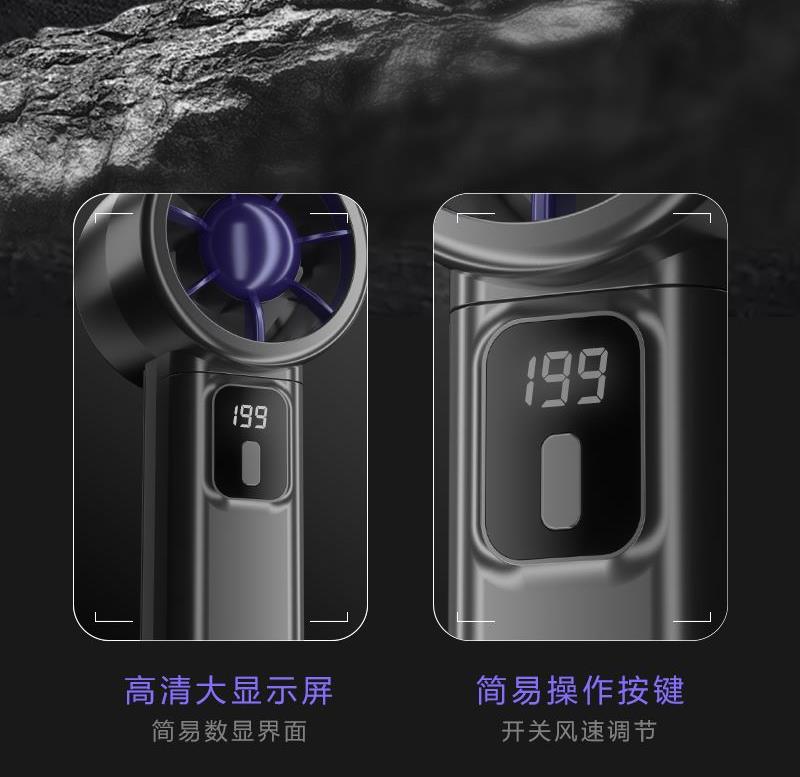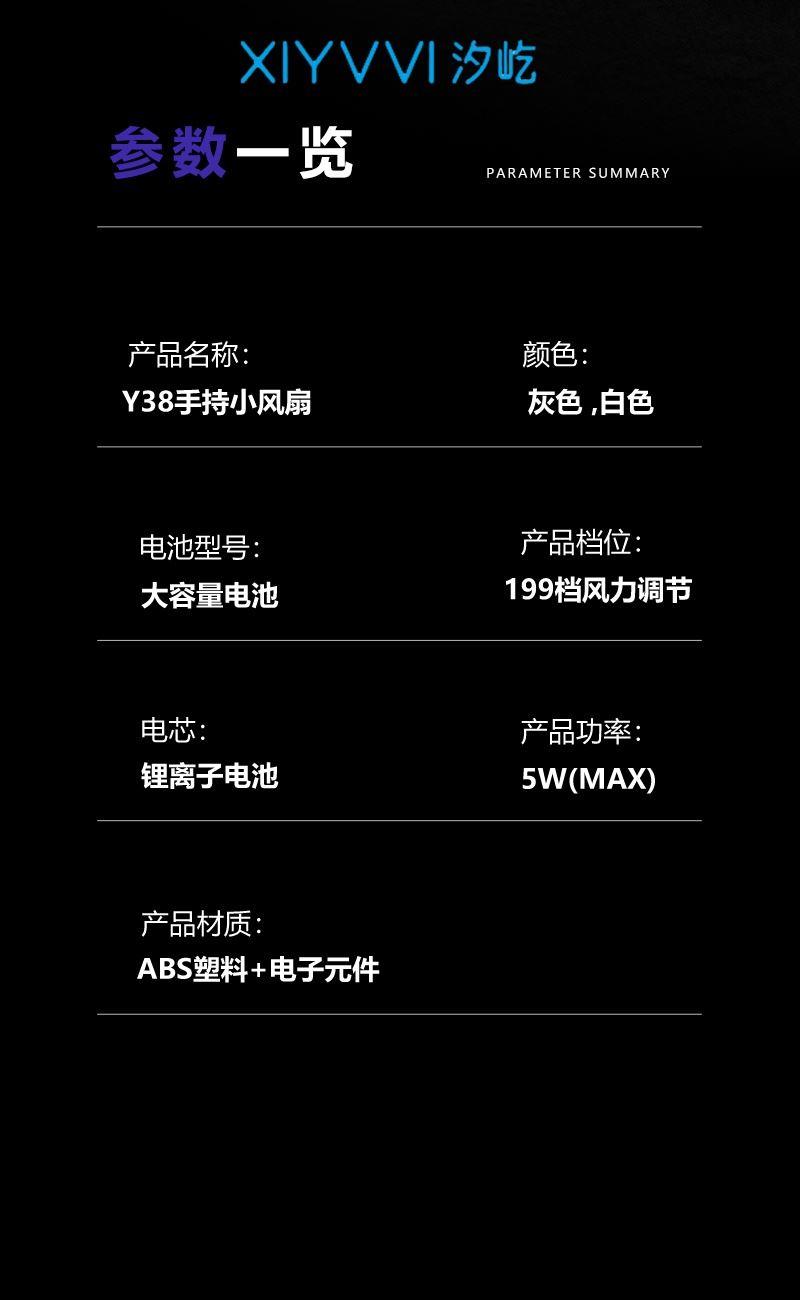 型号:Y38 电池容量:1200mAh 输入:5V-1A 使用时间:约-3-7h 档位:199档 材质:ABS塑料+PC 产品尺寸:30*50*165mm 产品重量:约133g 产品颜色:灰色、黑色 产品包装尺寸:63*60*170mm(彩盒) 产品卖点:199档风力随心调节,无刷电机大风力,智能数显,超长续航多场景使用。