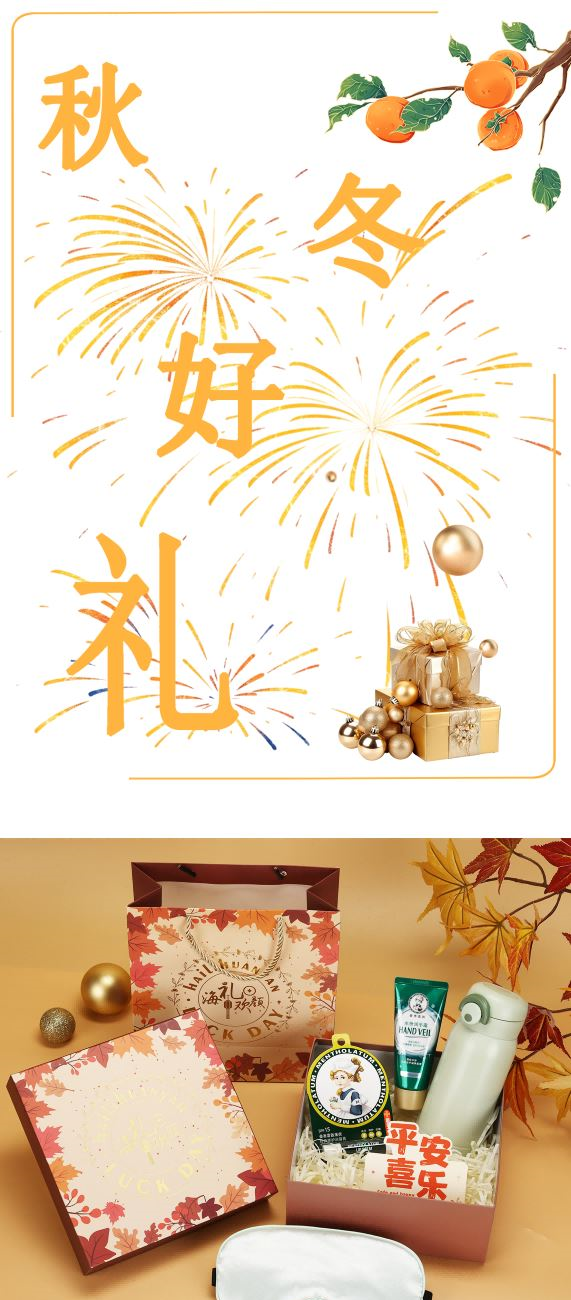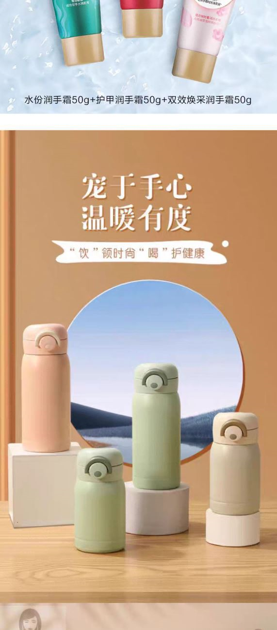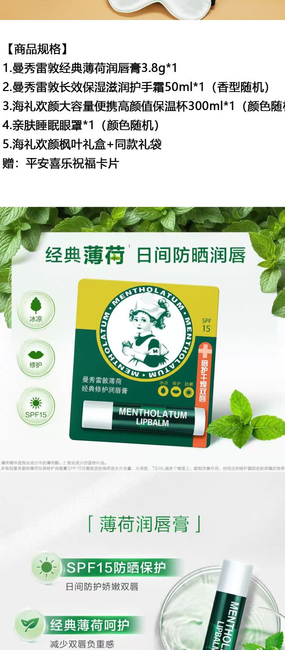1.曼秀雷敦经典薄荷润唇膏3.8g*1 2.曼秀雷敦长效保湿滋润护手霜50ml*1(香型随机) 3.海礼欢颜大容量便携高颜值保温杯300ml*1(颜色随机) 4.亲肤睡眠眼罩*1(颜色随机) 5.海礼欢颜枫叶礼盒+同款礼袋 赠:平安喜乐祝福卡片 这套产品包括曼秀雷敦经典薄荷润唇膏3.8g、长效保湿滋润护手霜50ml、海礼欢颜大容量便携高颜值保温杯300ml、亲肤睡眠眼罩和礼盒。产品涵盖保湿、防晒、护眼等方面,旨在为您打造舒适愉悦的生活方式。礼盒精美,适合送礼自用两相宜。