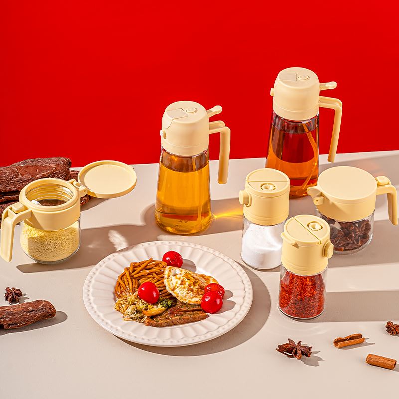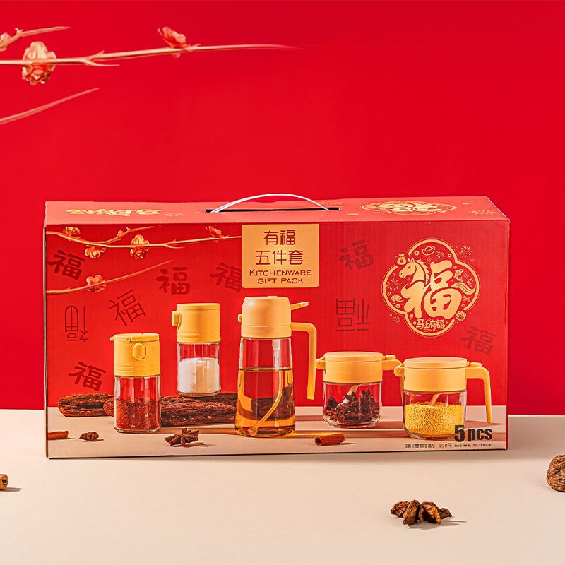 货号:A-YF/L5 有福五件套 规格:12套 组合:油壶*1(450ml)调味*2(330ml)调味瓶*2(190ml) 产品卖点: 一套在手,调味无忧,油壶设计精巧,倒油顺畅不挂油,轻松掌控用量,告别厨房油污烦恼。调味瓶密封性超棒,能有效防潮,保存香料、盐糖等调料不在话下。而且透明的瓶身搭配亮眼的黄色瓶盖,颜值超高,放在厨房瞬间增添温馨氛围。 彩盒尺寸:37*13*18.5CM 外箱尺寸:53.2X38.2X57.9CM 重量:15.8KG